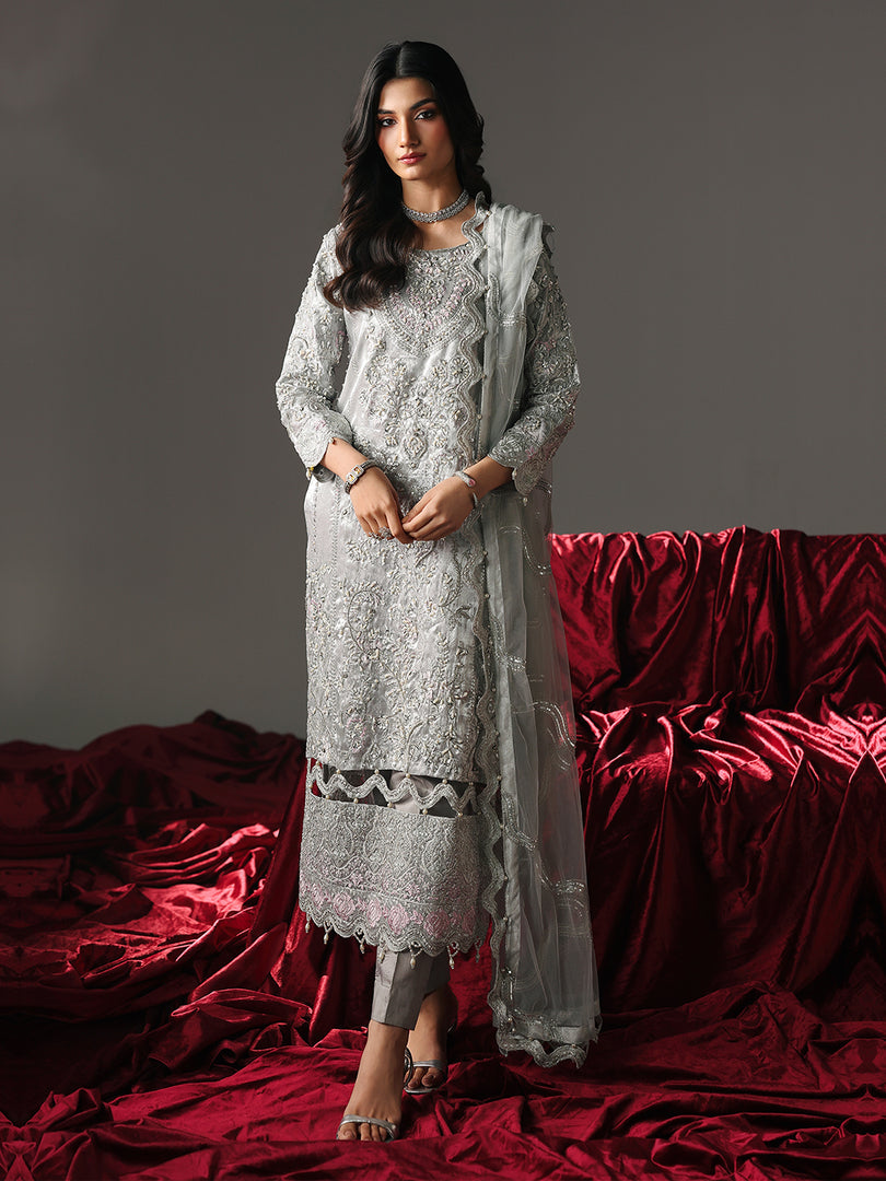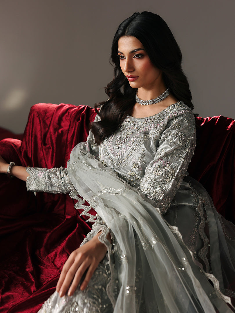 Net dupatta, this ensemble is elevated with sequin embroidery, luxurious pearls, and elegant scalloped borders.