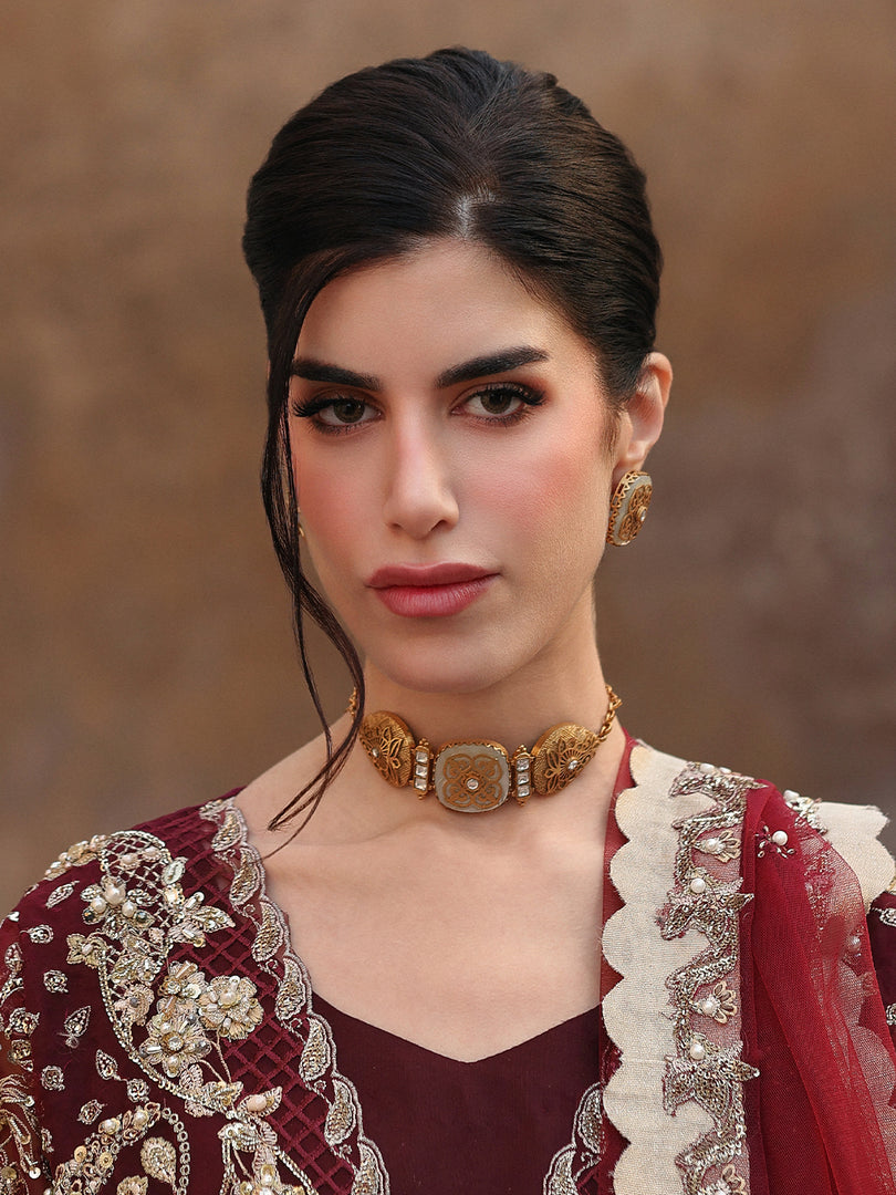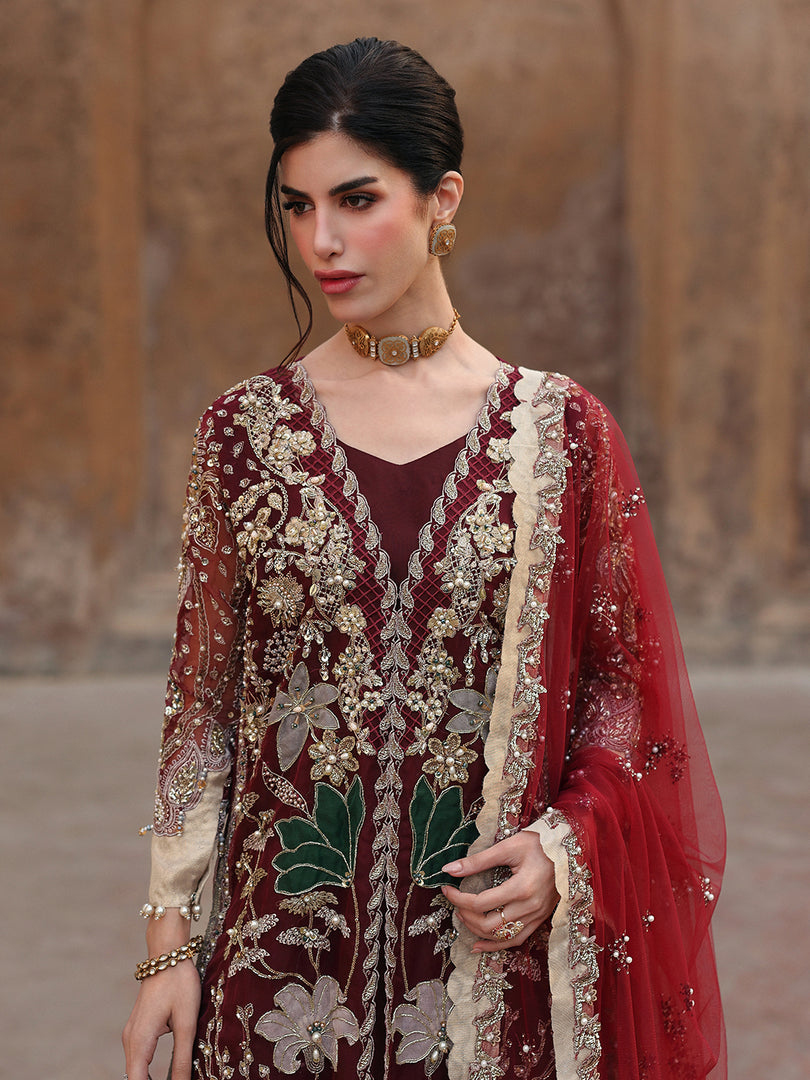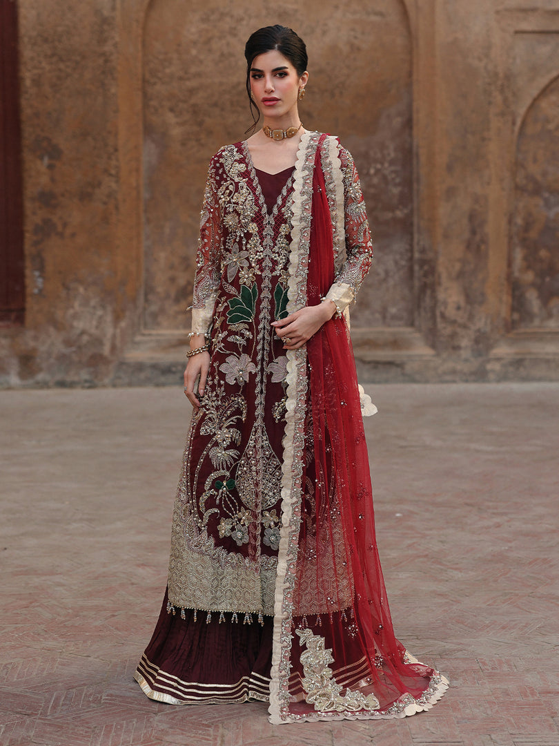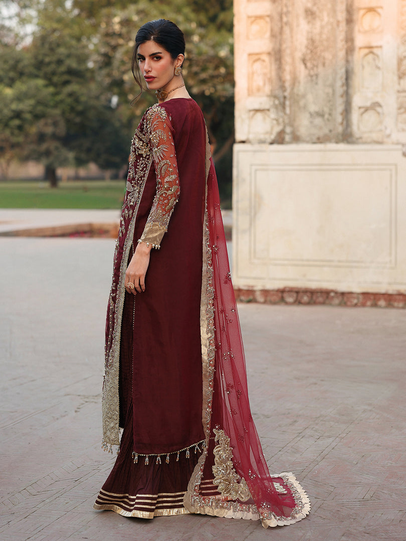 Paired with a viscose panel crushed shararah, enhanced with elegant lace detailing.
