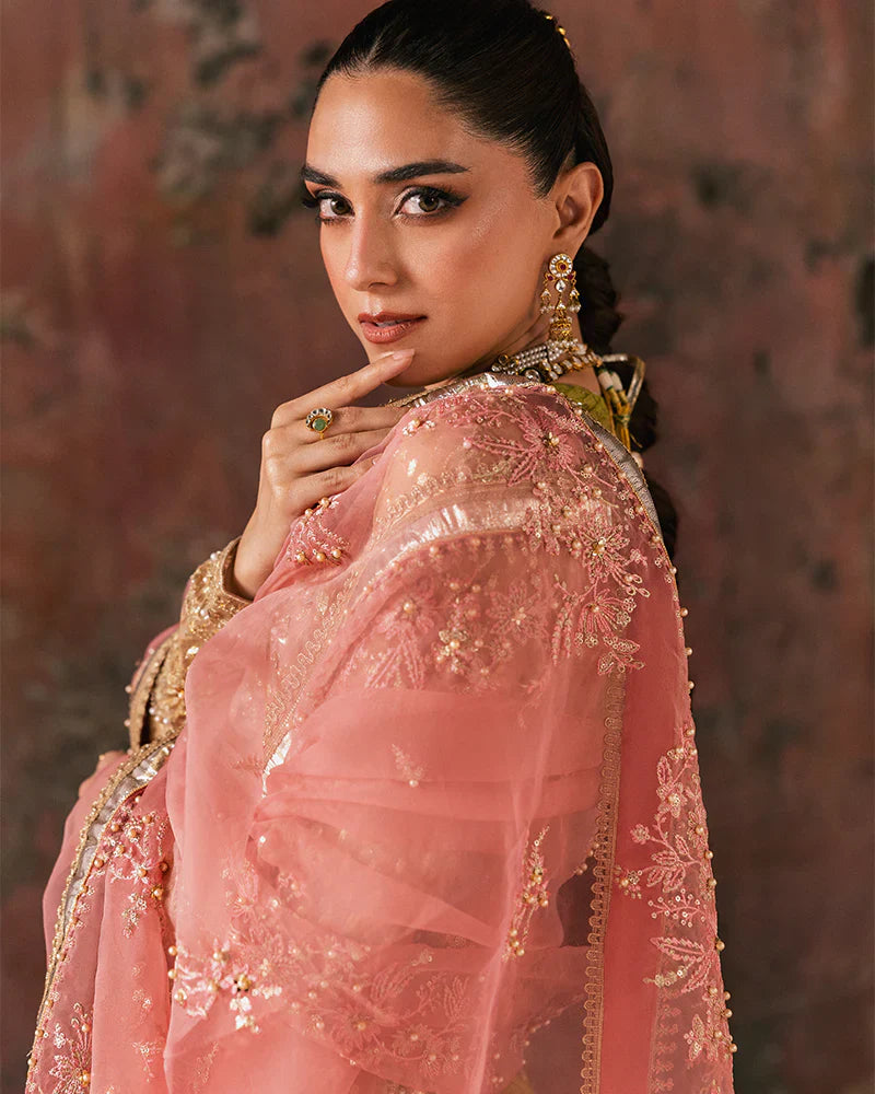 Organza dupatta, a vision of elegance with its tilla embroidery, pearl embellishments, and exquisite laces and tassels