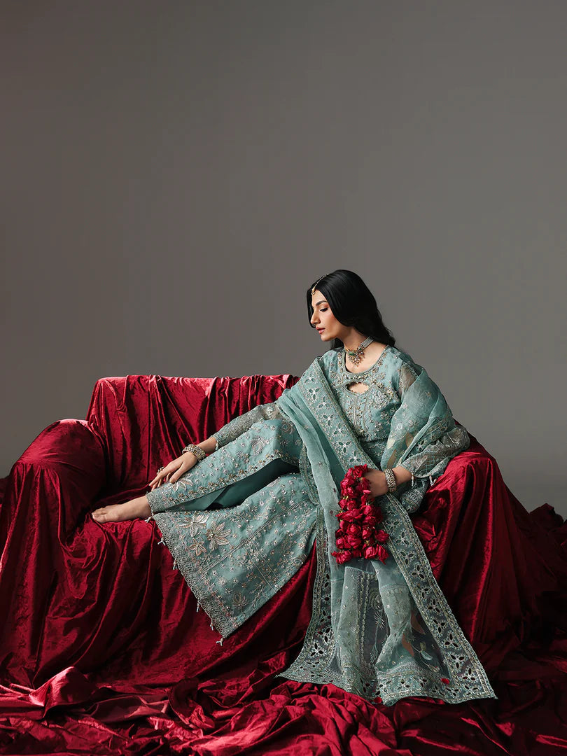 Net dupatta, this ensemble is elevated with sequin embroidery, luxurious pearls, and elegant scalloped borders.