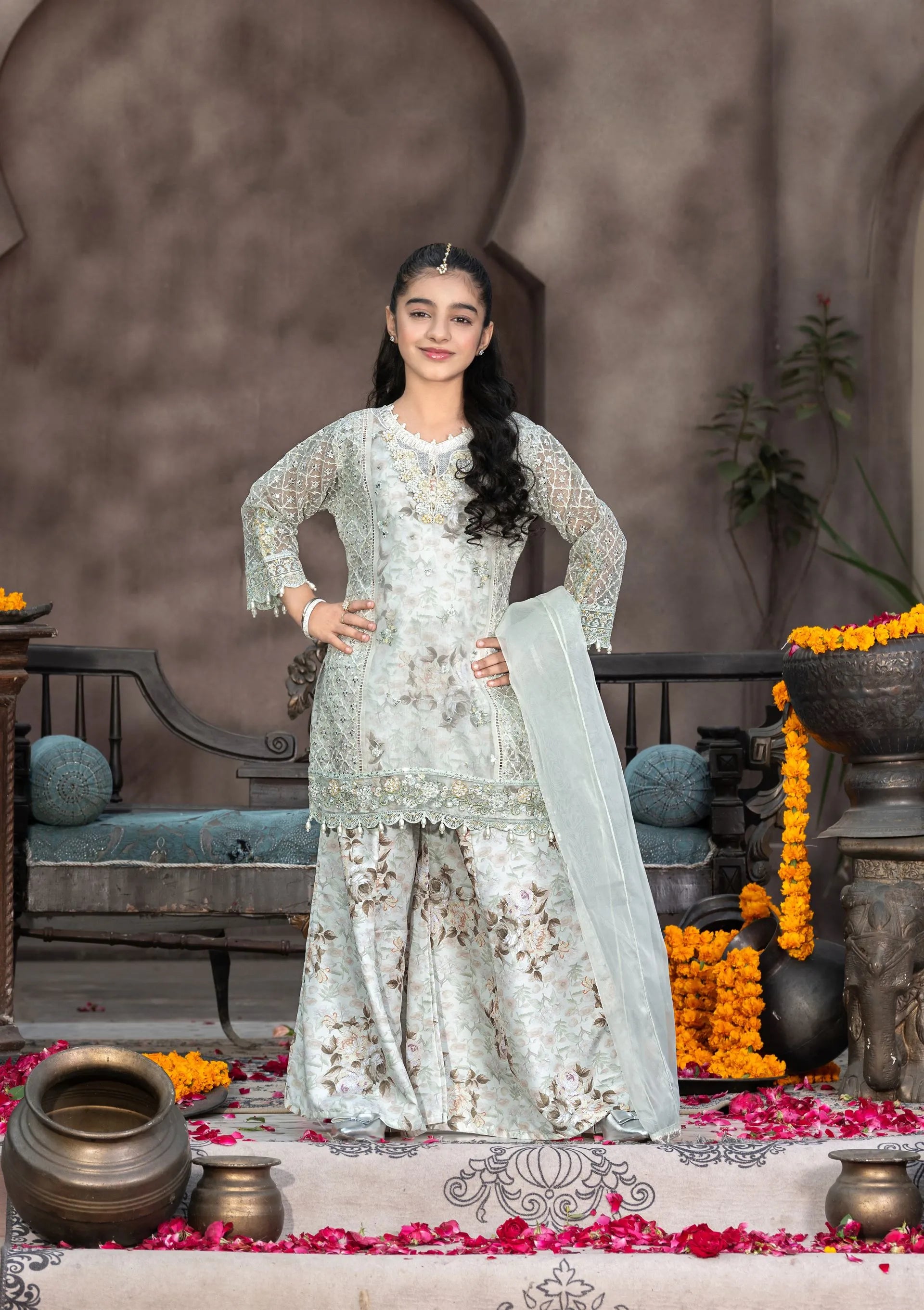 1-Organza shirt featuring sequin embroidery with meticulously hand-composed adda work, complemented by an attached viscose digital print inner