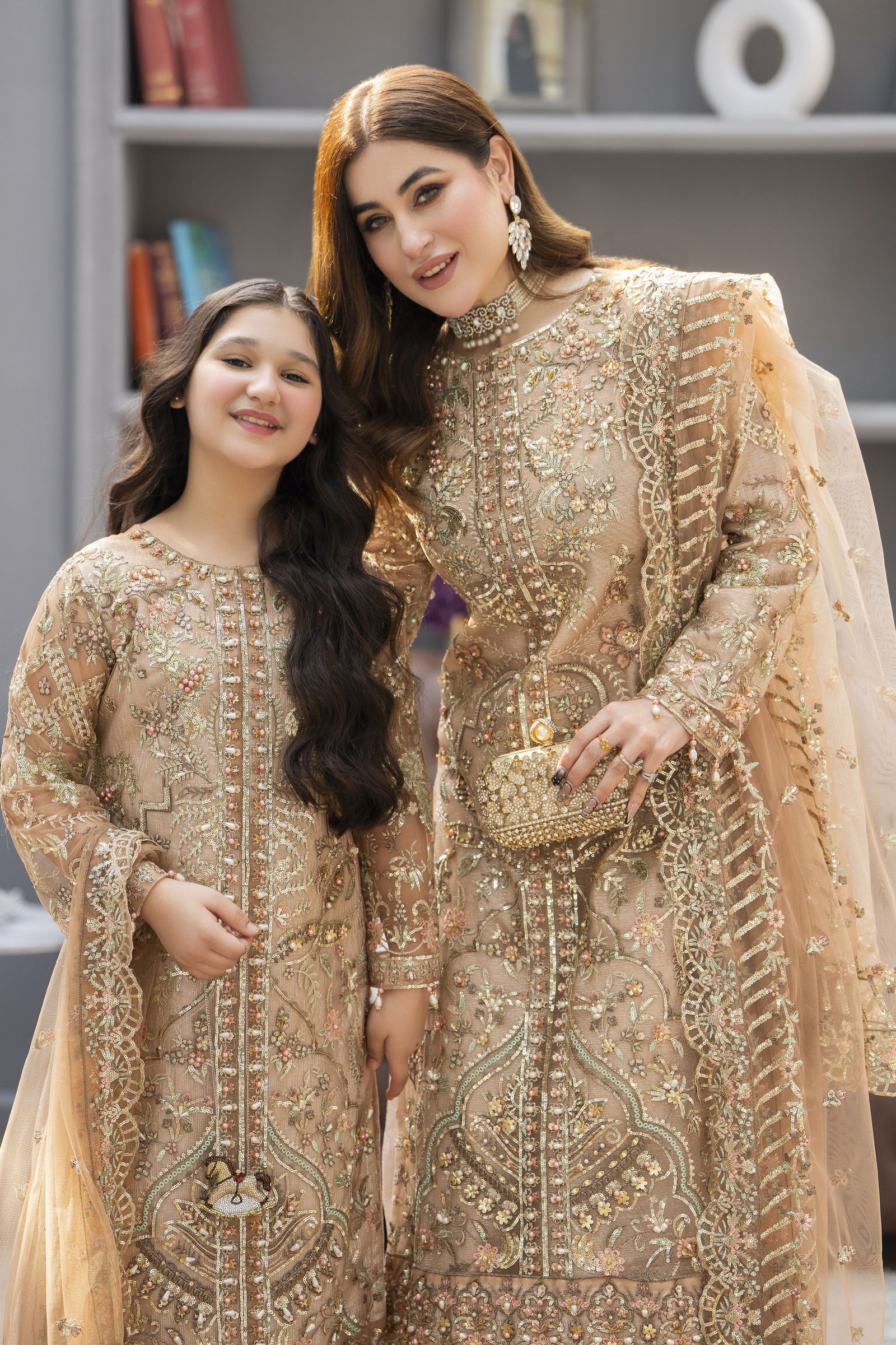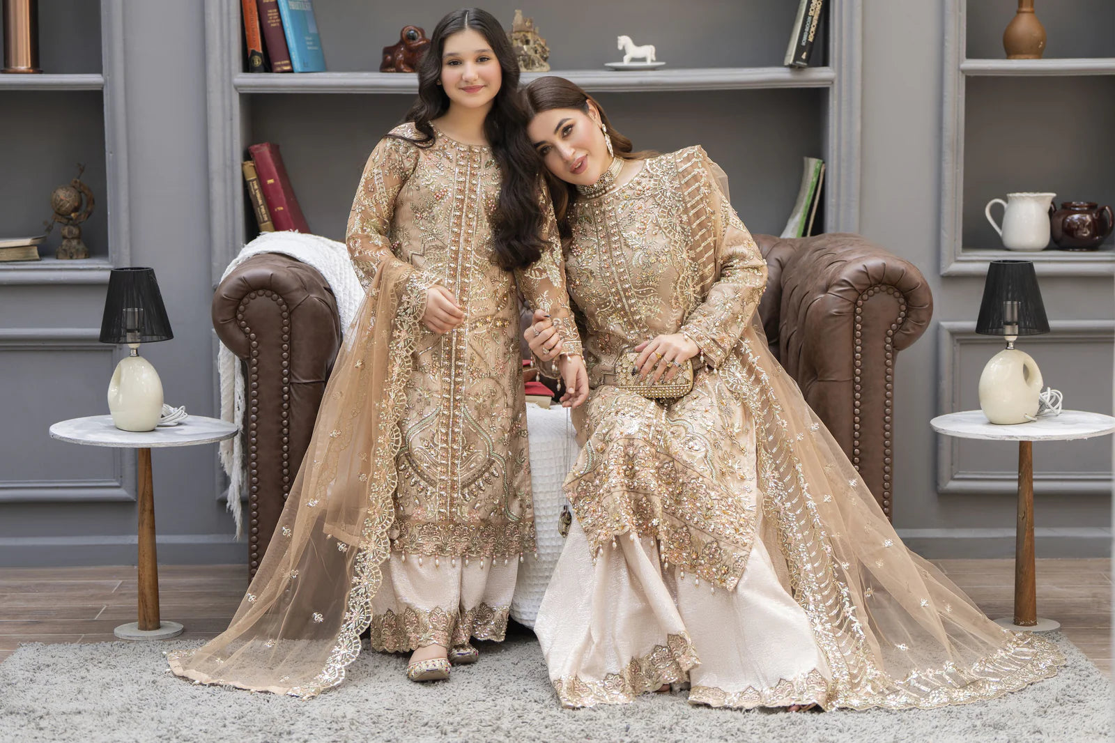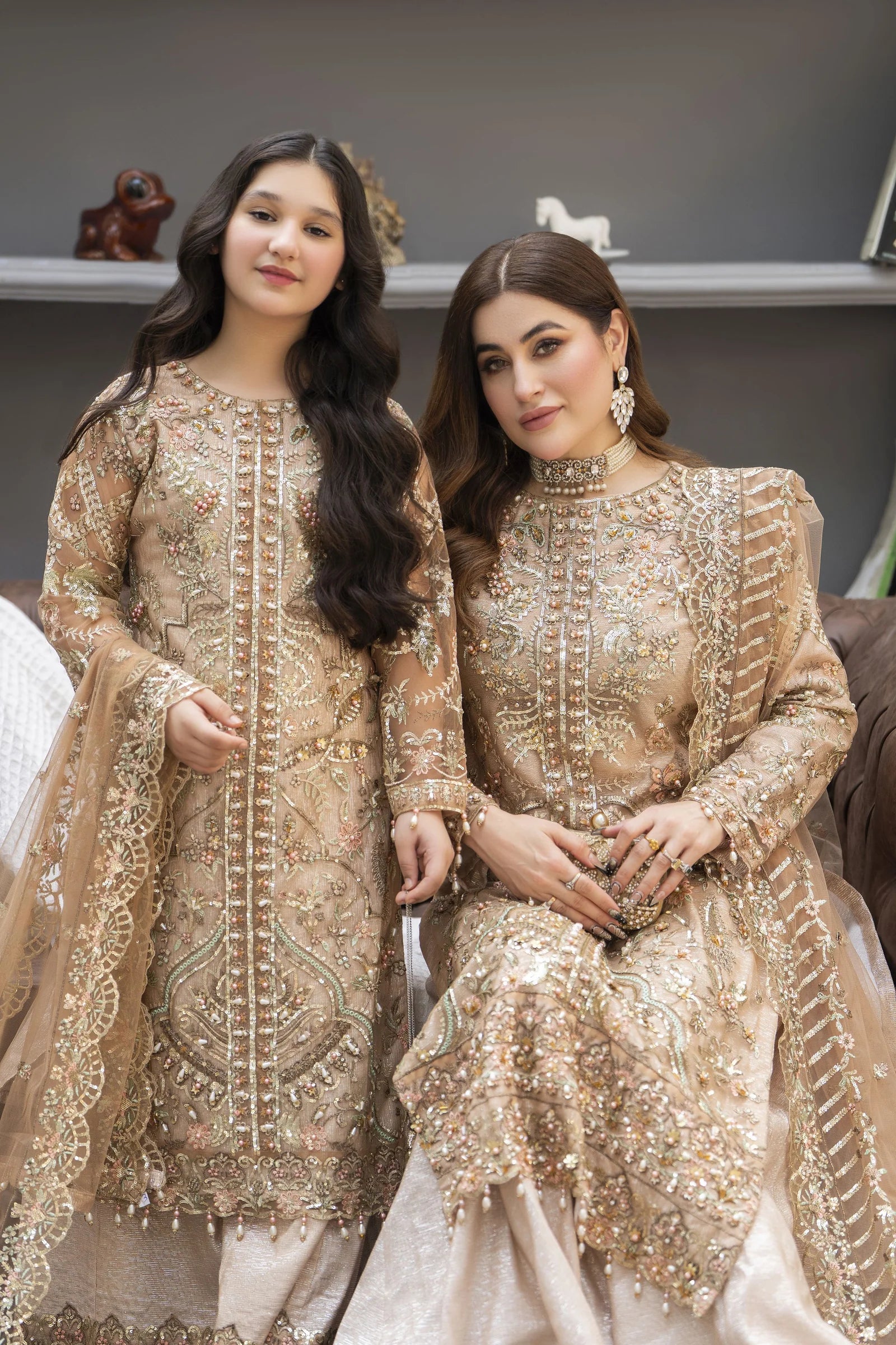 A matching net sequin-embroidered dupatta lends an extra touch of elegance, while the shimmering sequin-embroidered sharara completes this luxurious look. This exquisite outfit is perfect for making a grand entrance and turning heads at any special event.