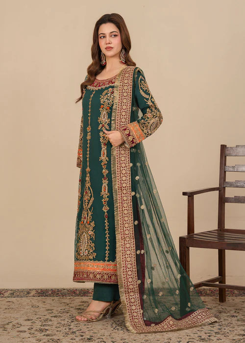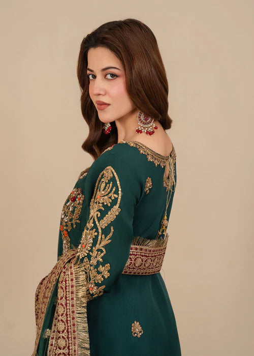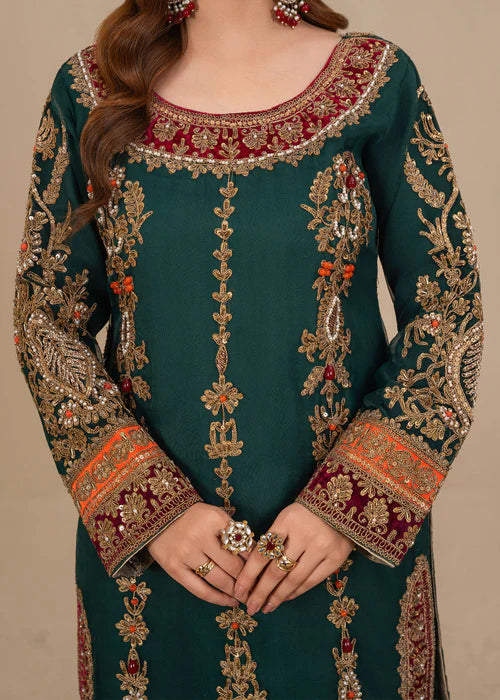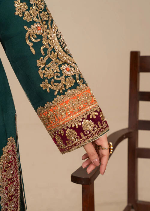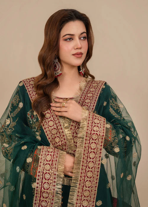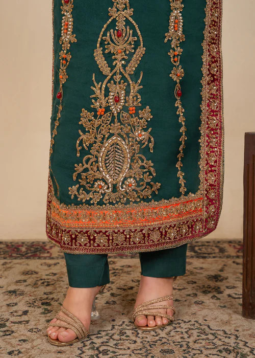 This festive formal ensemble features a finely crafted organza shirt adorned with intricate hand embroidery and detailed adda work, creating a rich and elegant visual appeal. The viscose inner and trouser ensure comfort while maintaining a structured silhouette. Finished with a net dupatta enhanced by a four-sided patti, the design offers a refined balance of traditional craftsmanship and occasion-ready sophistication