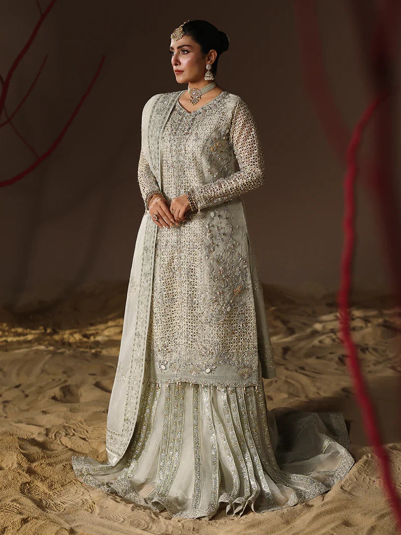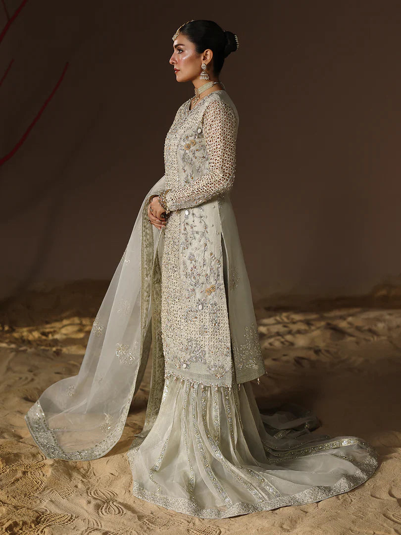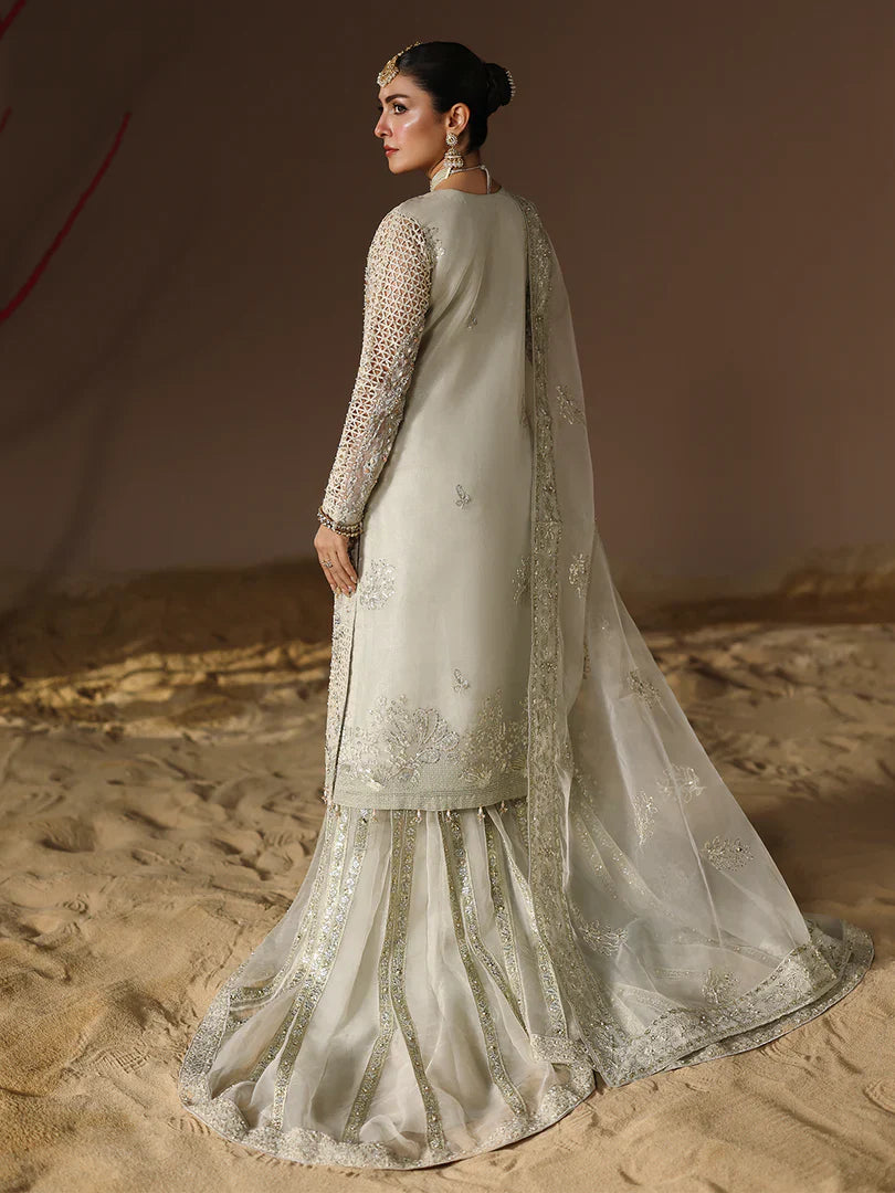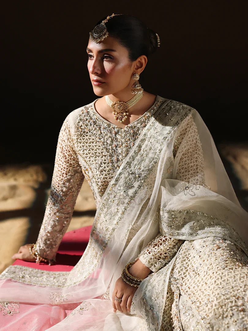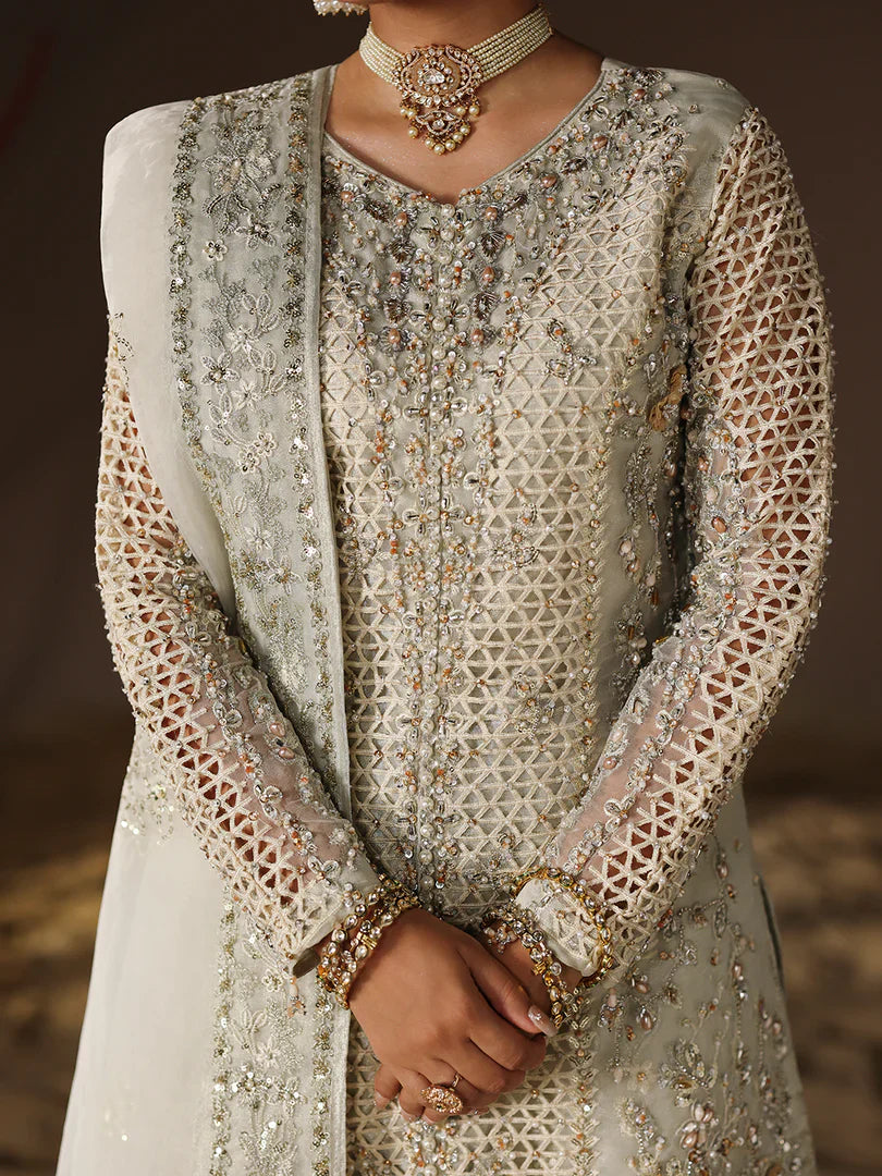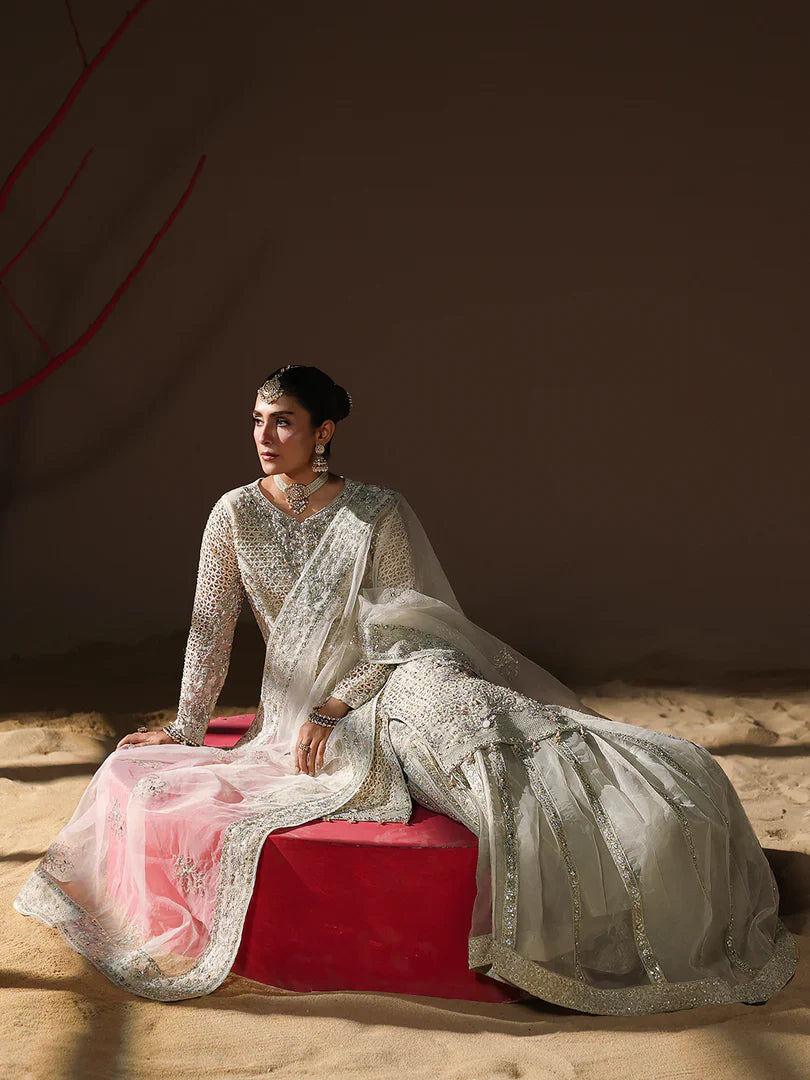 Organza shirt, intricately adorned with handcrafted adda work, sequin embroidery, and a delicate interplay of chainwork crystals, naqshi, and dabka. Pearls and stones whisper through cutwork and 3D embellishments, concealing a masoori fabric inner.