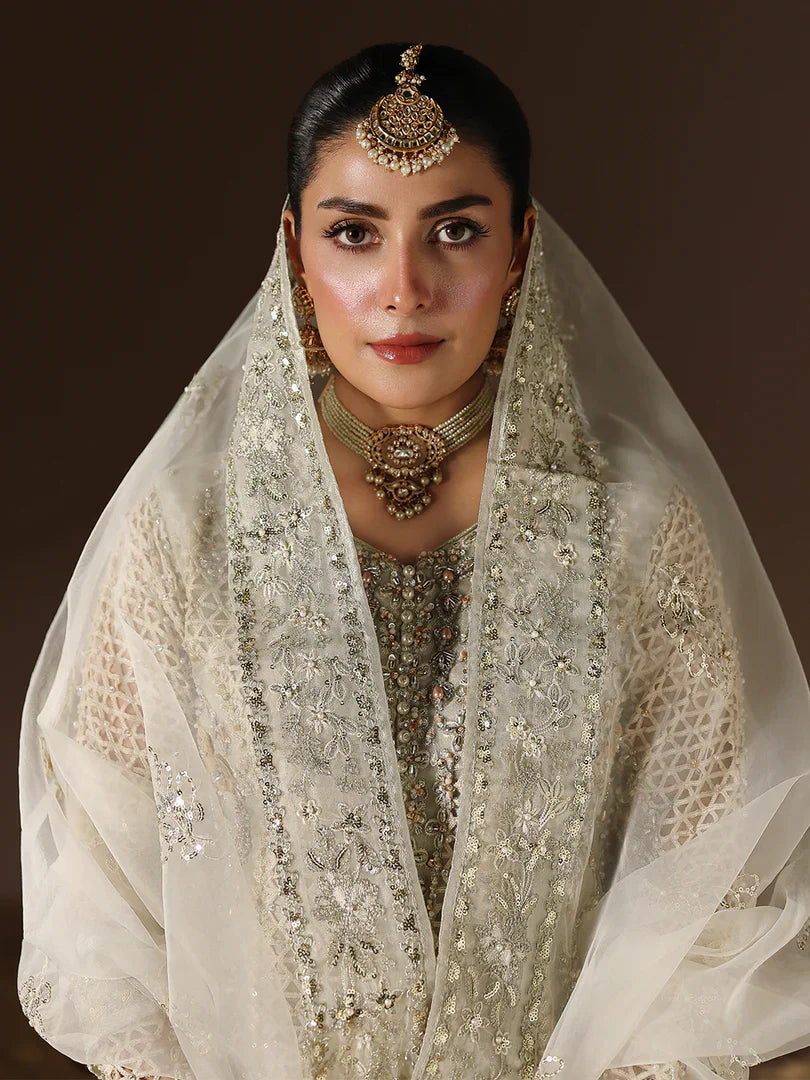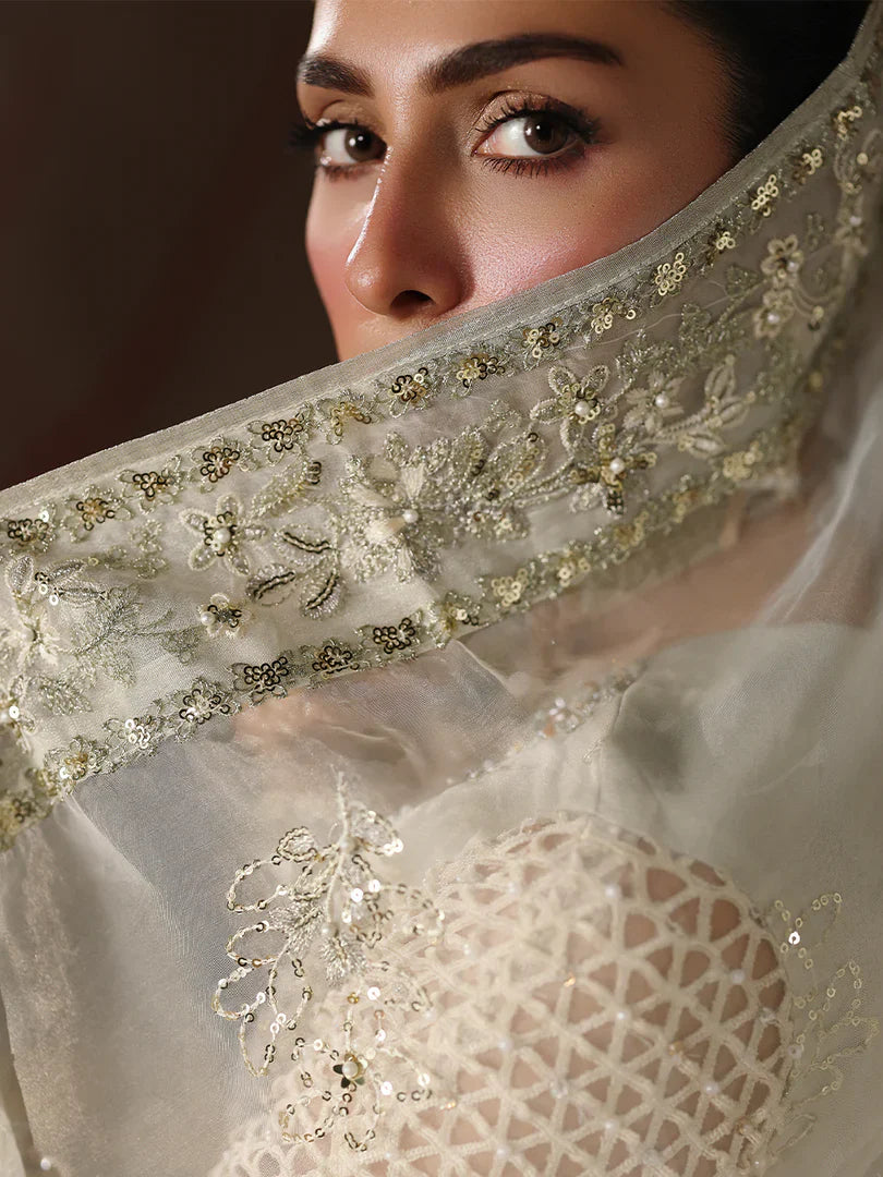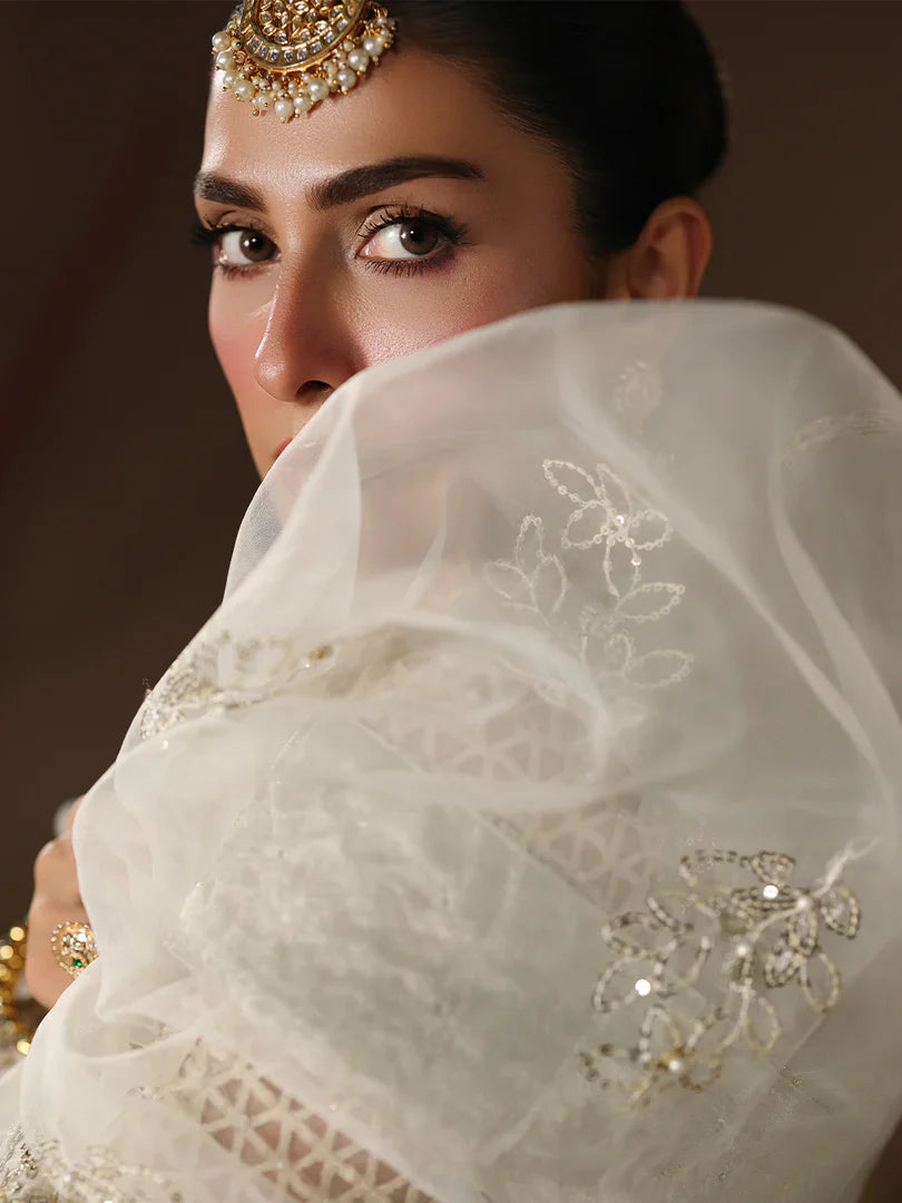 Organza dupatta, shrouded in sequin embroidery and pearls, veils its secrets.