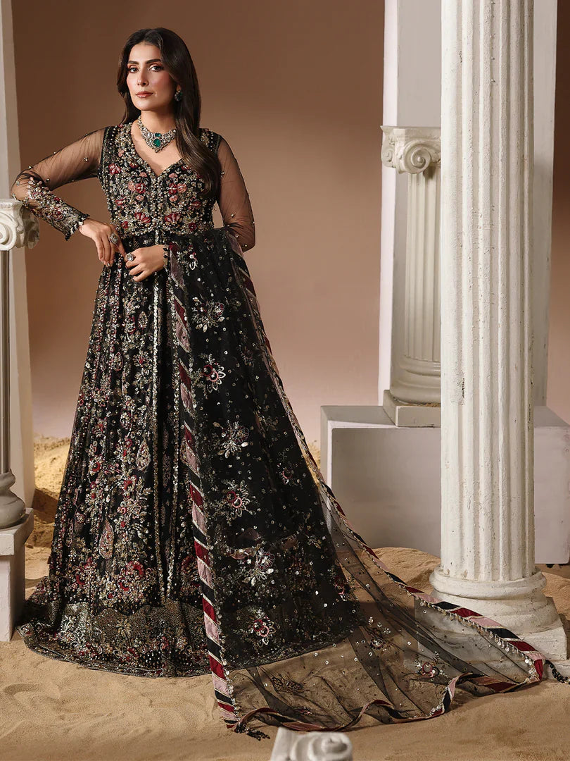 Net open maxi adorned with intricate sequin embroidery, hand-crafted adda work, naqshi dabka work, and cutdana stones.further enhanced by chainwork, crystals, and 3D floral embellishments, complemented by a viscose digital print inner layer.