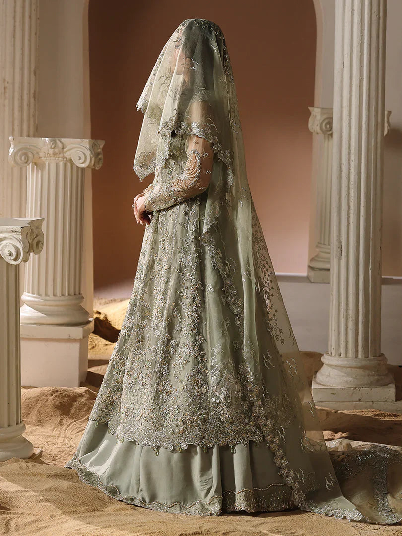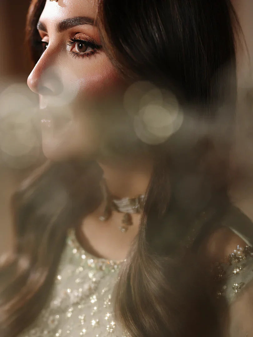 Organza maxi adorned with intricate sequin embroidery, handcrafted adda work, naqshi dabka work, cutdana stones, chainwork, crystals, and 3D floral embellishments.