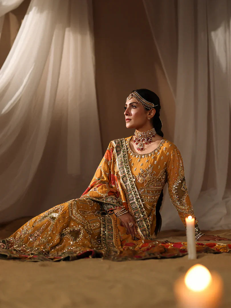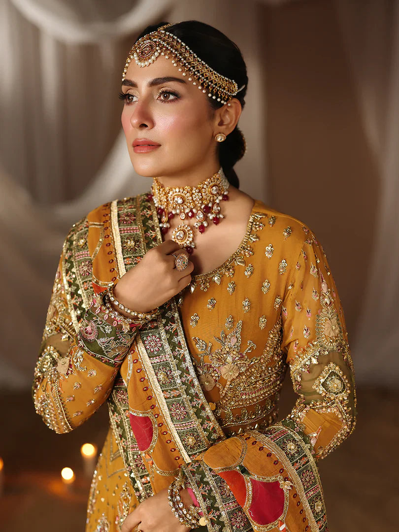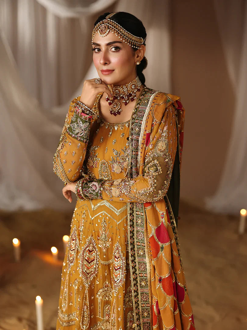 Chiffon maxi, exquisite with handcrafted adda work featuring pearls, naqshi, dabka, and crystals. Revel in the dazzling spangle embroidery and breathtaking 3D floral embellishments that make this piece truly unforgettable
