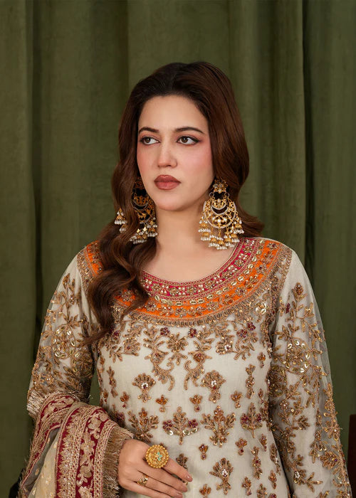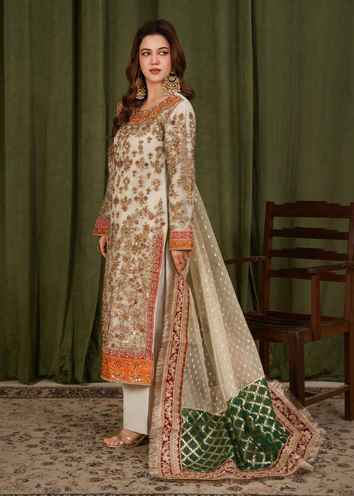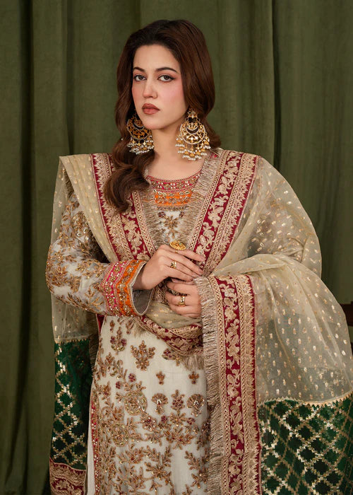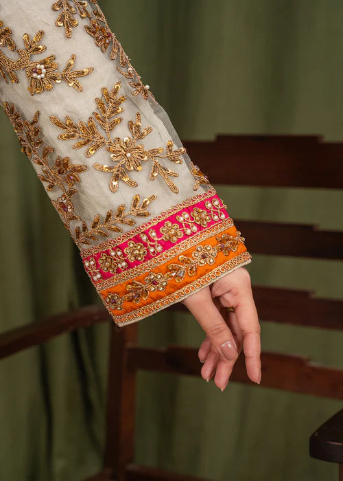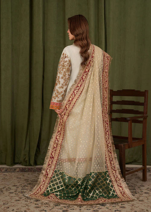 The look is completed with a net dupatta adorned with delicate sequin motifs and a richly detailed border, paired with plain trousers for a balanced and refined silhouette.