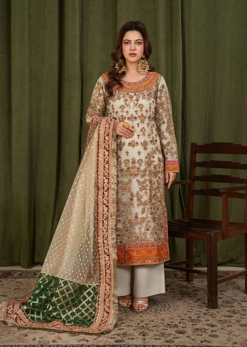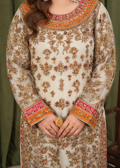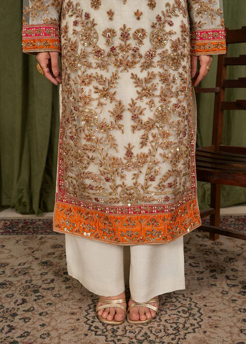 This graceful three-piece outfit features a net shirt embellished with intricate all-over embroidery using zari, sequins, and fine threadwork. The neckline and hem are highlighted with detailed contrasting borders, while the sleeves are fully embroidered for an elegant finish.