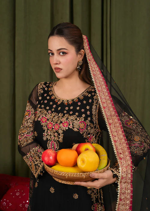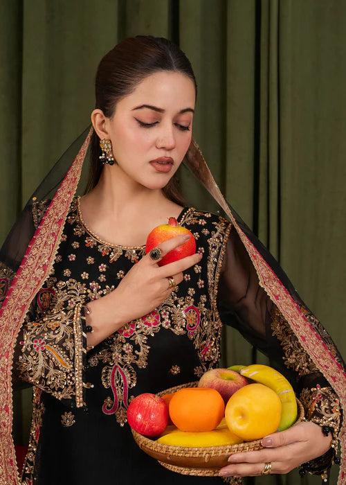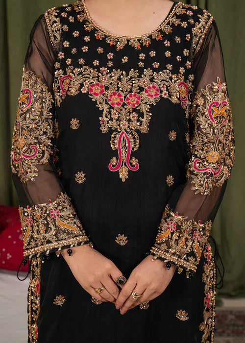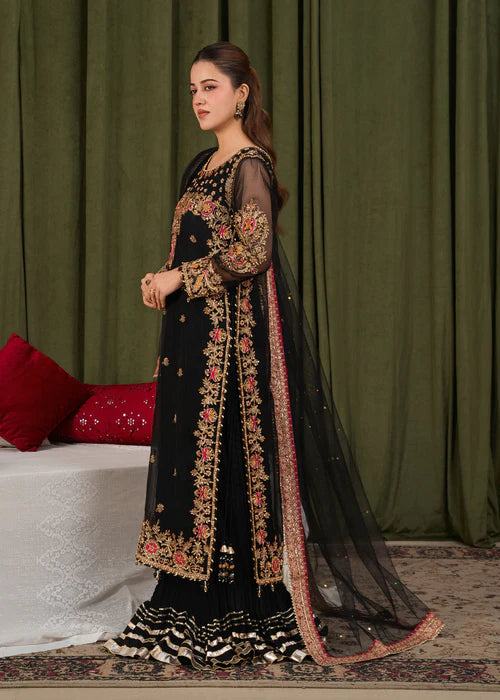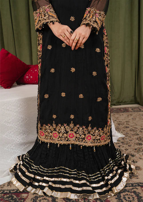 Define royalty with our latest Black Noir edit. Featuring a delicate Net shirt enriched with heavy Adda work and detailed embroidery, this outfit is a true masterpiece. Paired with a flowy Raw Silk Kali Sharara and a matching embroidered Net dupatta, this ensemble strikes the perfect balance between traditional grandeur and modern grace
