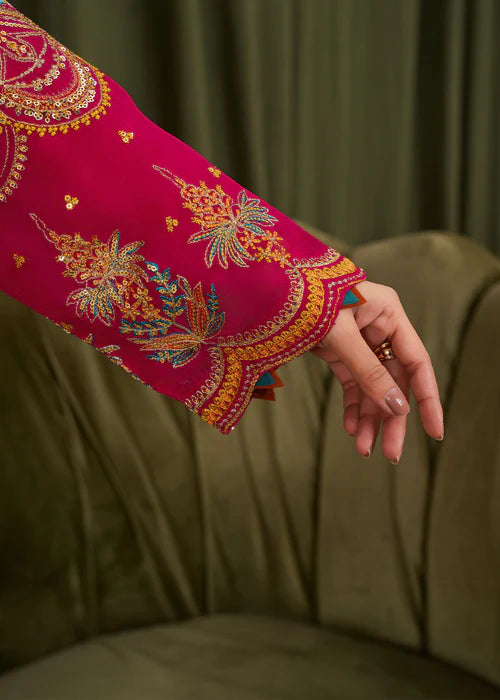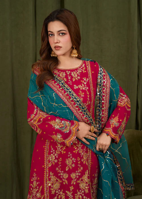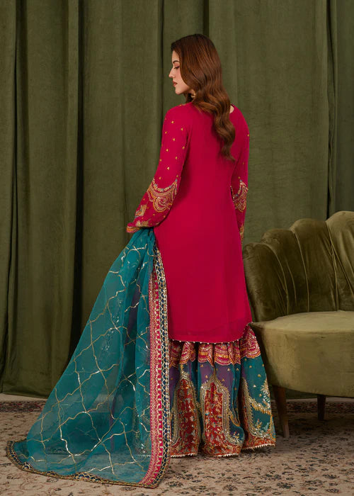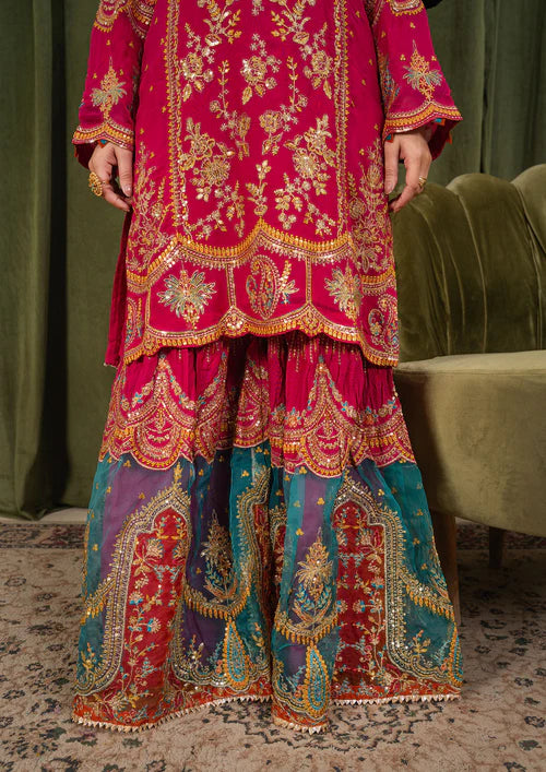 The shirt is crafted from premium chiffon, featuring delicate and dense embroidery throughout the front and sleeves. The intricate gold threadwork creates a shimmering floral pattern, while the scalloped hemline adds a refined, feminine touch. Shararah: The outfit is paired with a dramatic viscose shararah, which is heavily embroidered. It features a unique color-blocked design where the magenta transitions into a deep teal at the bottom, adorned with majestic gold motifs and intricate border work. * Dupatta: Completing the look is a sheer organza dupatta in a contrasting deep teal. It features a delicate gold lattice (jaal) pattern throughout and is finished with a heavily embroidered magenta border that ties the entire color palette together.