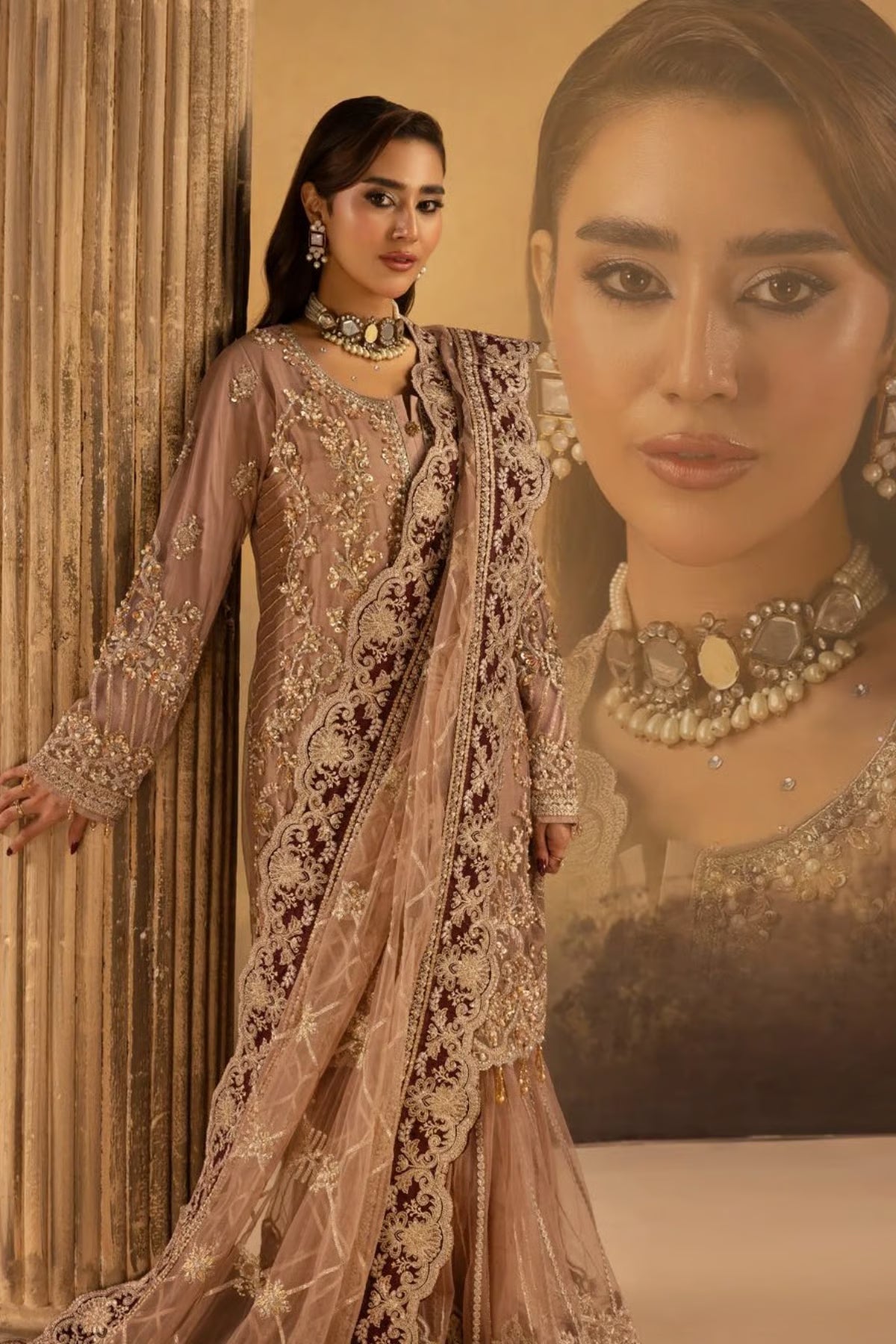 3 piece Imrozia collection suit features a straight shirt with luxury thread and bead and motif embroidered front, finished with dangling beads on the border. It comes with full length embroidered sleeves and an embroidered gharara. The look is finished with a net embroidered dupatta.