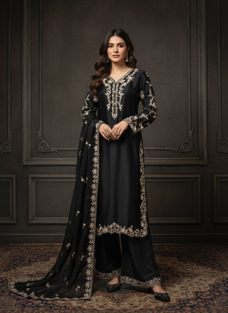 An elegant silk suit by Sherrys, featuring a long shirt with delicate thread and pearl embroidery on the neckline and side borders, along with embroidered detailing on the back. Paired with an embroidered chiffon dupatta and a matching silk palazzo finished with embroidery on the hems. Perfect for festive and formal wear.