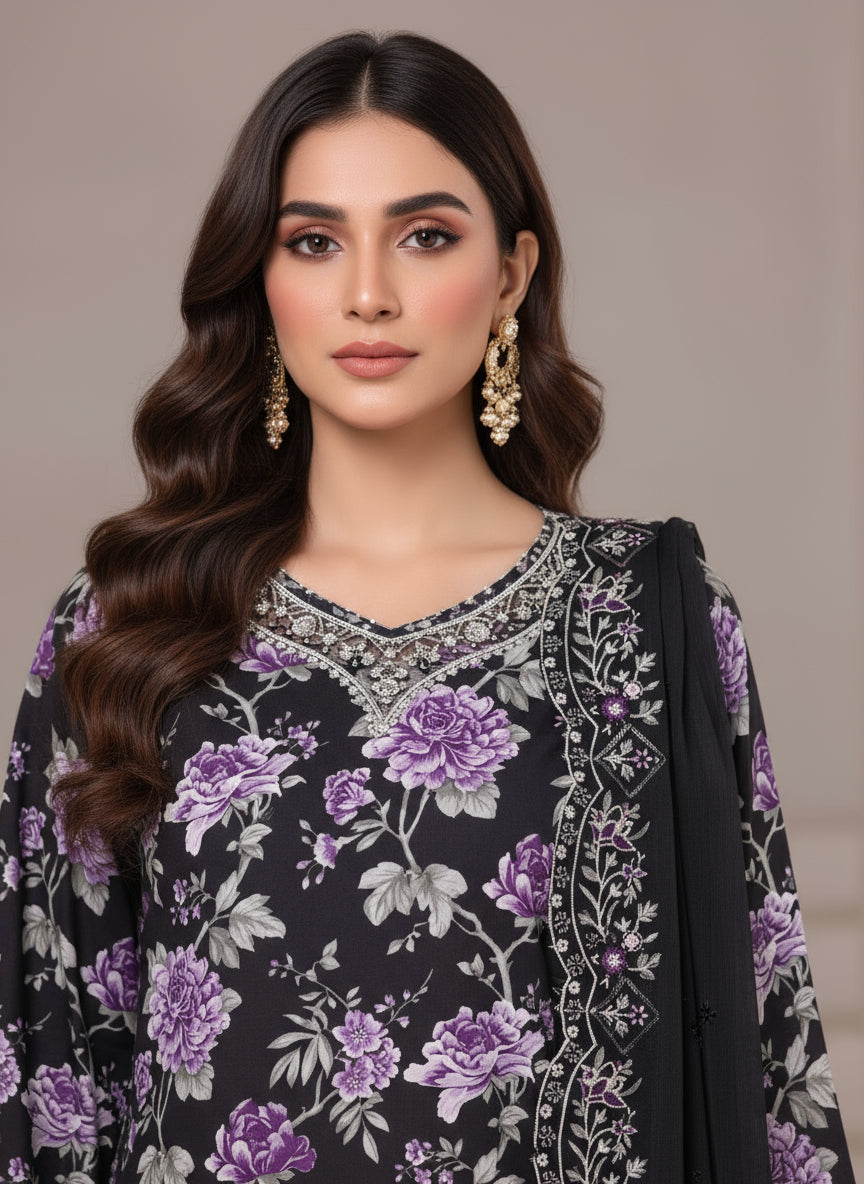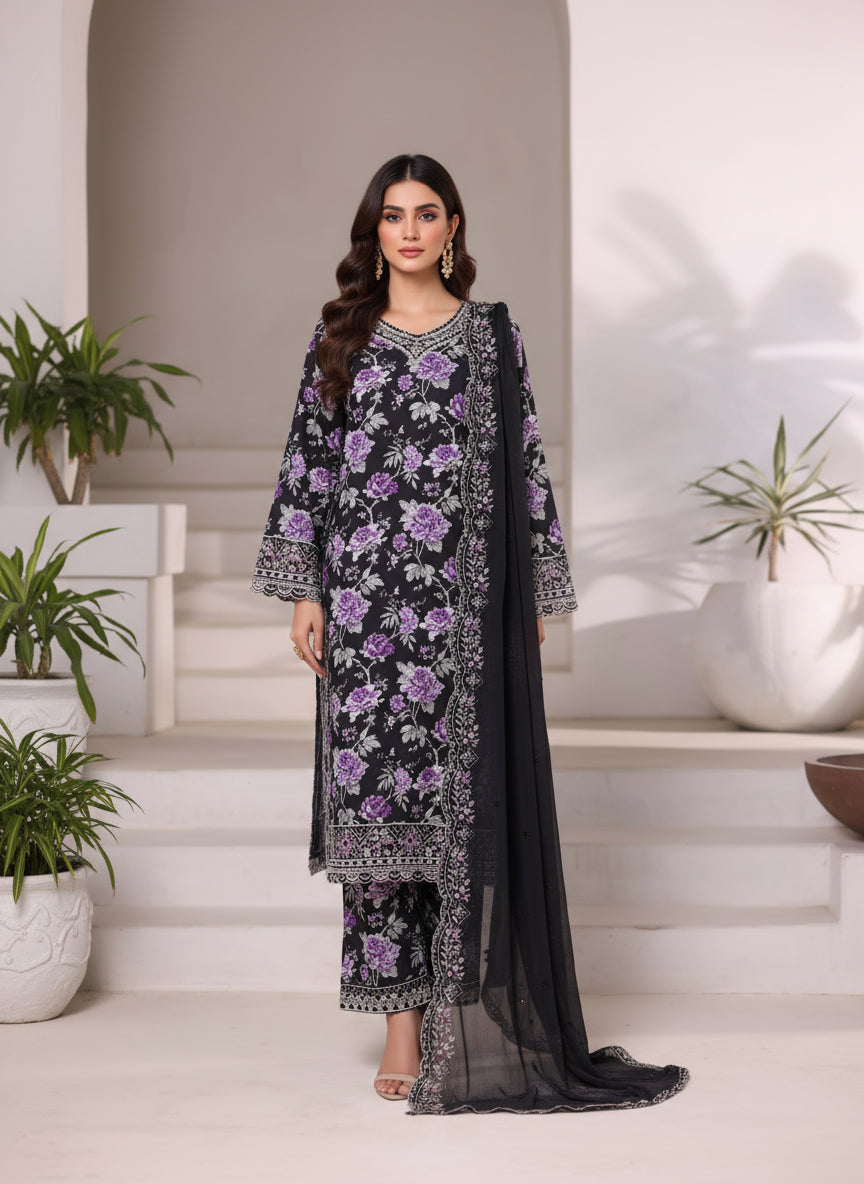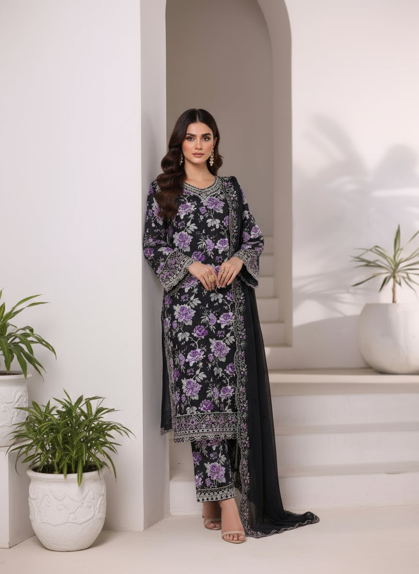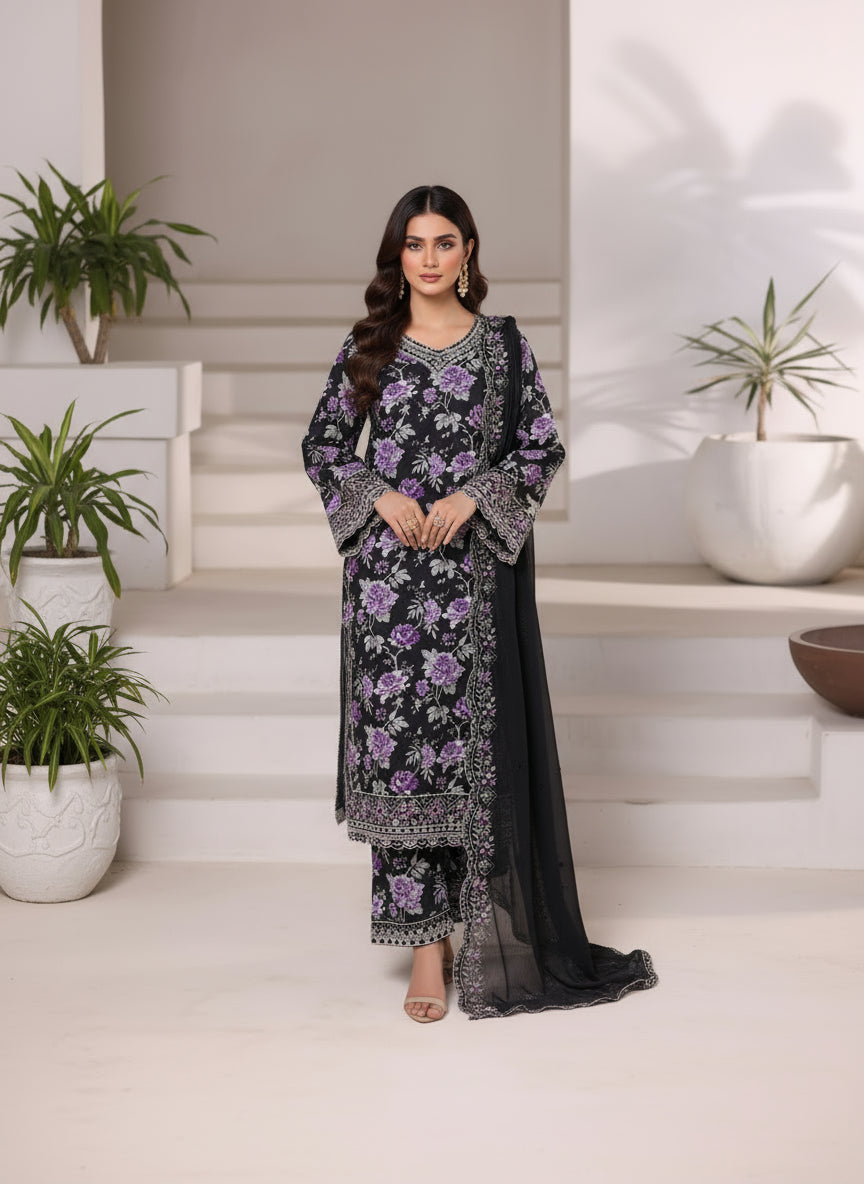 Elegant 3-piece viscose suit featuring a soft, breathable fabric paired with an embroidered chiffon dupatta — perfect for festive and semi-formal occasions.