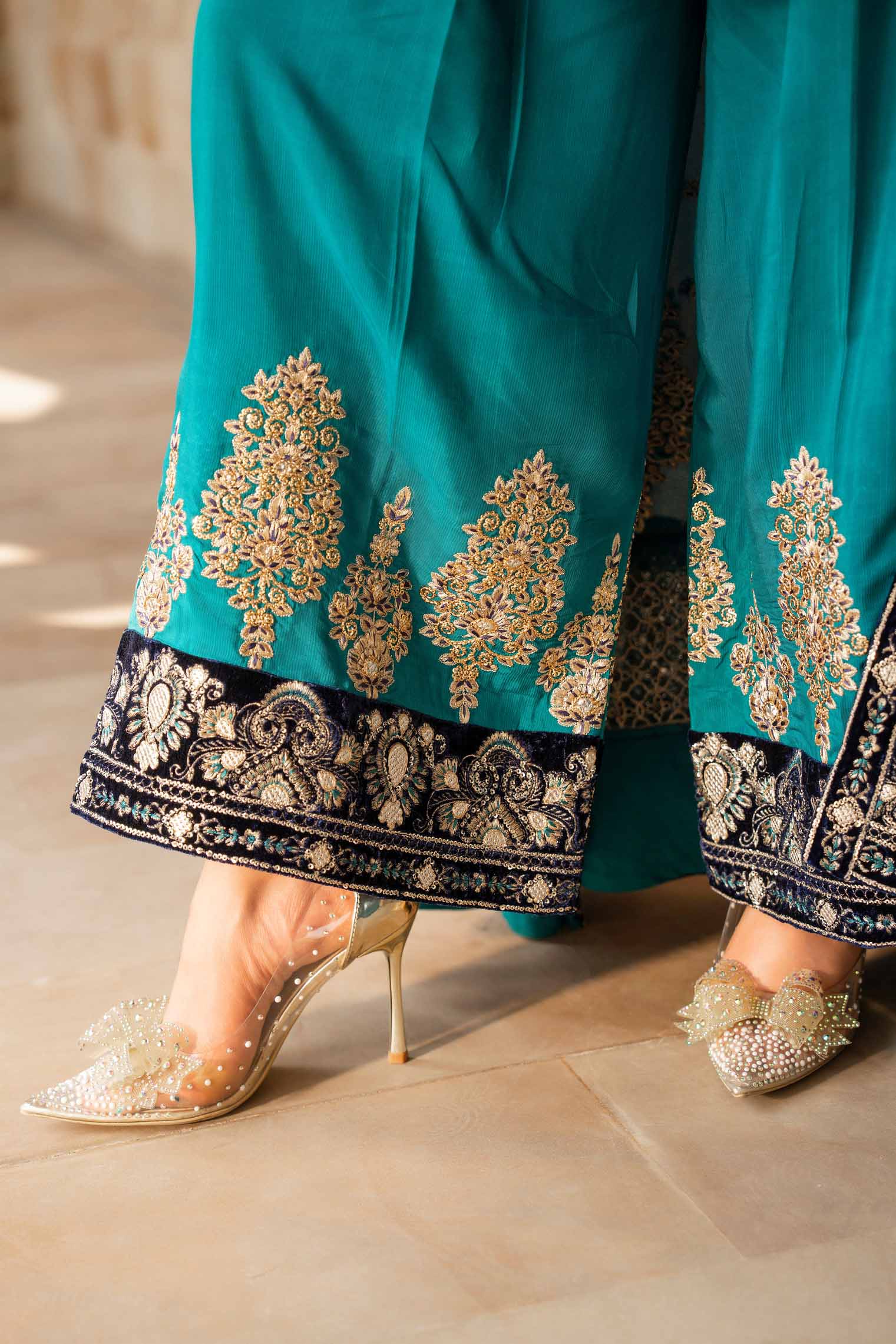 Raw Silk Grip 2 Piece with Chiffon Gown and Velvet Patch on Neckline Sleeves and Border