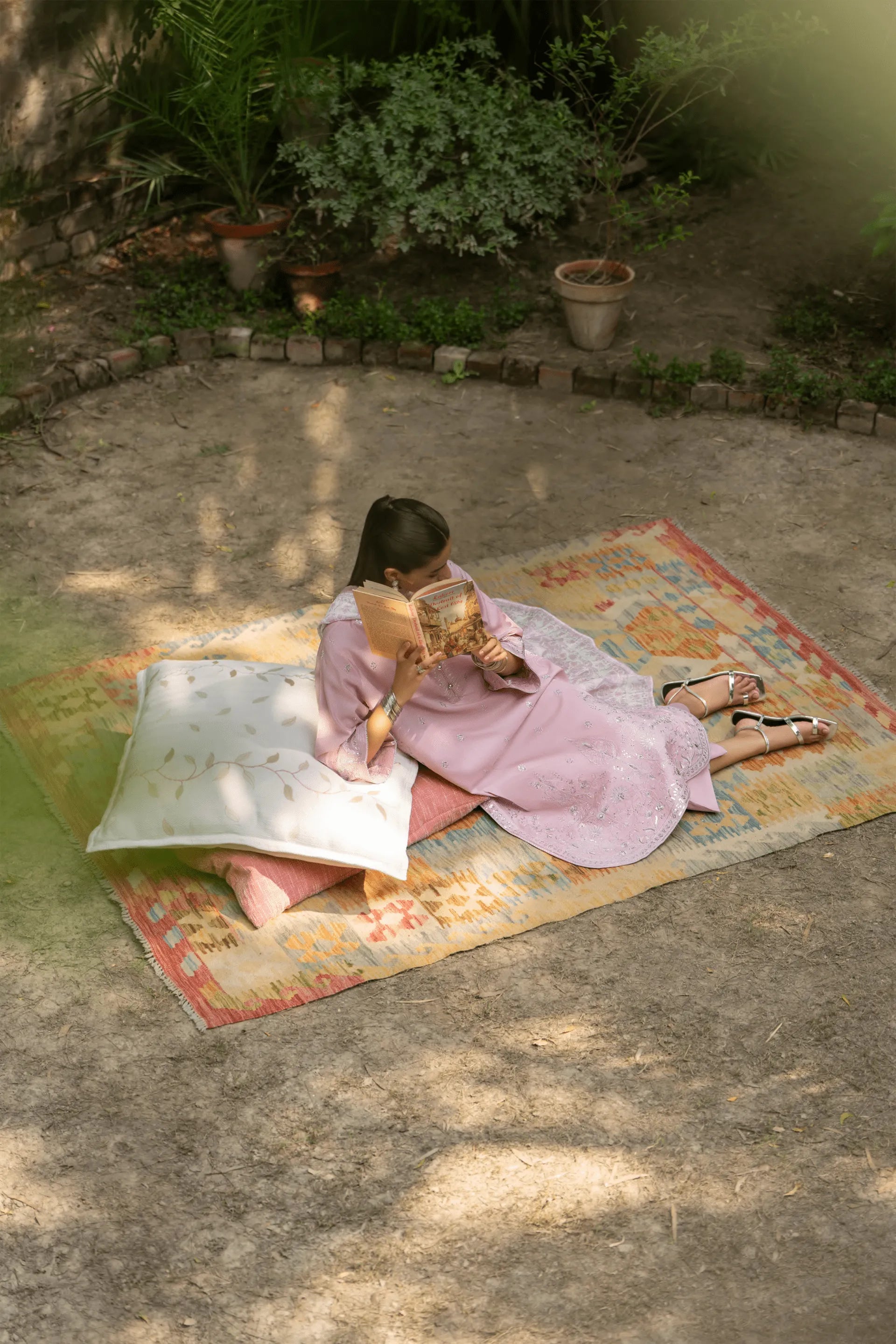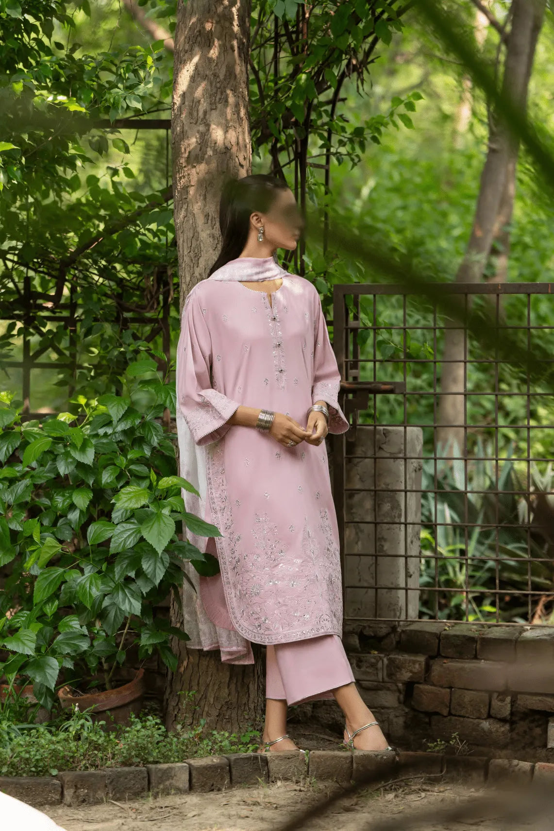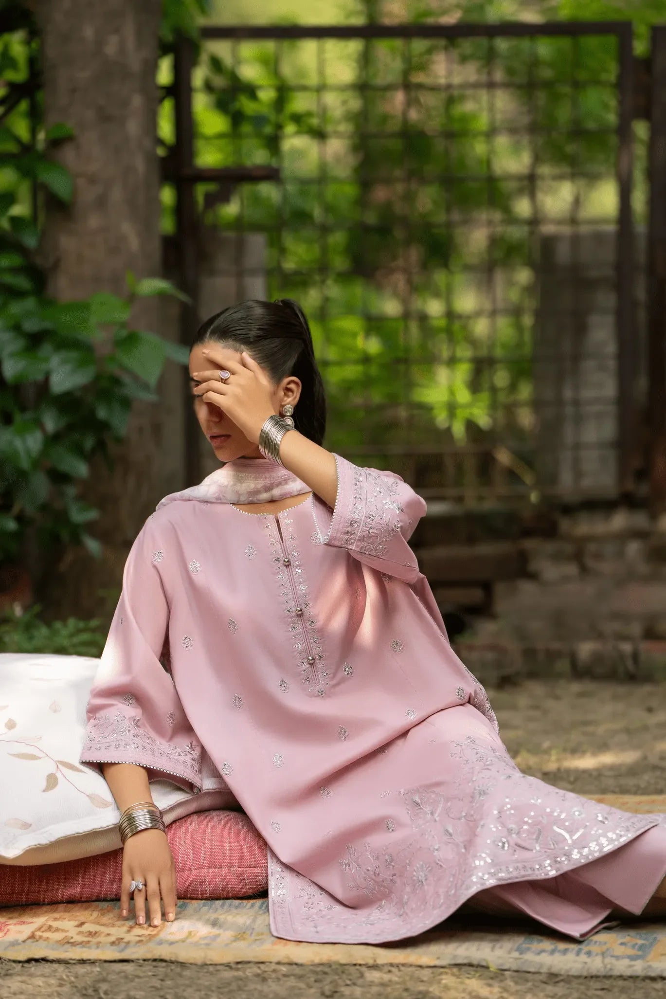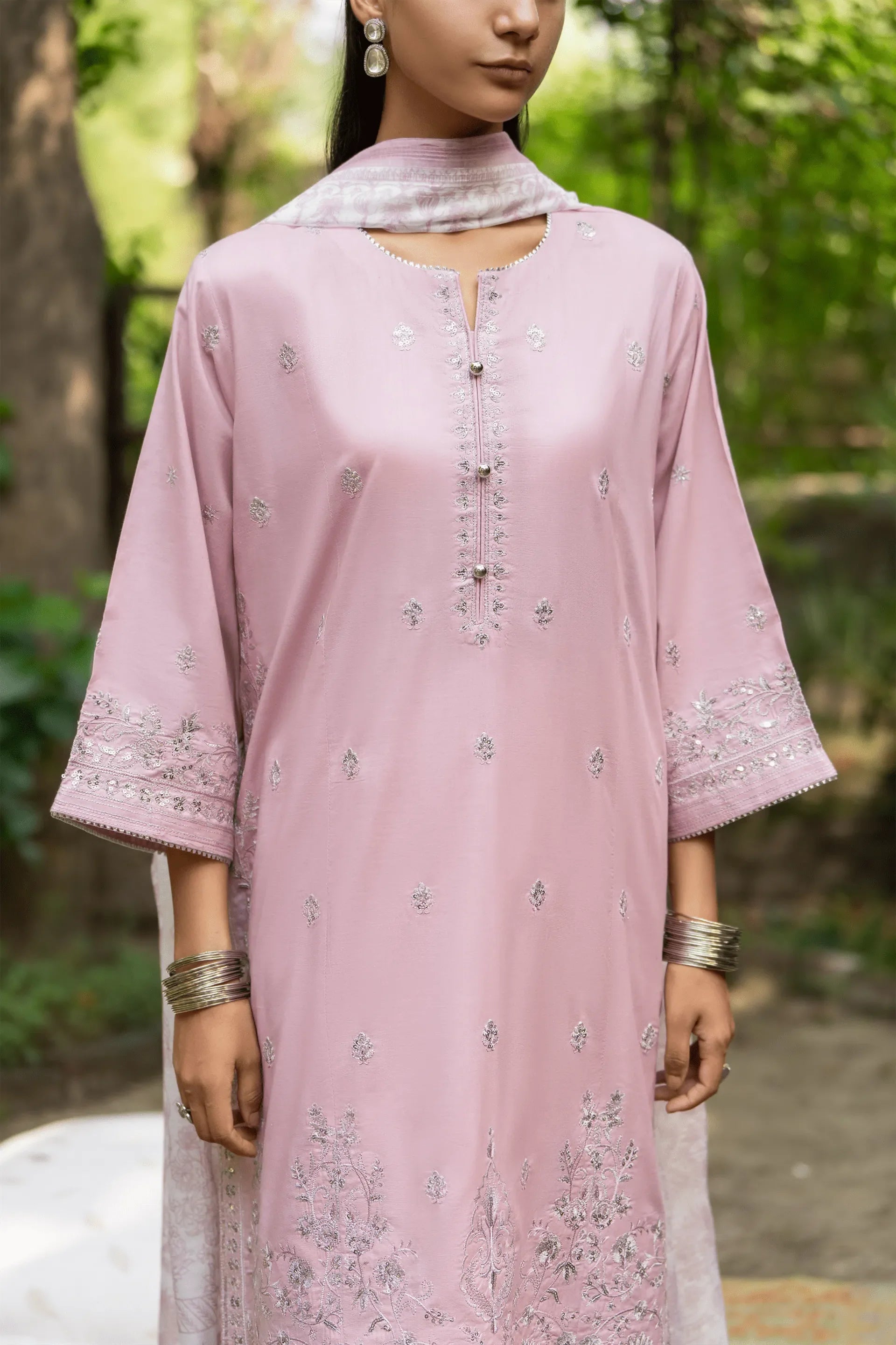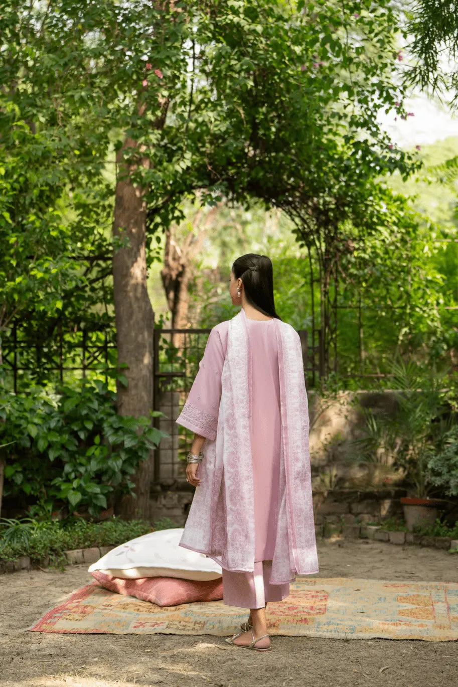 A soft pastel pink ensemble that embodies serenity through exquisite craftsmanship. Intricately embroidered with silver threadwork, it radiates a subtle, luminous charm under daylight.