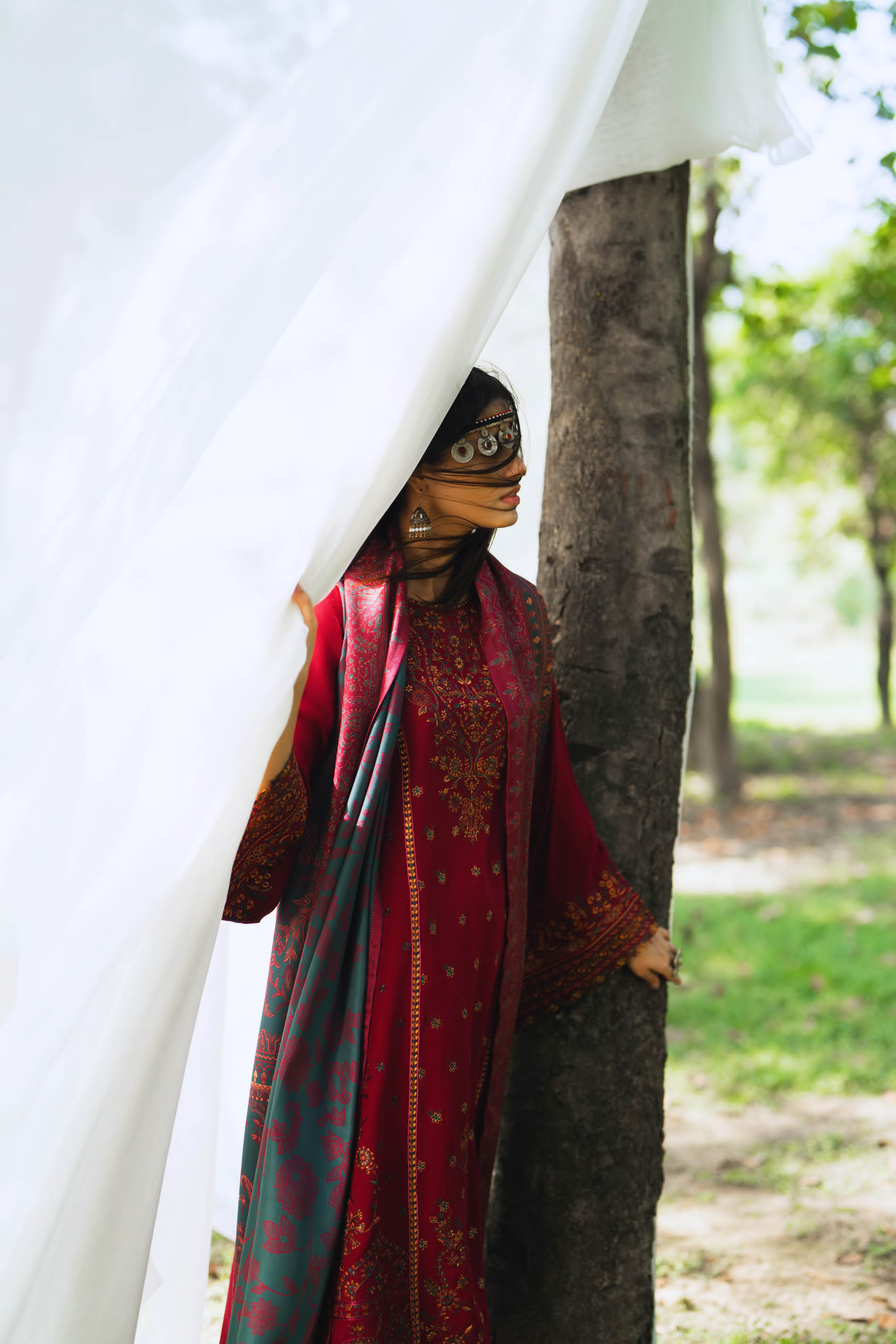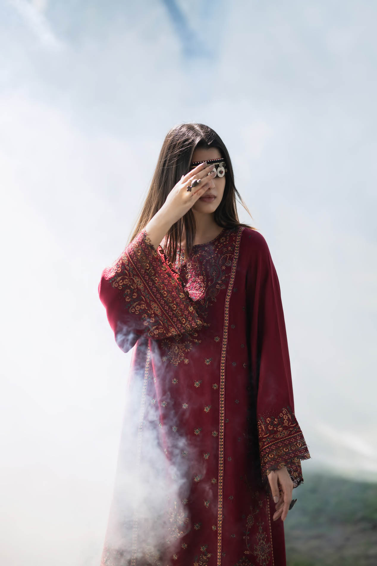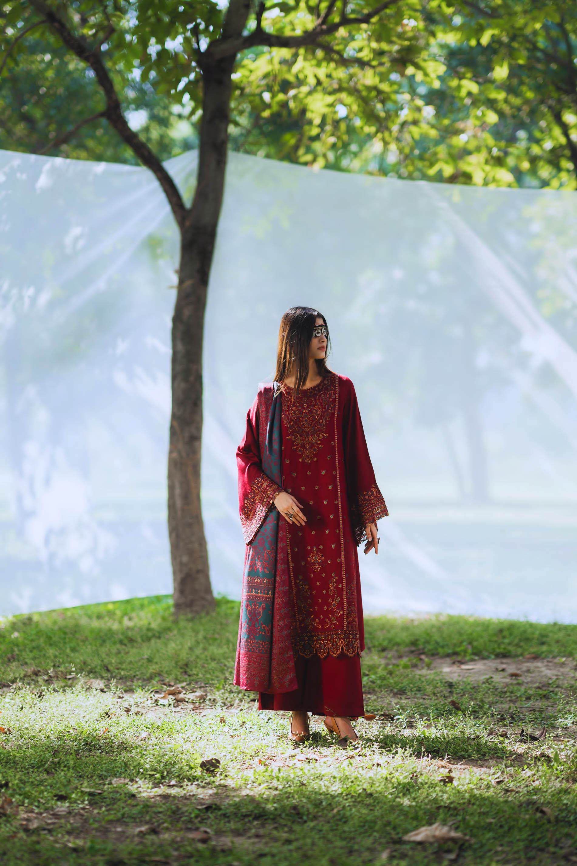 Garnet Rhapsody is a deep-winter three-piece in rich garnet, lit with fine antique-gold embroidery across the neckline, cuffs, and hem.