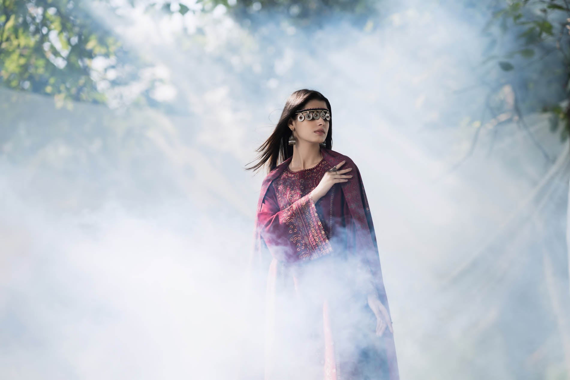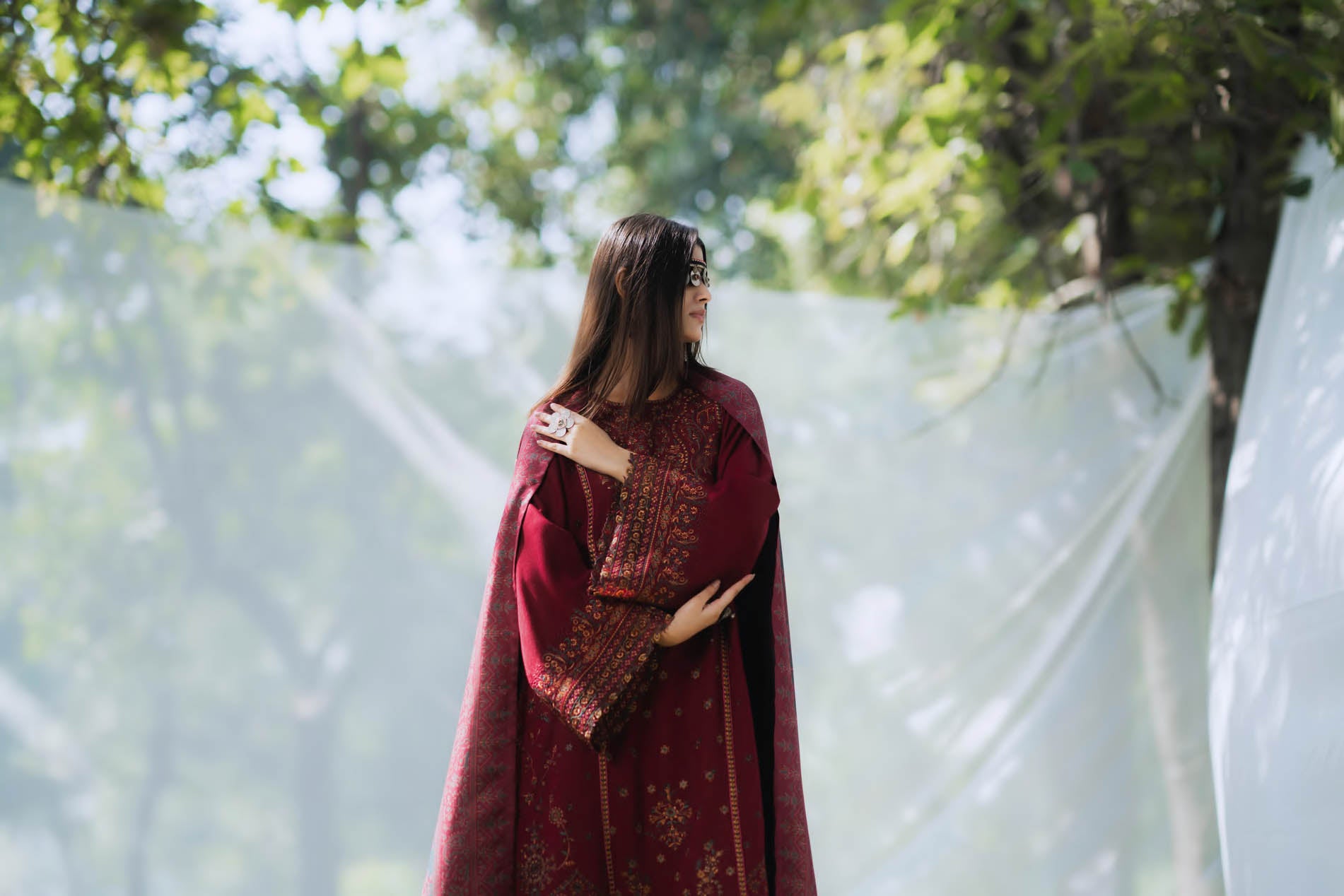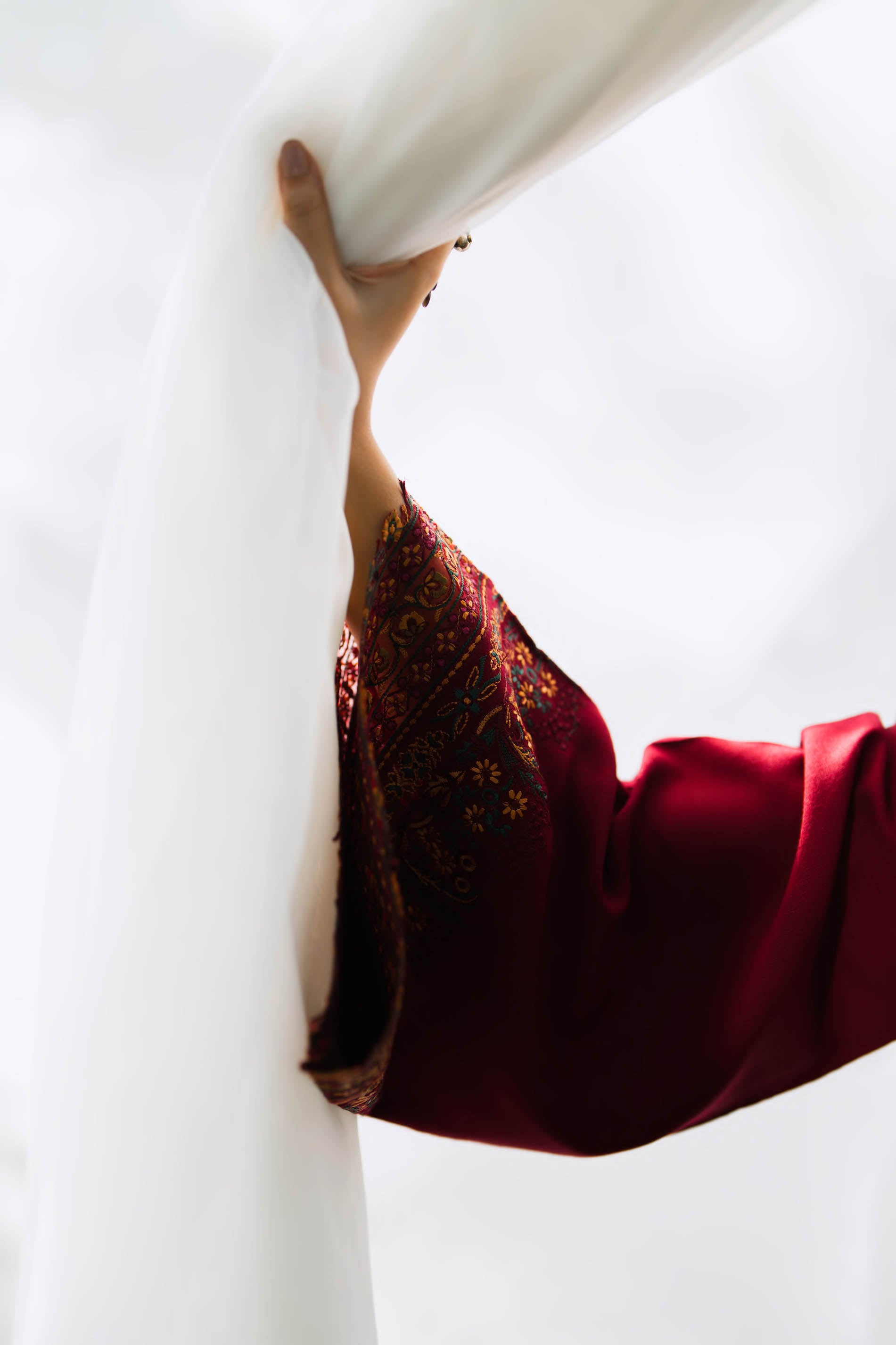 Garnet Rhapsody is a deep-winter three-piece in rich garnet, lit with fine antique-gold embroidery across the neckline, cuffs, and hem.