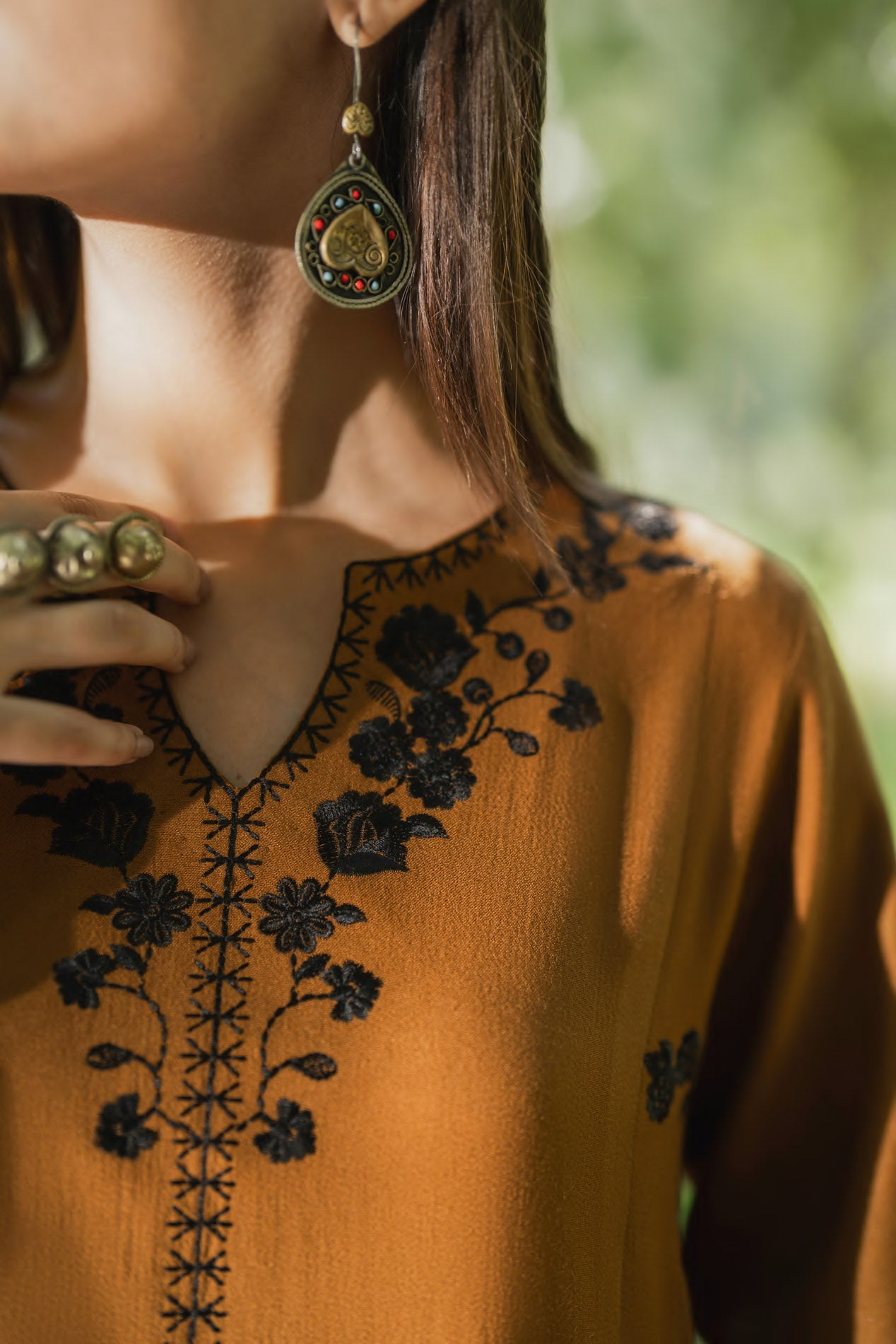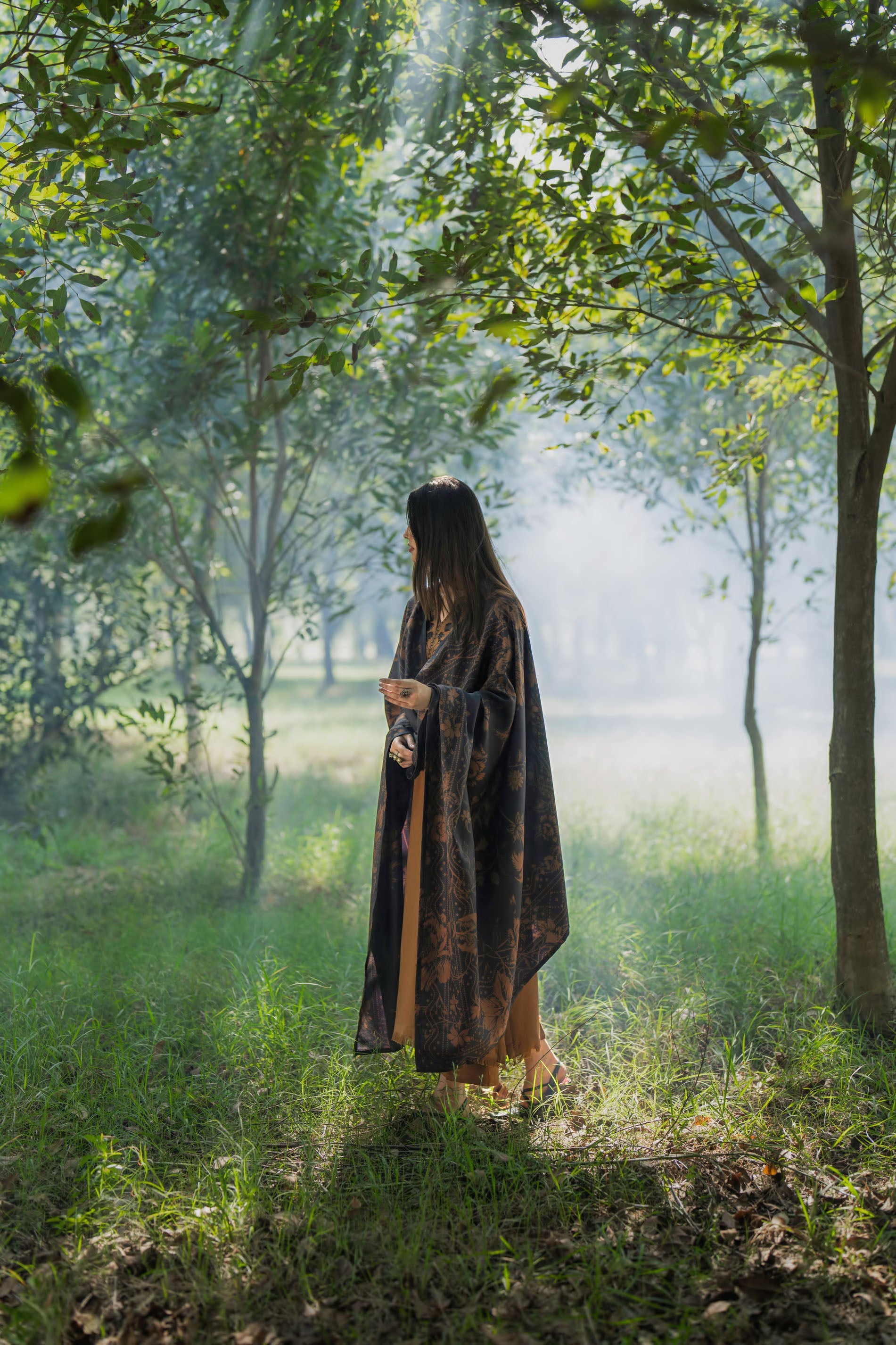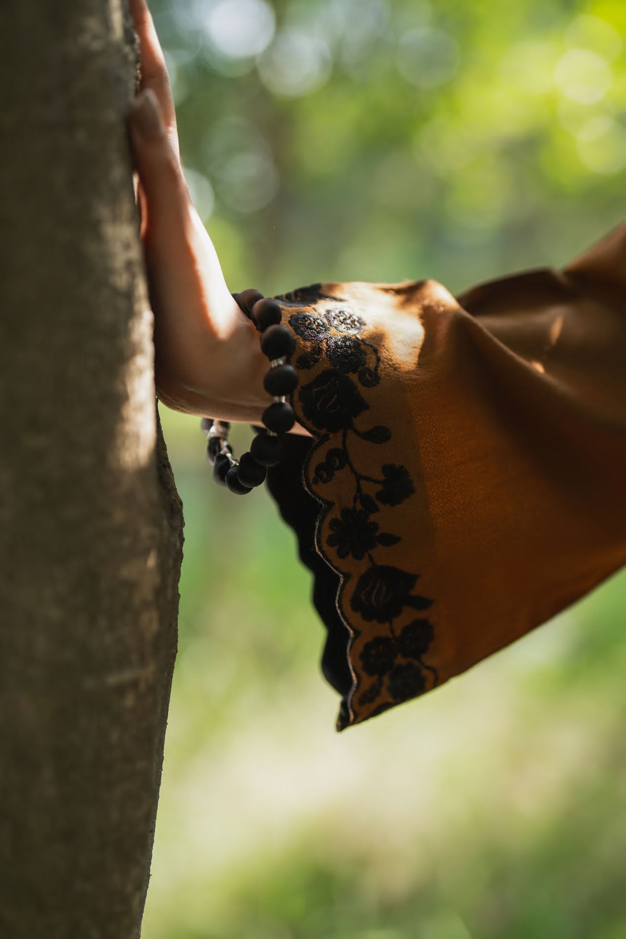 The soft, flowy fabric drapes effortlessly, while the wide sleeves and intricate detailing