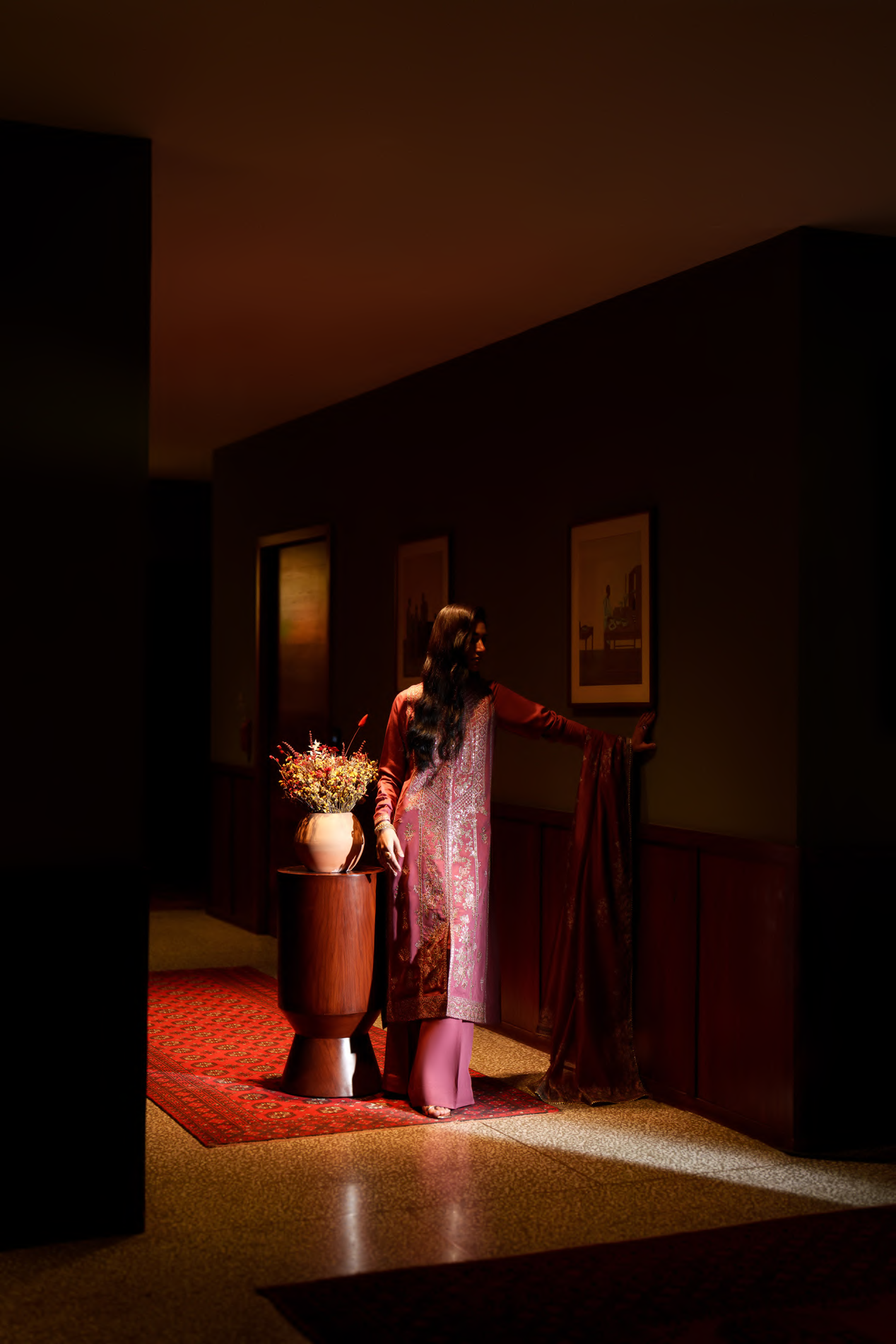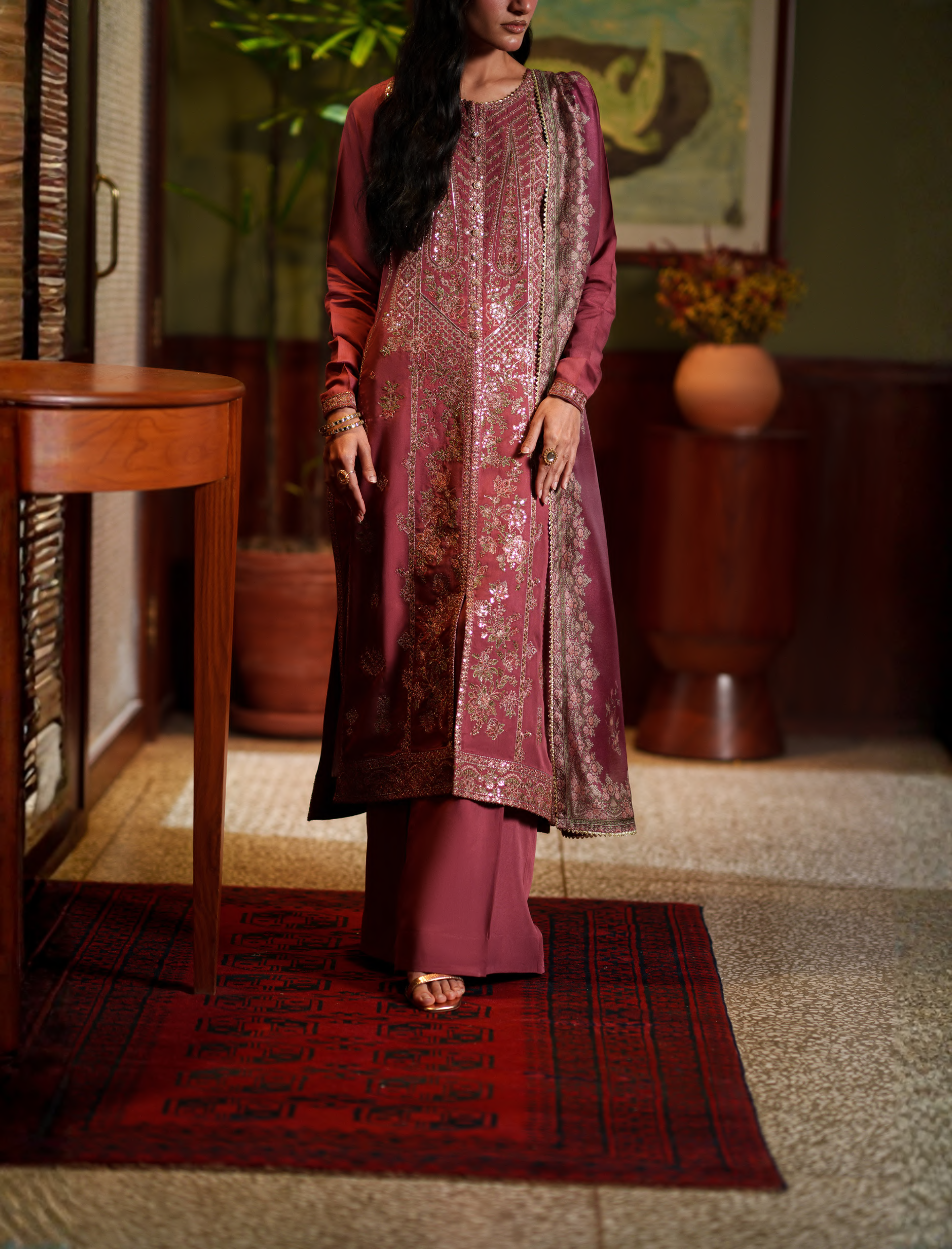 Experience elevated festive elegance with the Maribel Rich Rosewood Ensemble, crafted for timeless sophistication. Set on a deep rosewood base, the outfit is adorned with exquisite gold embroidery that adds warmth, richness, and a regal glow. The look is beautifully complemented by a patterned dupatta, enhancing the ensemble with graceful movement and refined detail.
