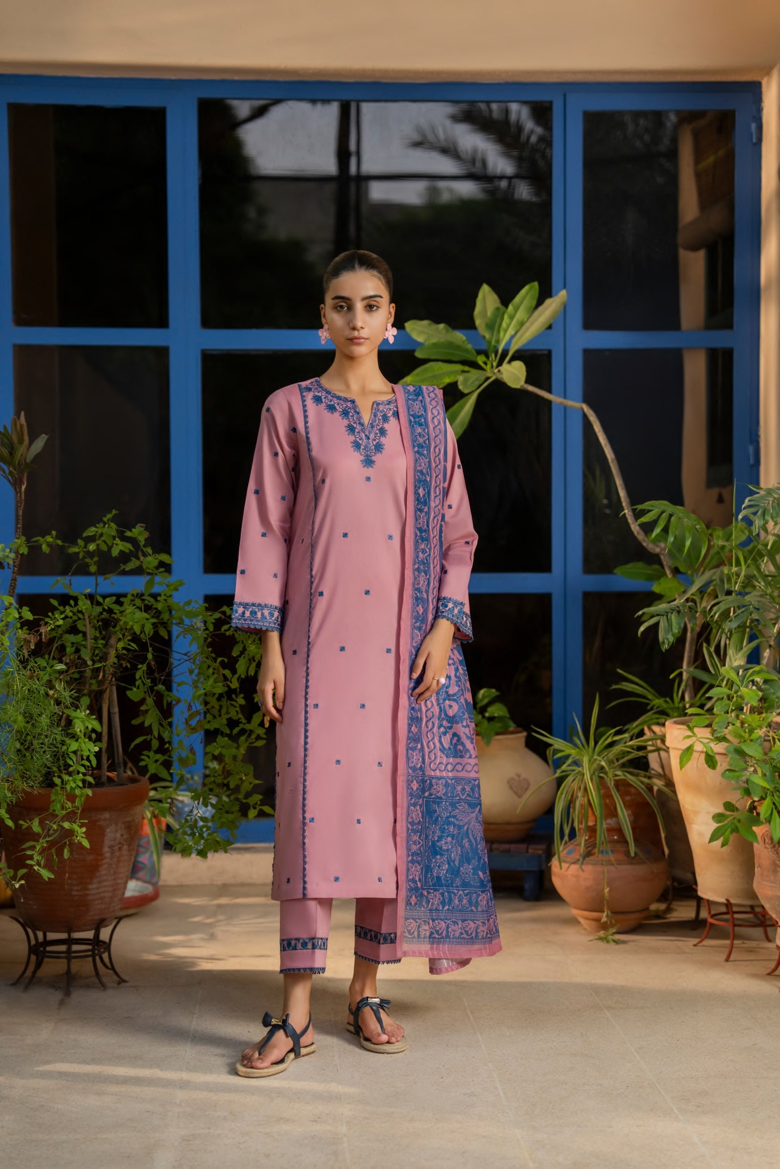 The soft mauve-pink base is beautifully contrasted with intricate navy blue embroidery that highlights the neckline, sleeves, and trouser hem