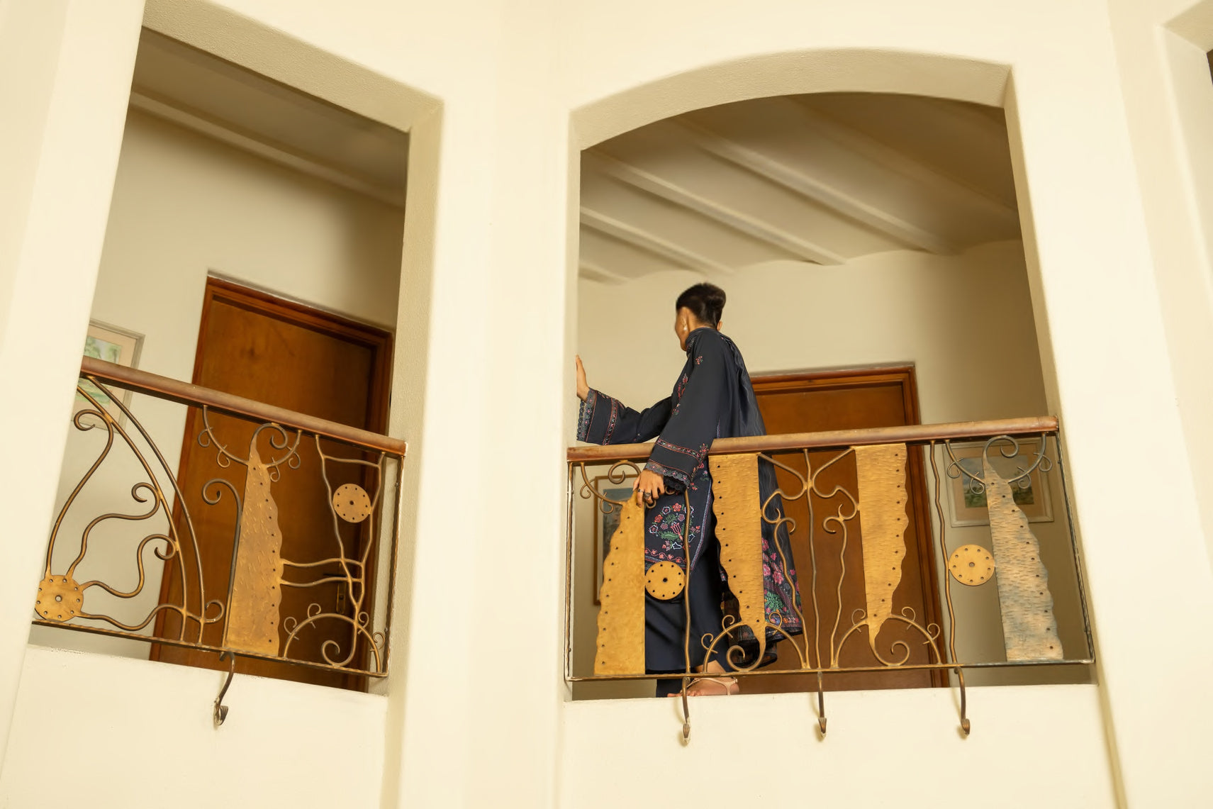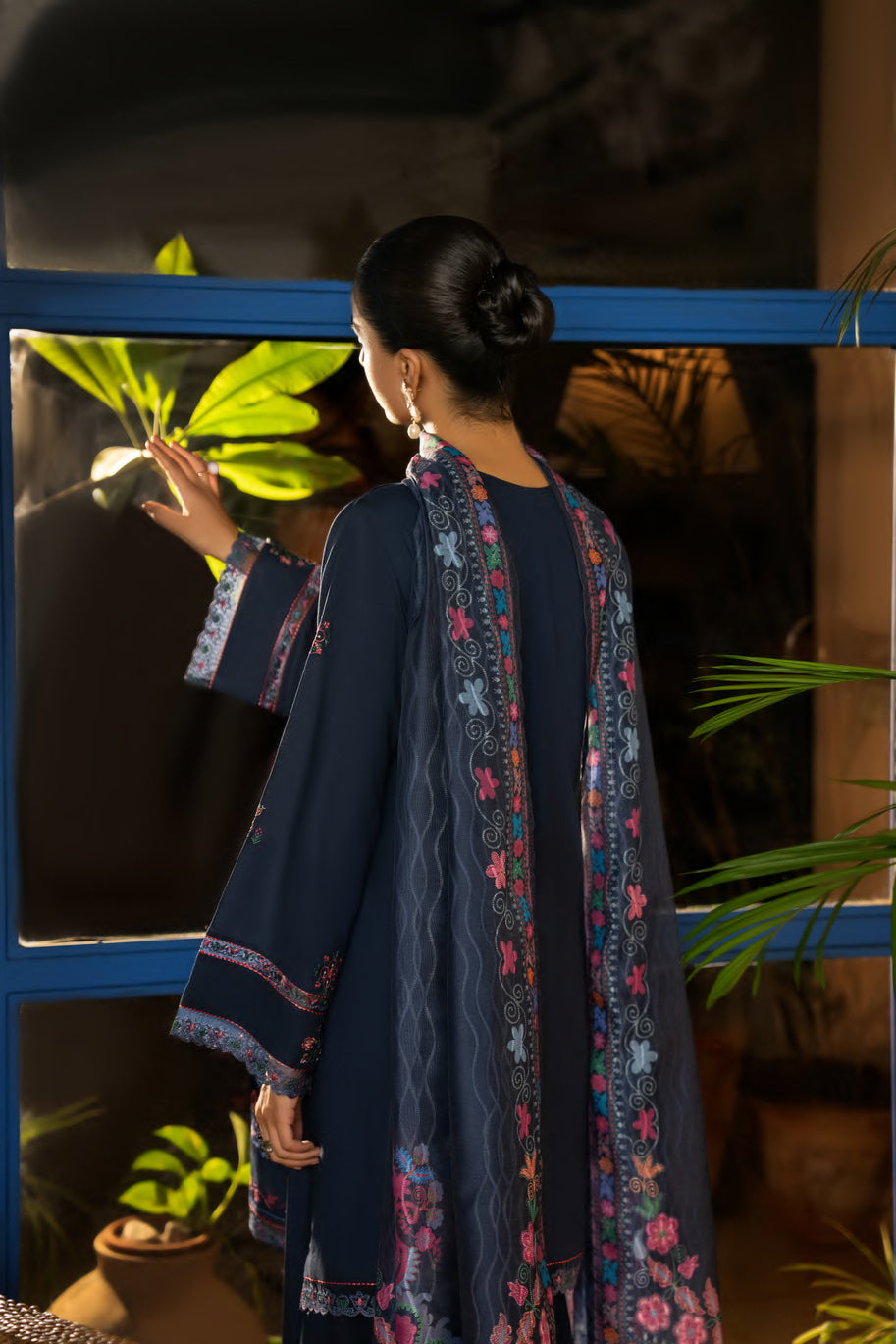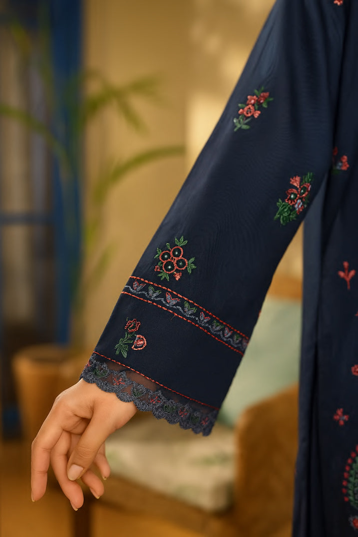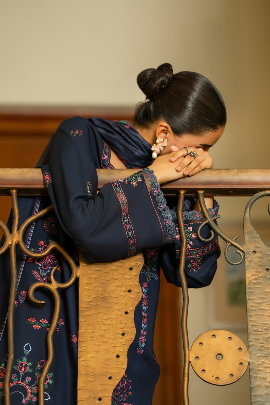 This outfit is a deep navy blue ensemble adorned with vibrant multicolored embroidery that adds a lively and artistic touch.