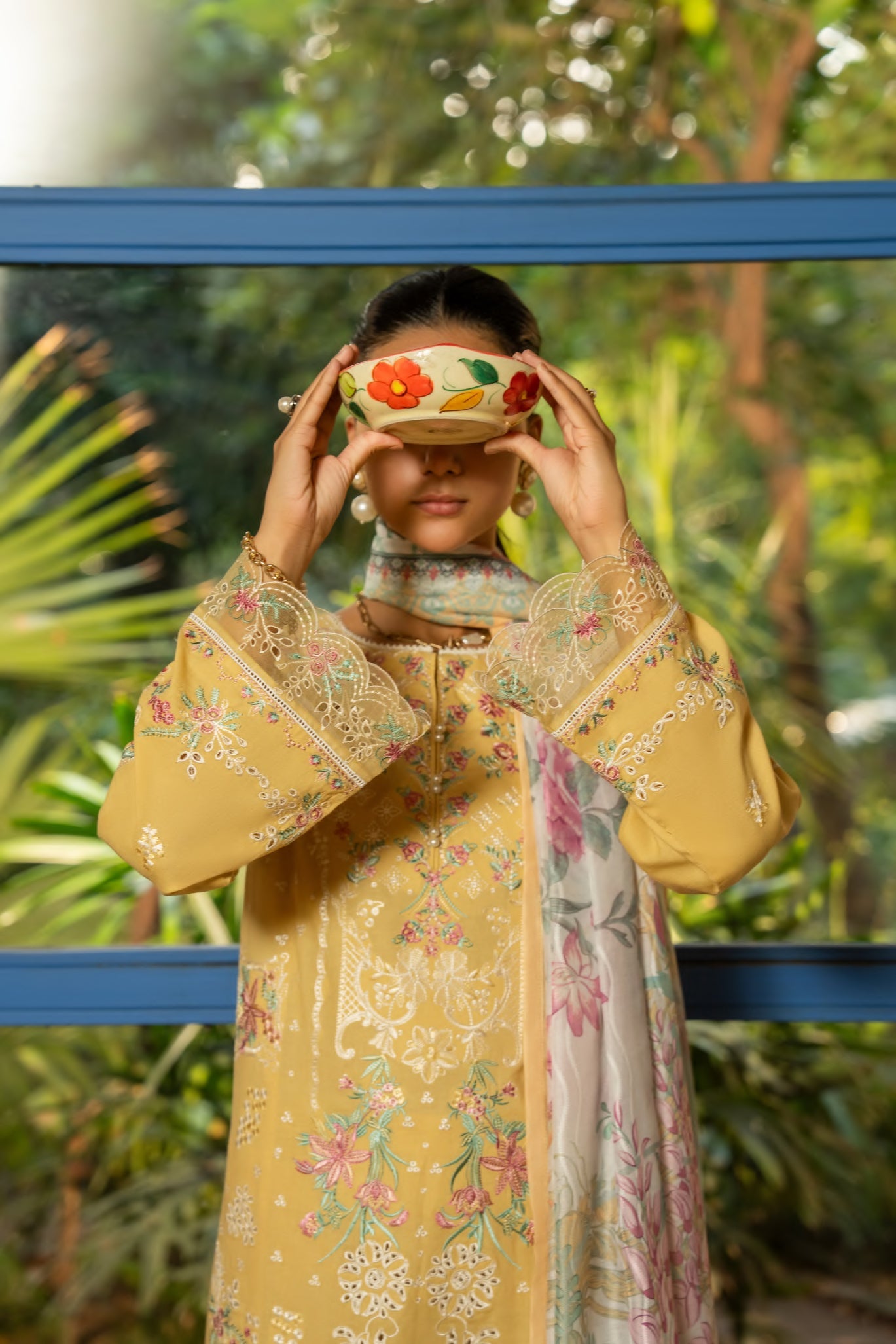 The kameez features delicate floral embroidery in soft pastel shades of pink, green, and white, beautifully accented with cutwork lace along the hem and sleeves, lending it an elegant and feminine charm.