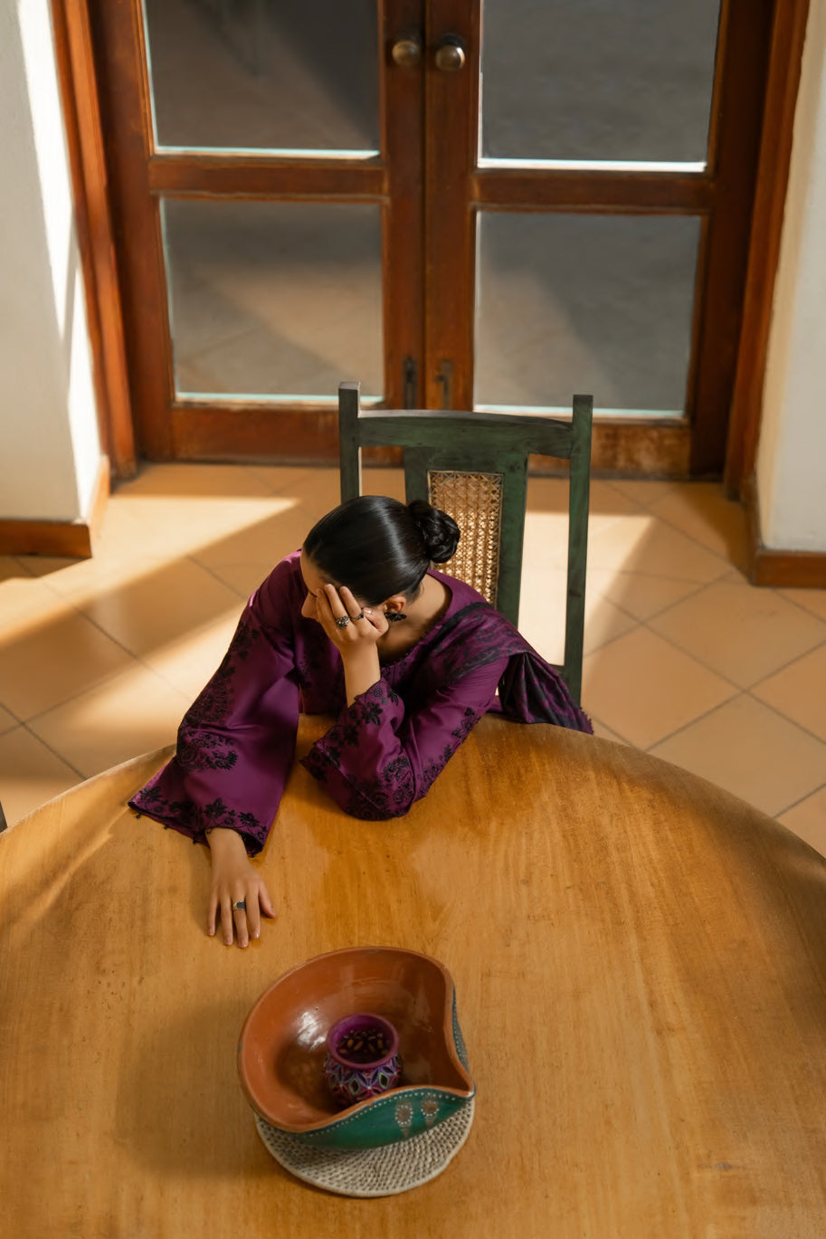 This outfit is a rich plum-toned ensemble that radiates sophistication with its striking contrast embroidery.