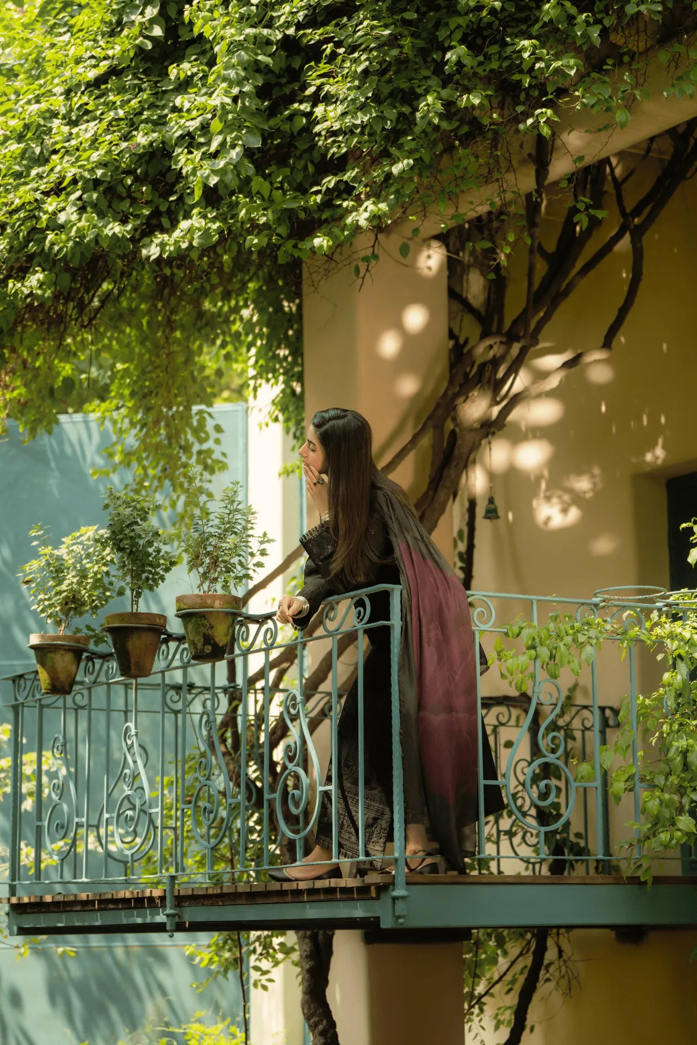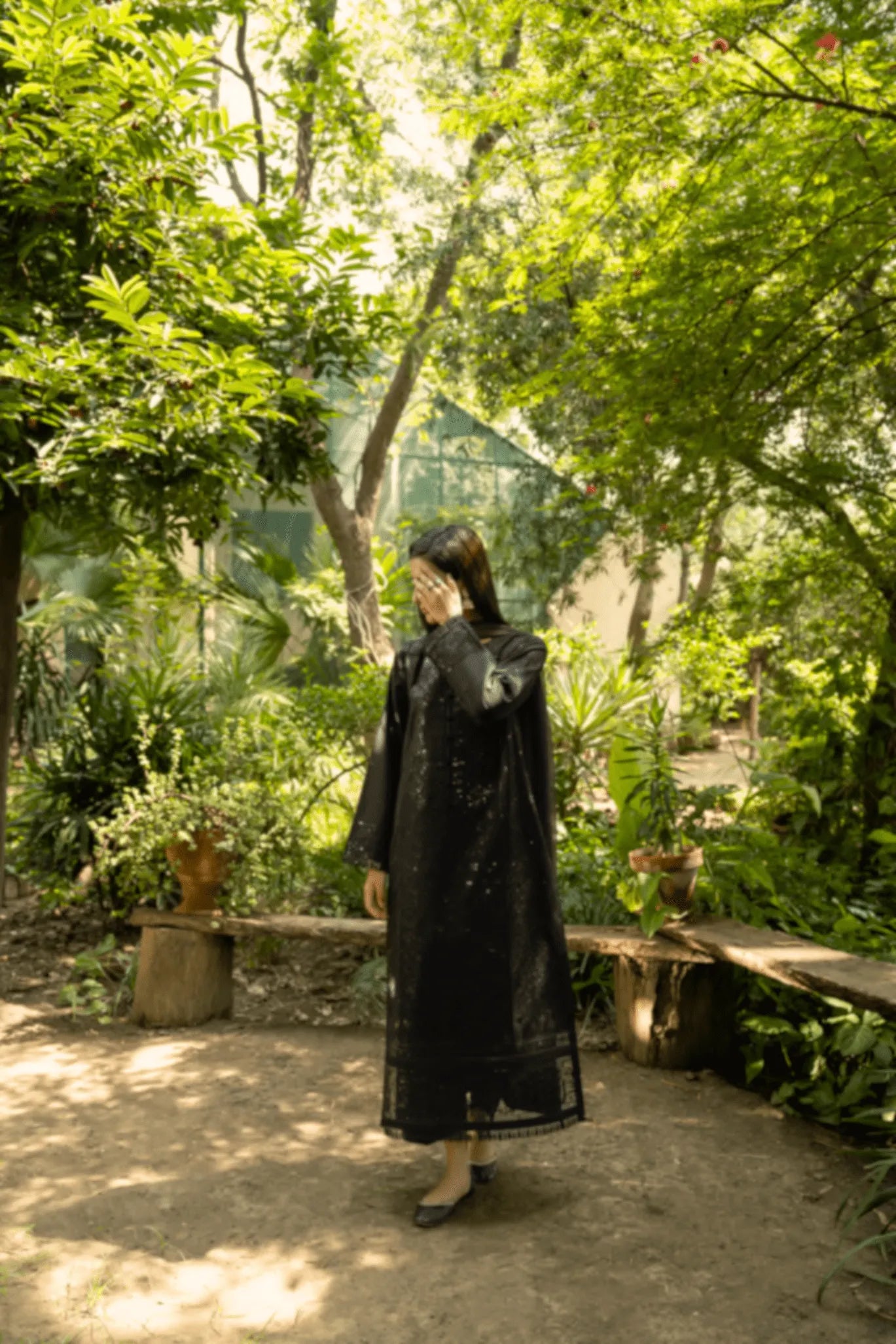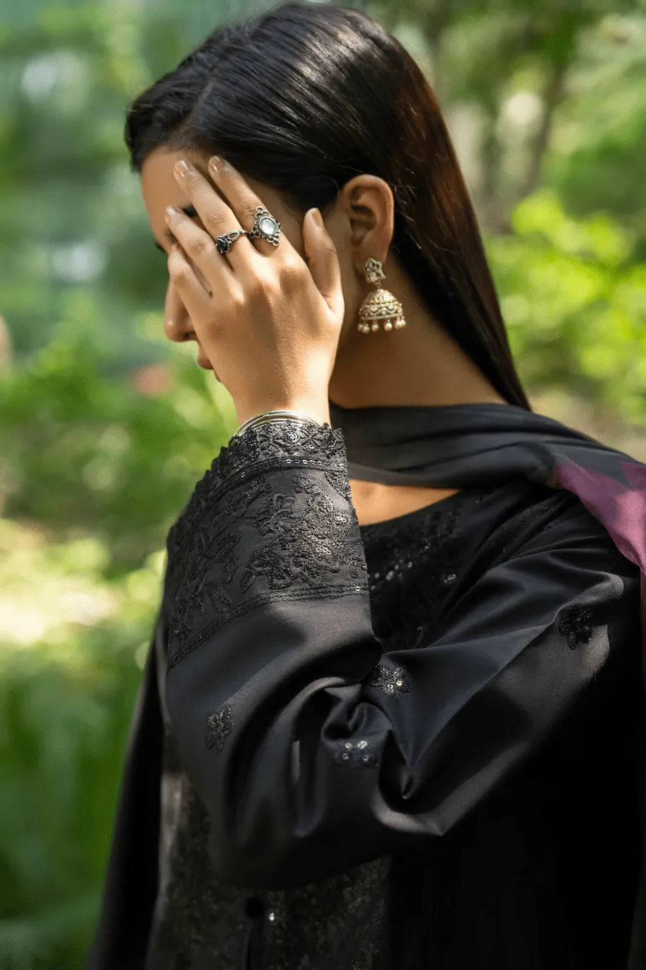 A black embroidered ensemble that beautifully blends quiet luxury with effortless grace. Subtle tonal embellishments lend depth and texture, reflecting light with an aura of understated elegance.