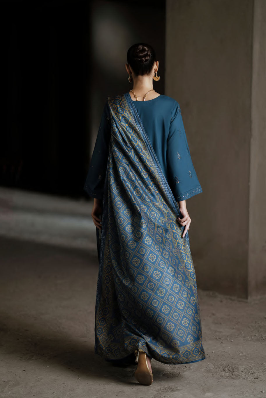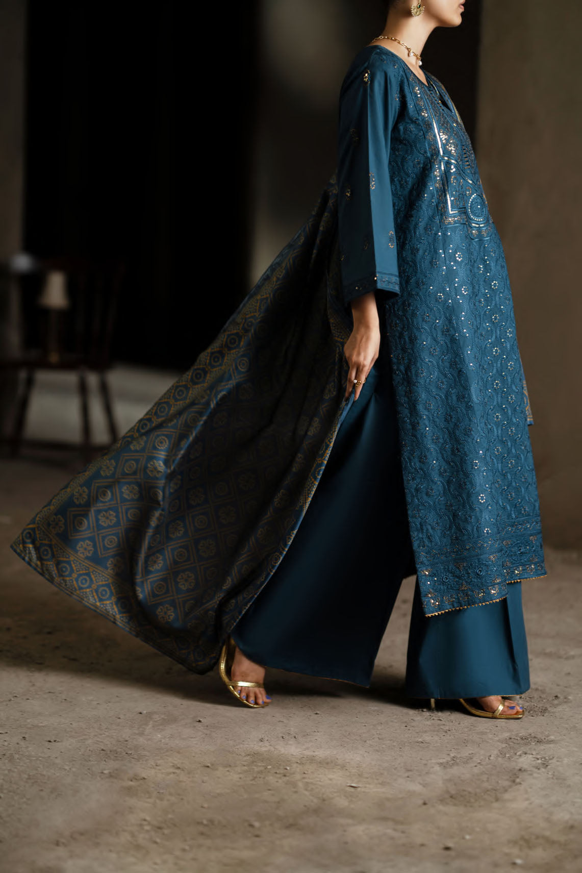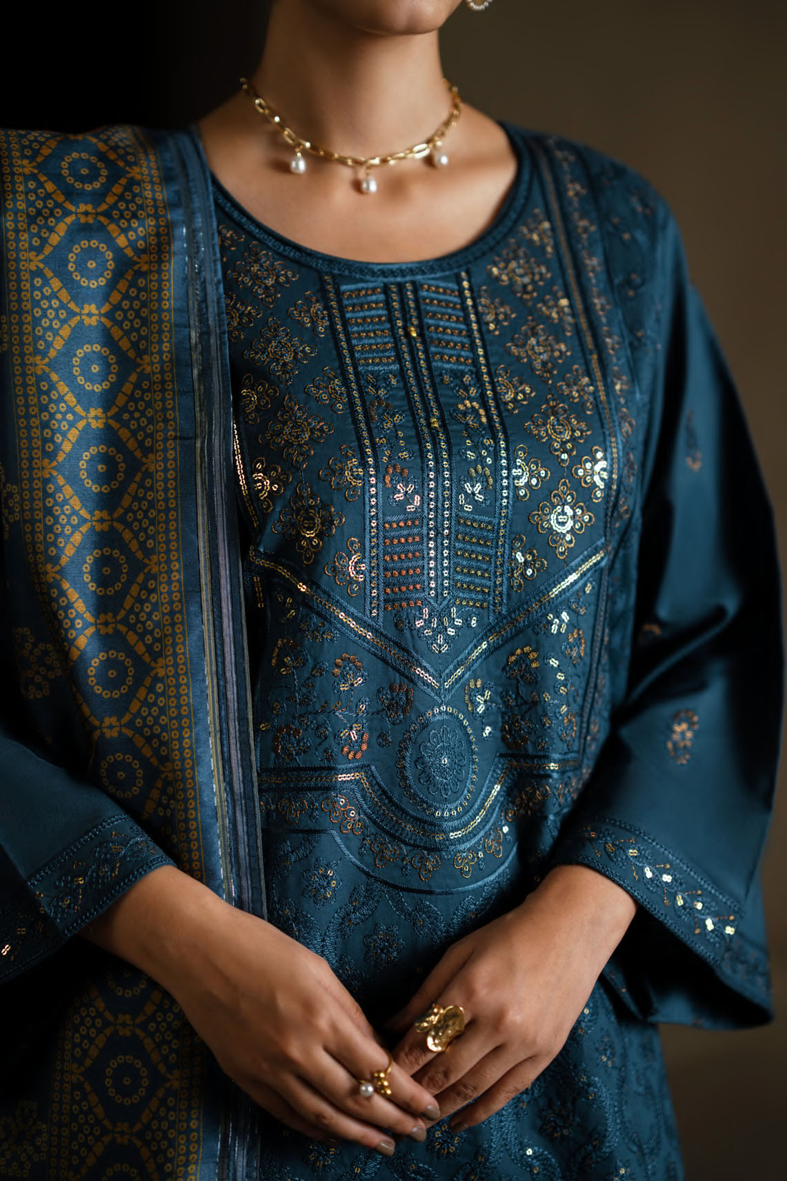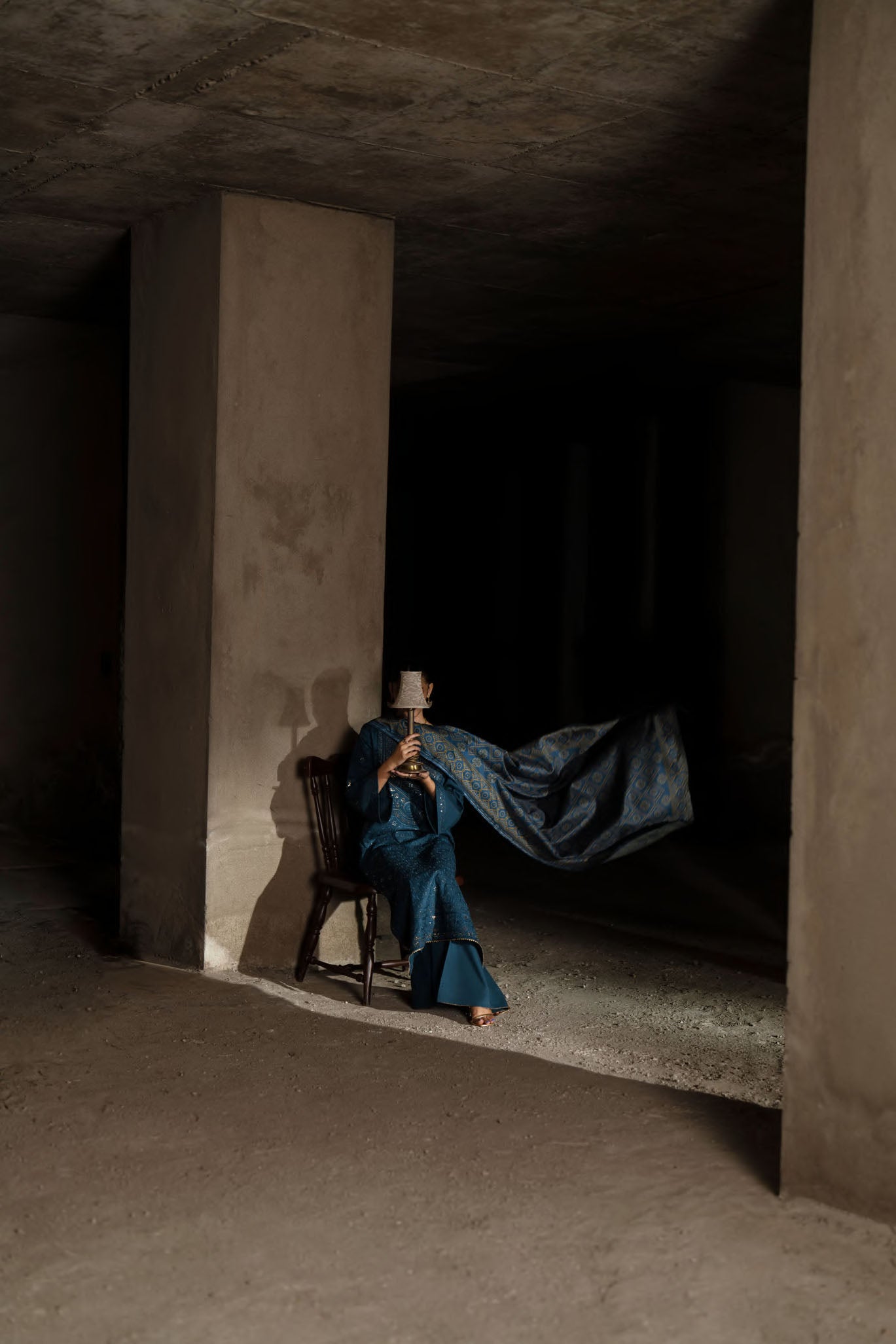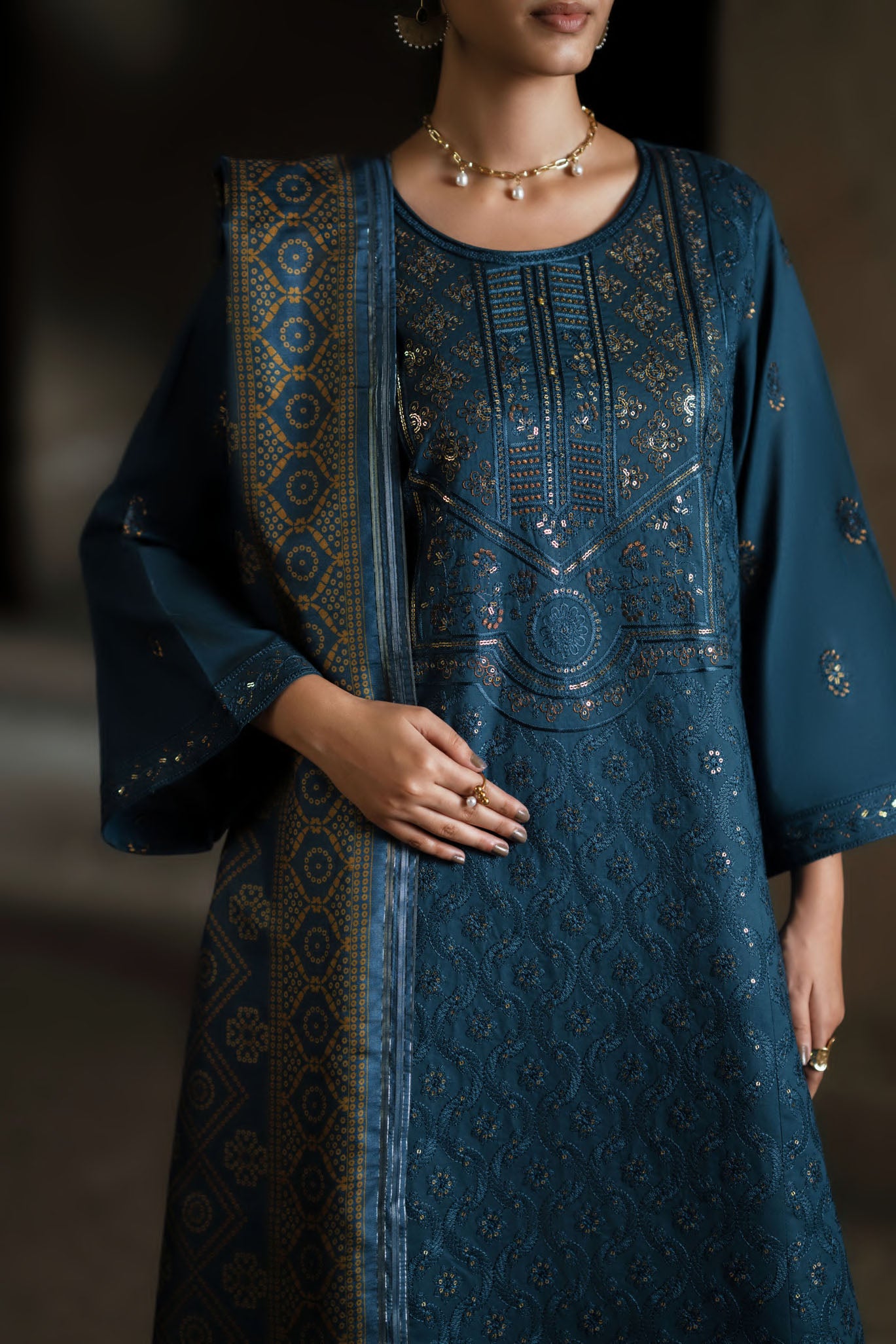 The long kurta is paired with a richly patterned teal and gold dupatta, featuring an intricate lattice design that elevates the ensemble’s grandeur. Wide-legged trousers add balance and fluidity, while the fabric’s natural sheen ensures a graceful play of light with every movement.