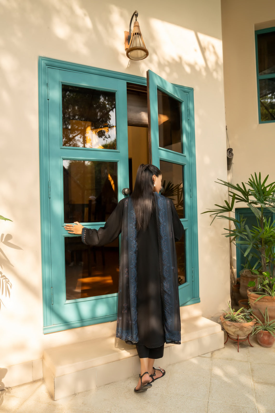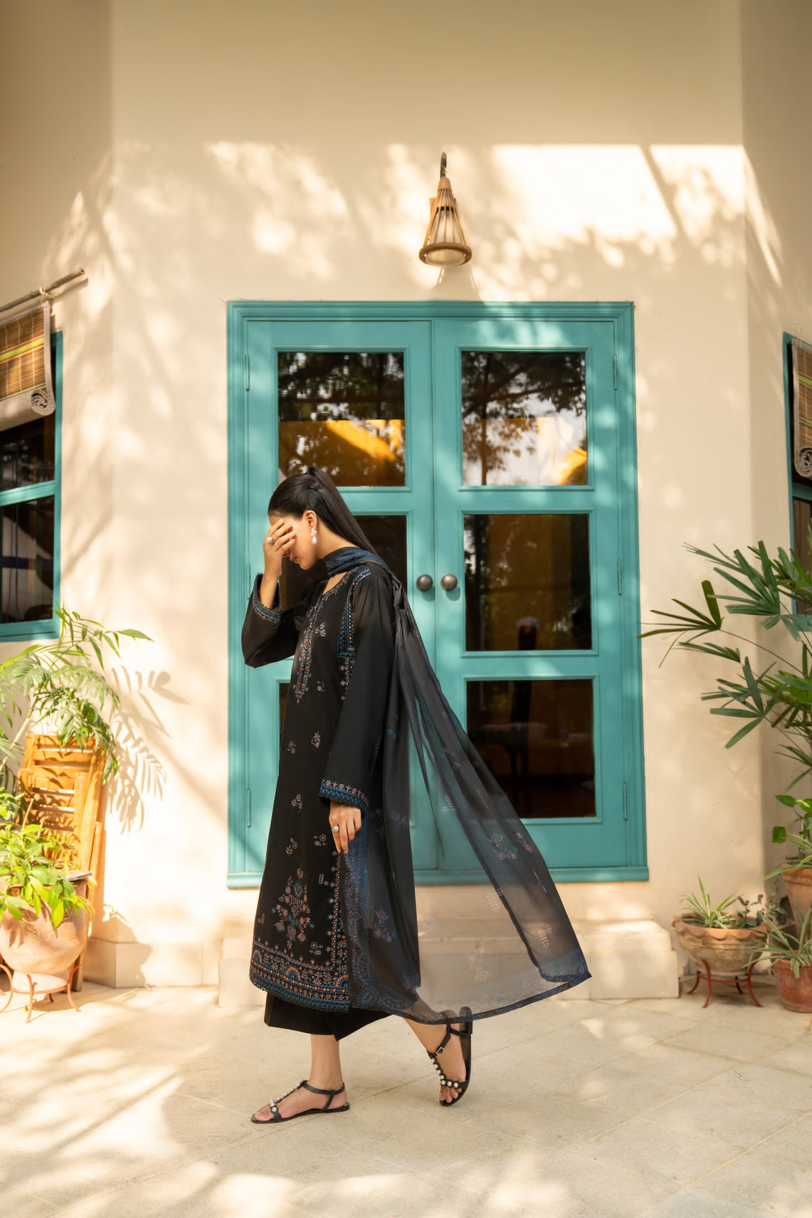 This outfit is a timeless black ensemble highlighted with intricate embroidery in rich shades of blue and copper.