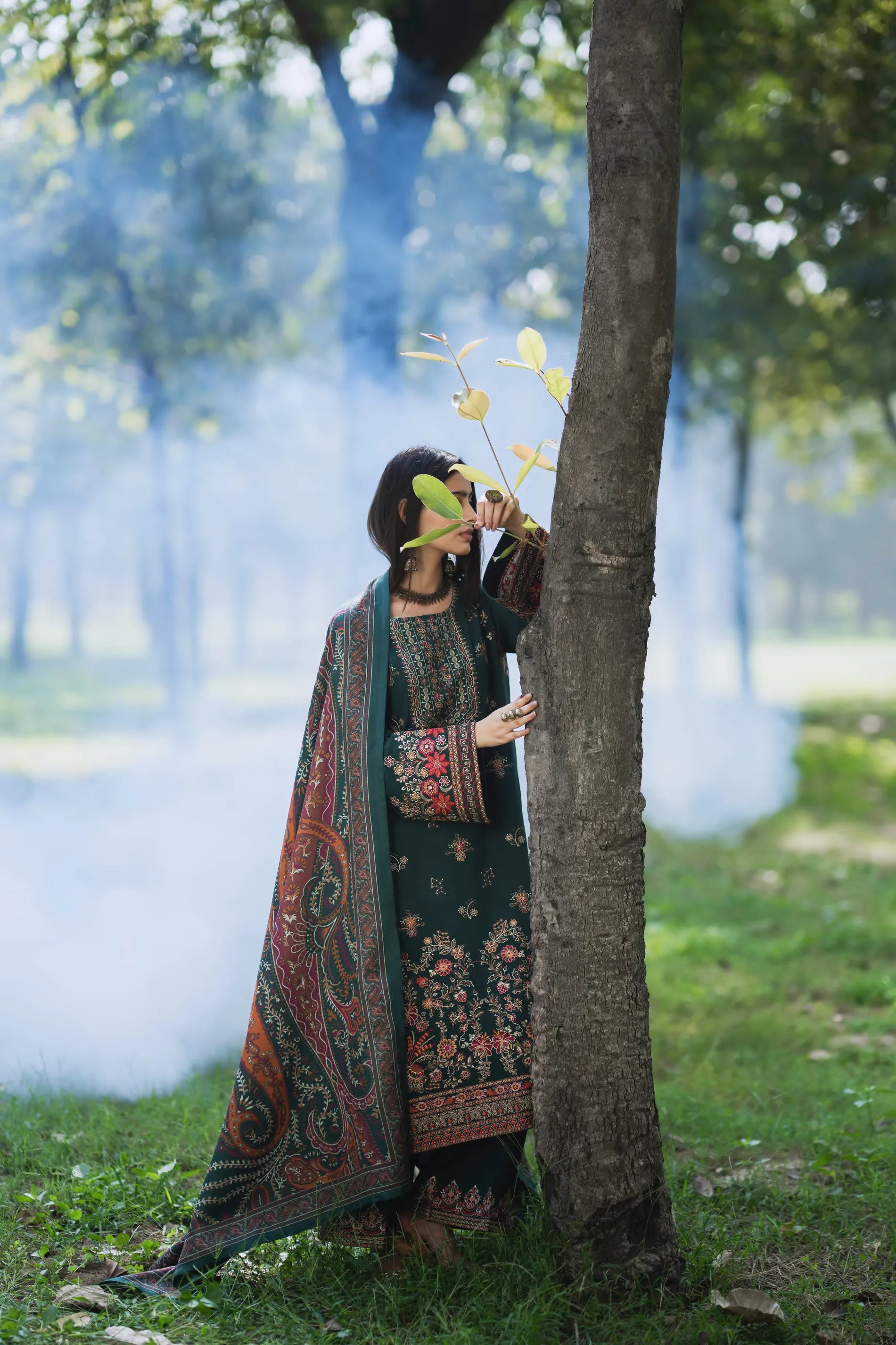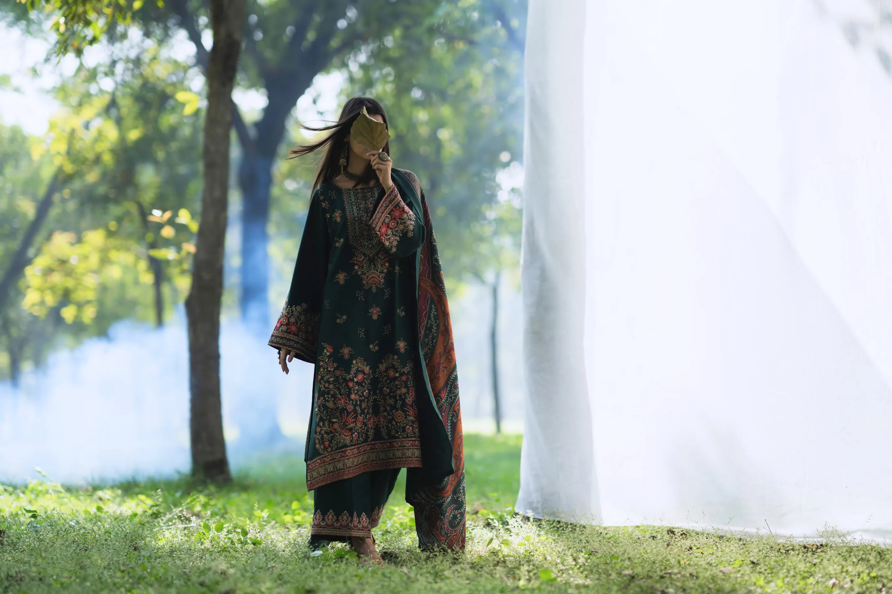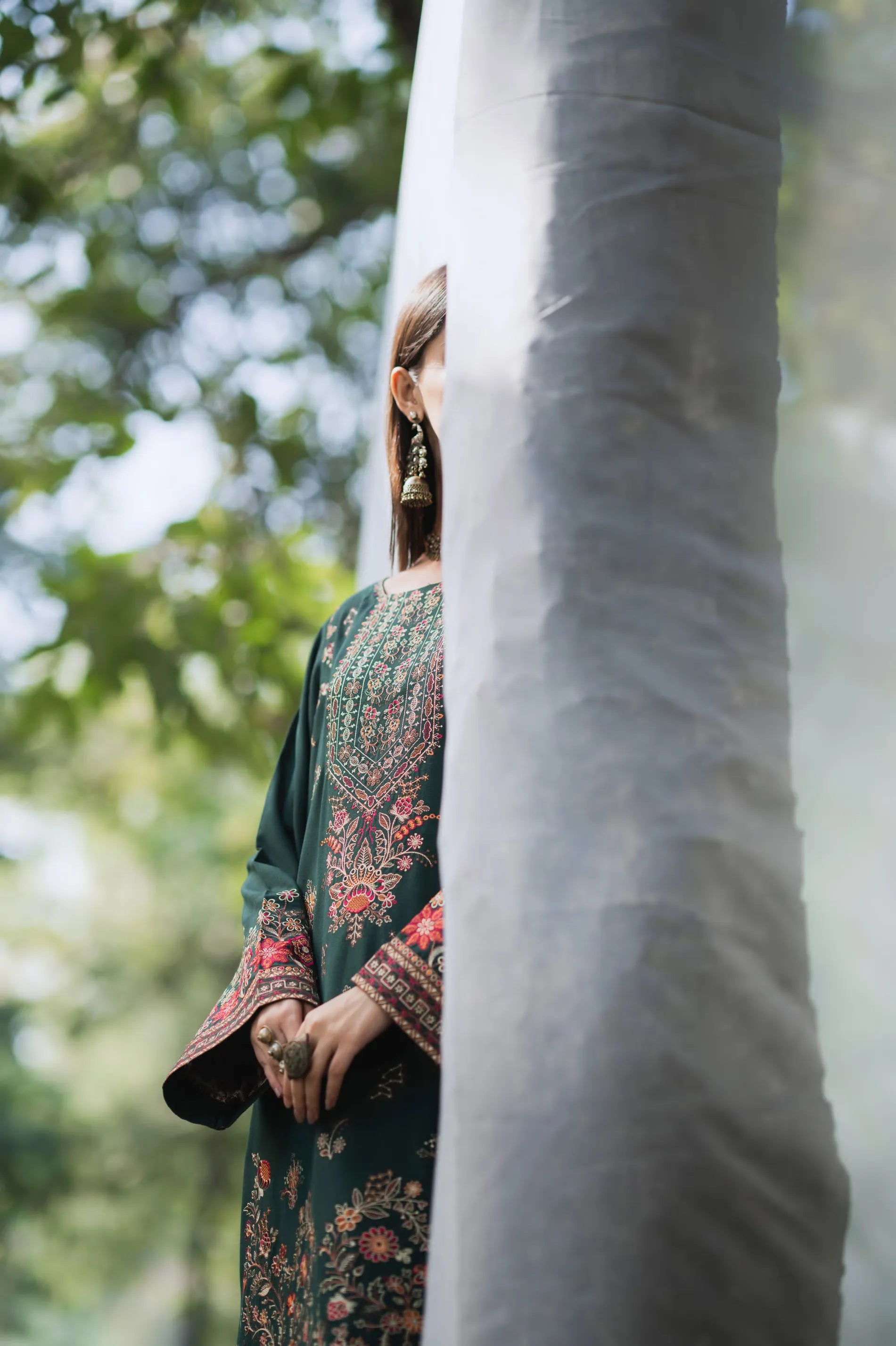 Verdigris Aria is a deep-forest three-piece that brings winter warmth with a refined, heritage feel.The straight kurta carries intricate multicolor florals and fine borders that elongate the frame, while the matching trousers finish with ornate hem embroidery for balance.