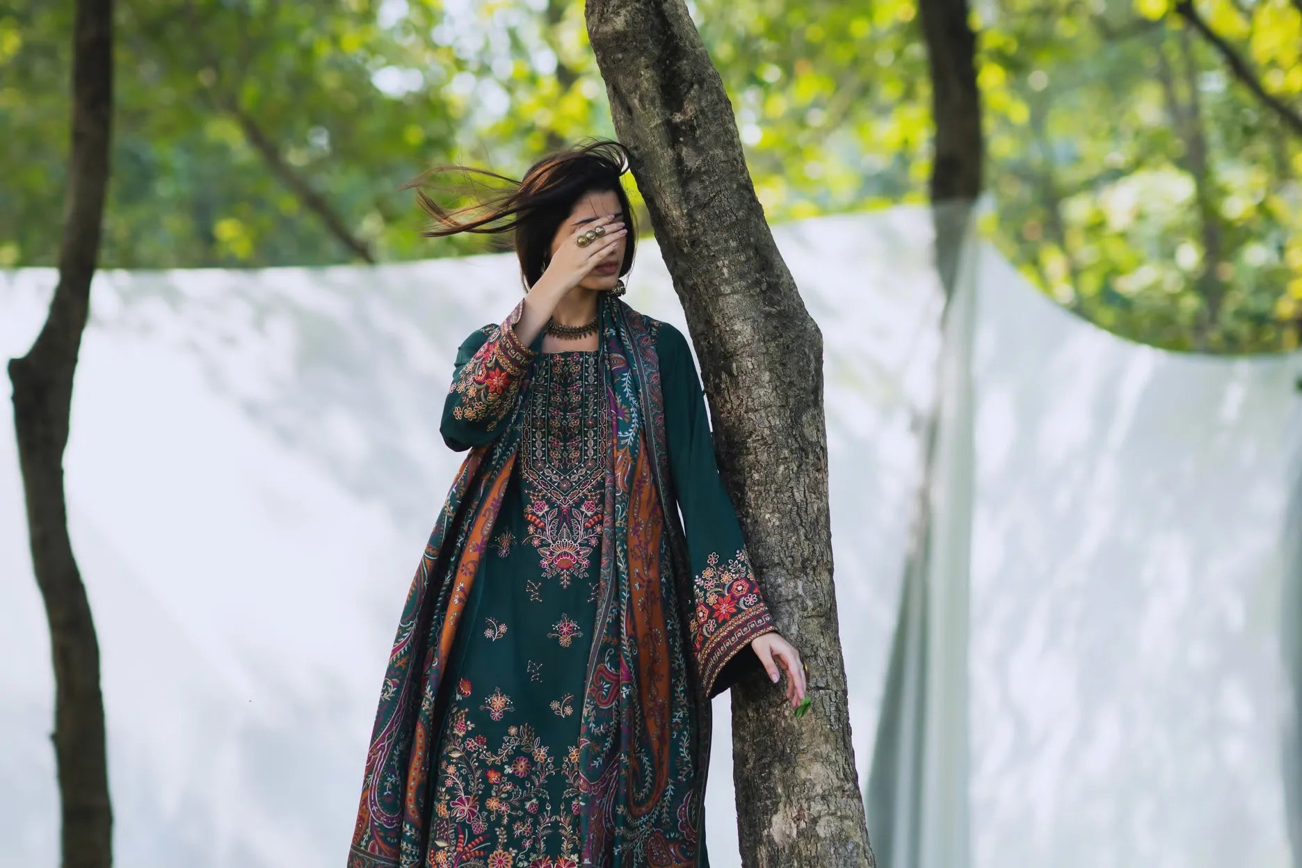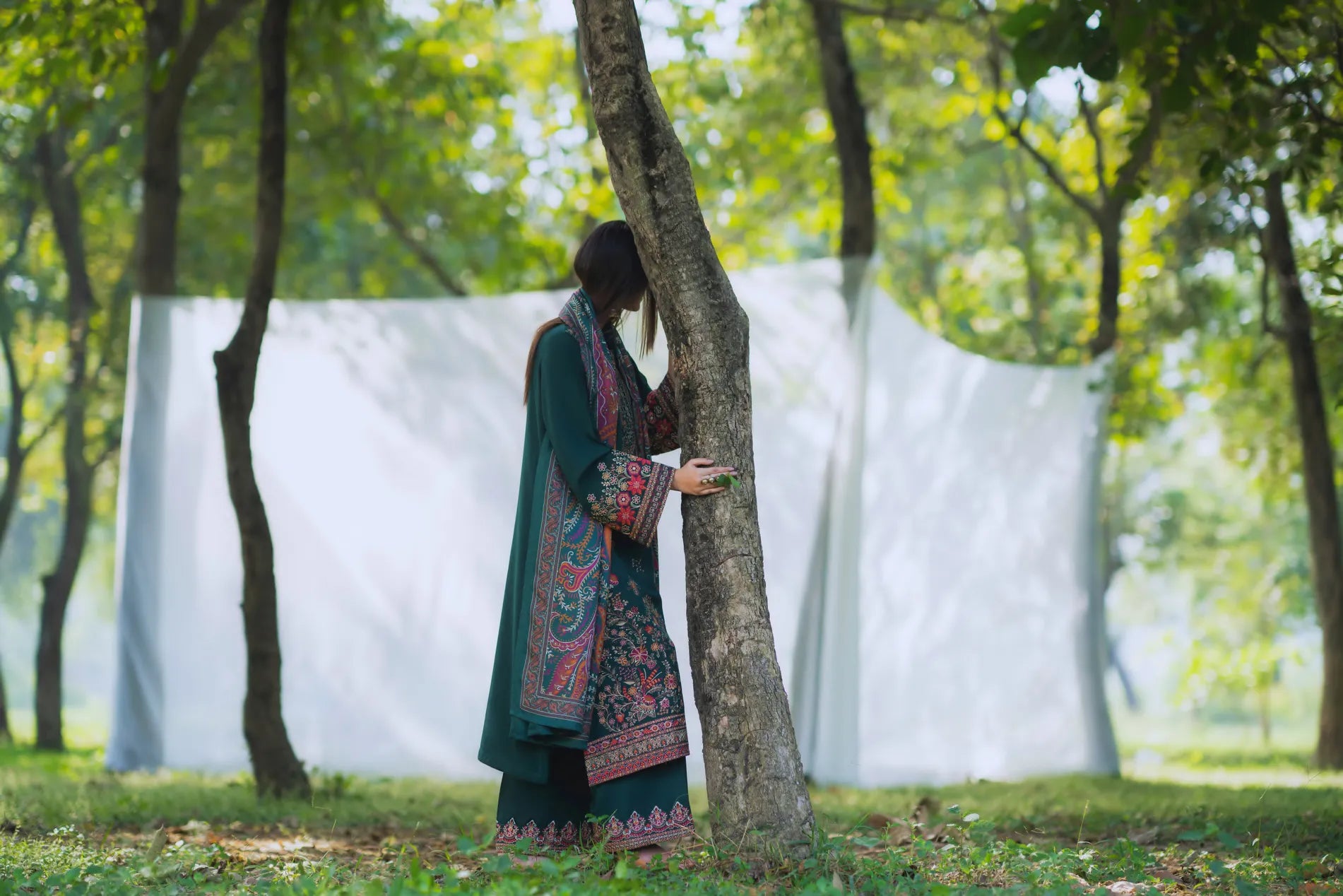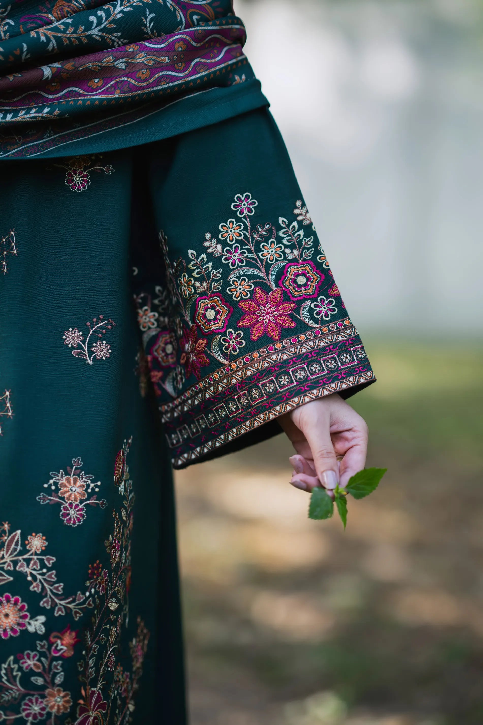Verdigris Aria is a deep-forest three-piece that brings winter warmth with a refined, heritage feel.The straight kurta carries intricate multicolor florals and fine borders that elongate the frame, while the matching trousers finish with ornate hem embroidery for balance.