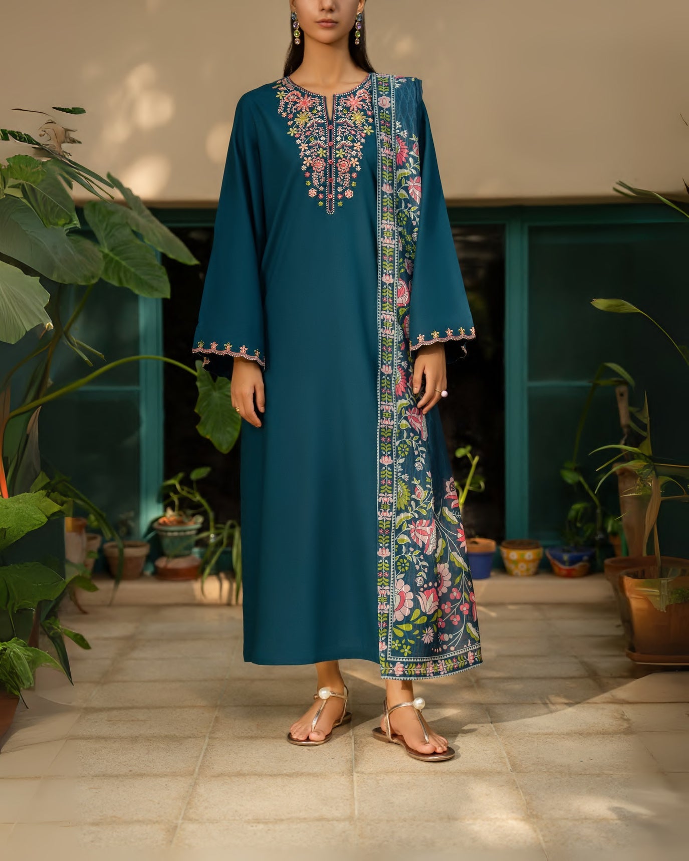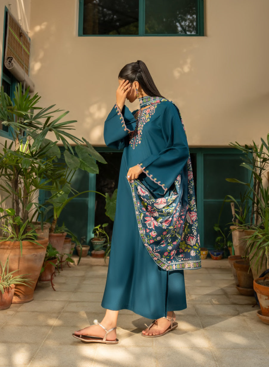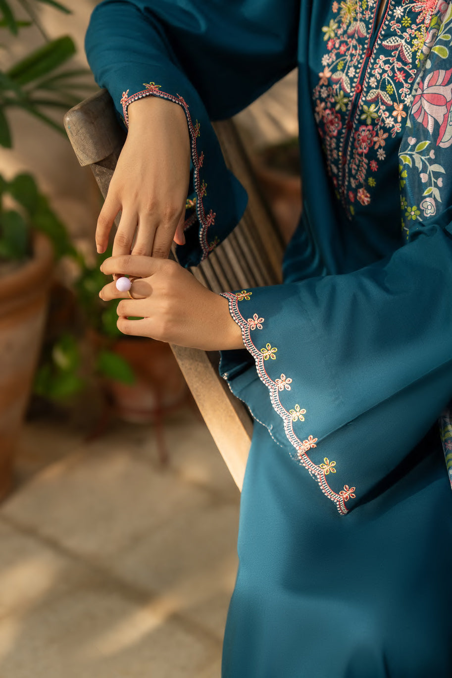 This outfit is a graceful teal ensemble that radiates understated elegance with vibrant detailing.