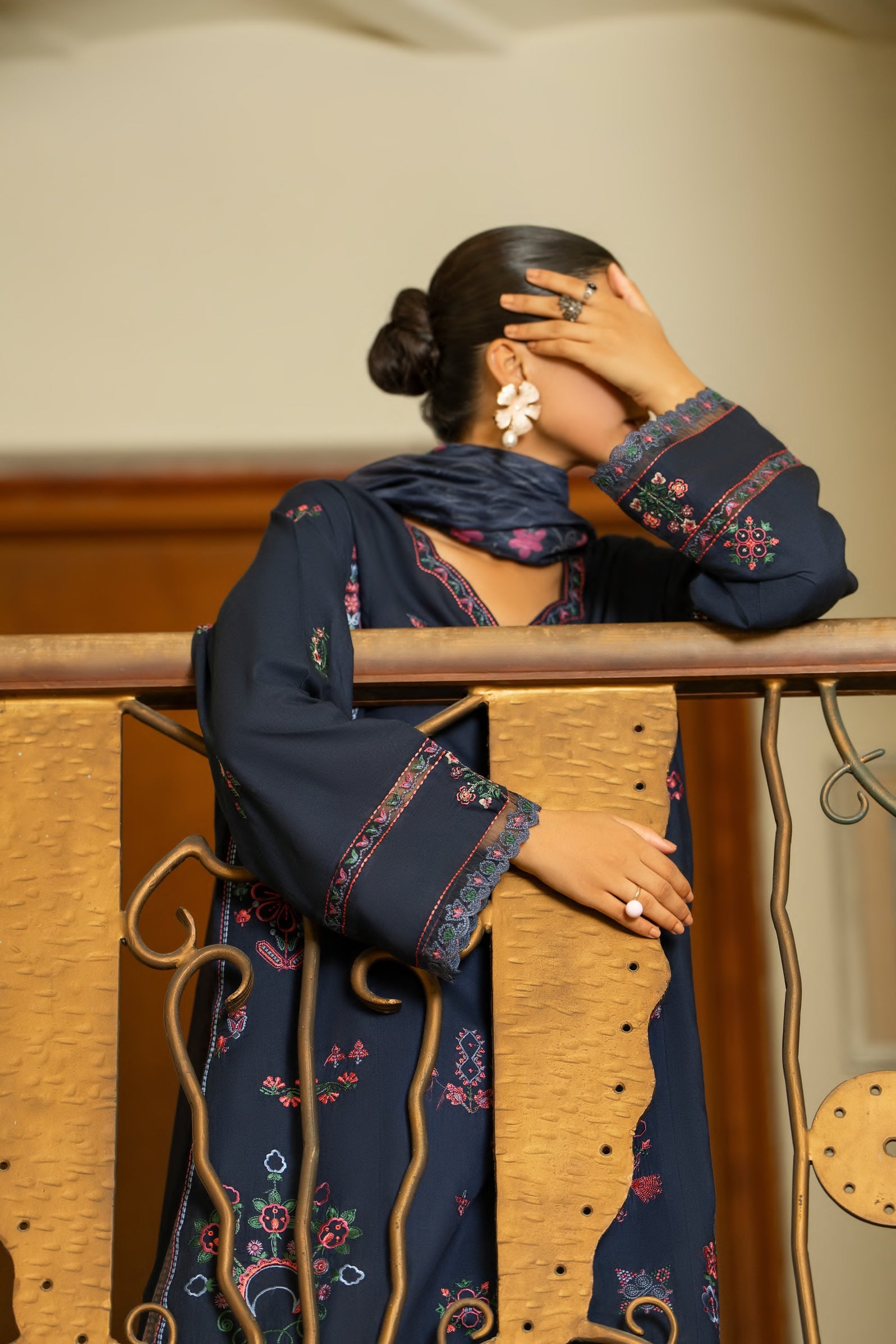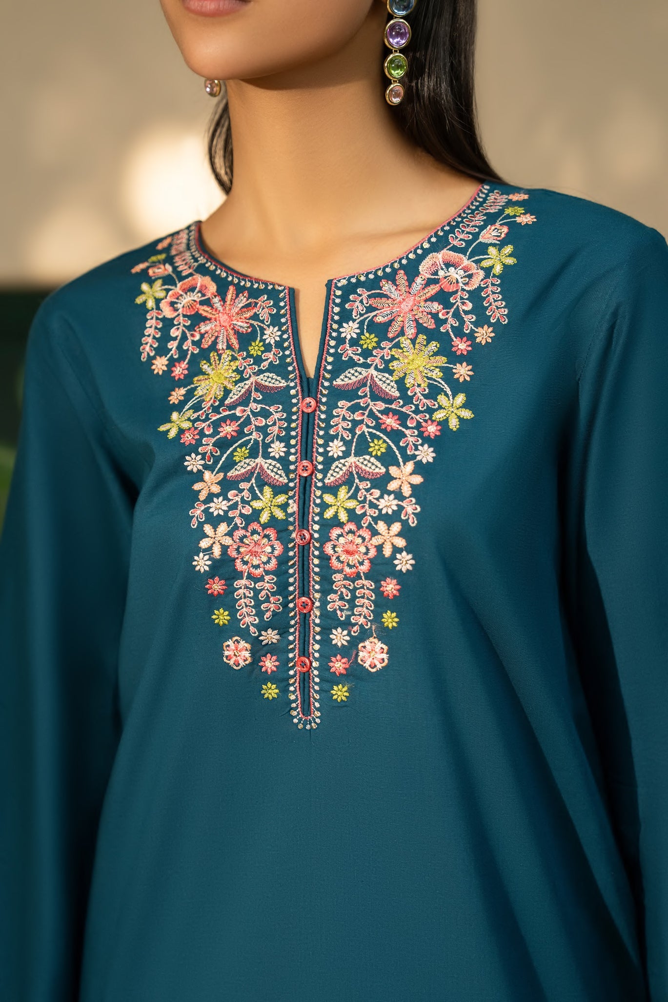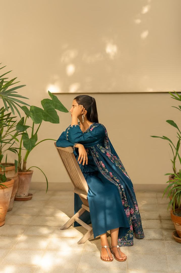 This outfit is a graceful teal ensemble that radiates understated elegance with vibrant detailing.