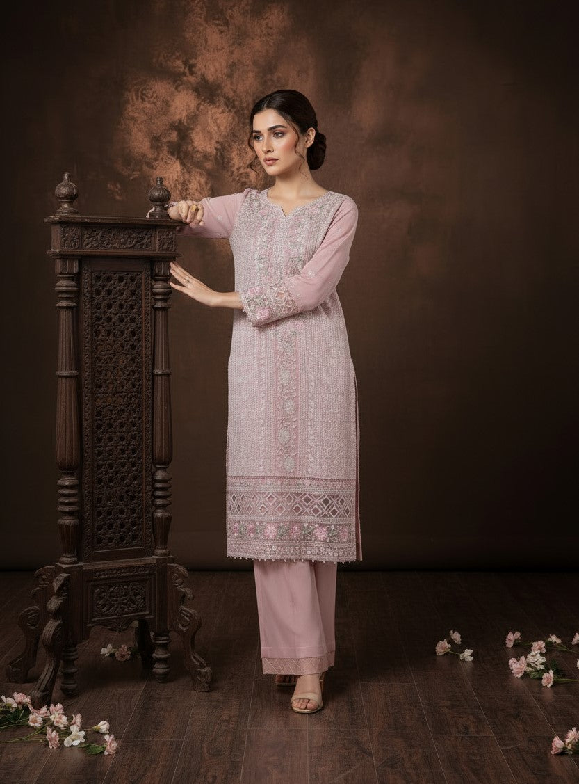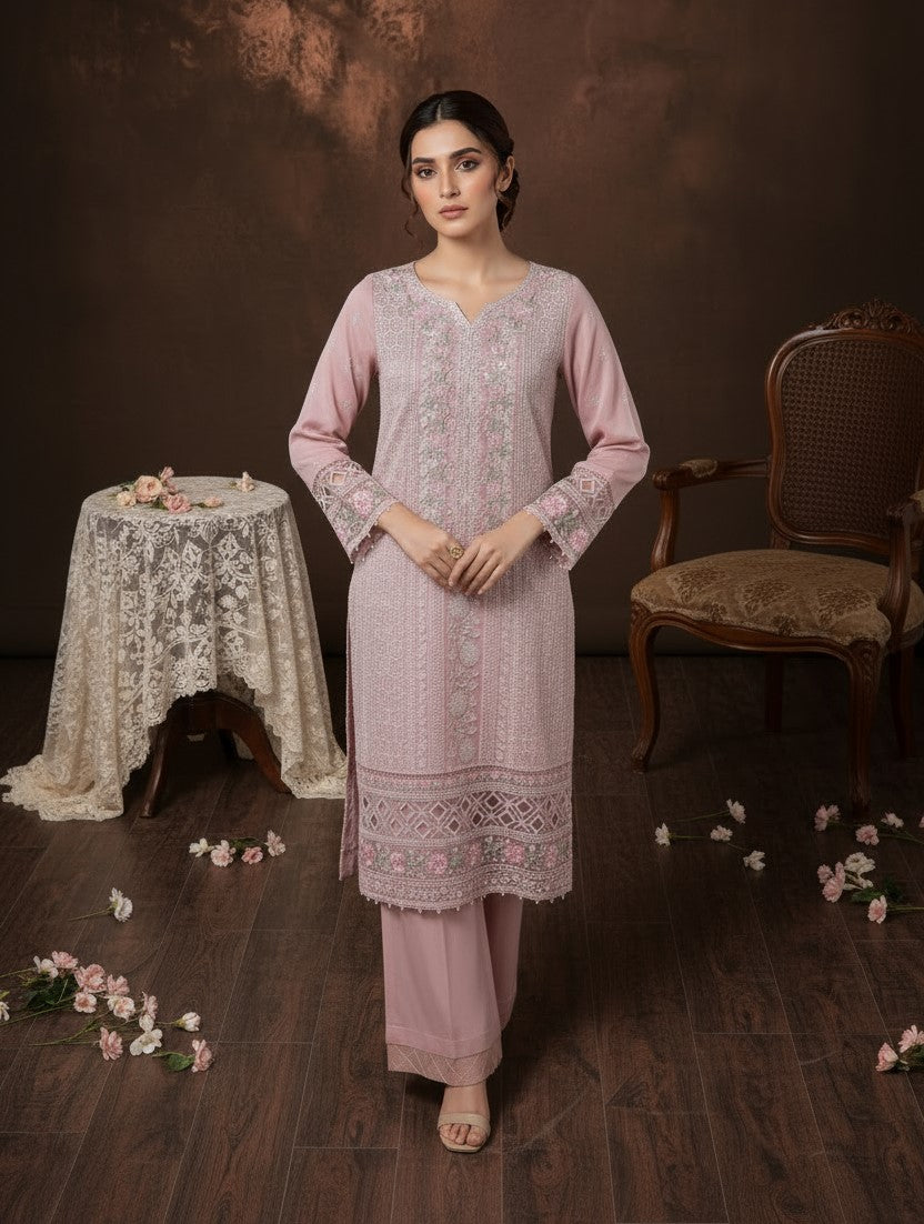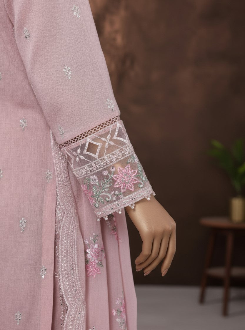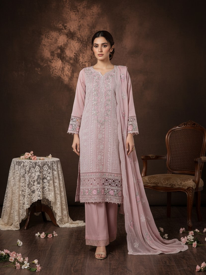 A timeless masterpiece by Sada Bahar, crafted on pure chiffon fabric featuring exquisite thread work, sequins, tilla, and delicate pearl embellishments. The chiffon dupatta mirrors the same intricate craftsmanship, adding a graceful charm to the outfit. Paired with a Russian viscose trouser, this ensemble beautifully blends elegance and sophistication — perfect for any festive or formal occasion.