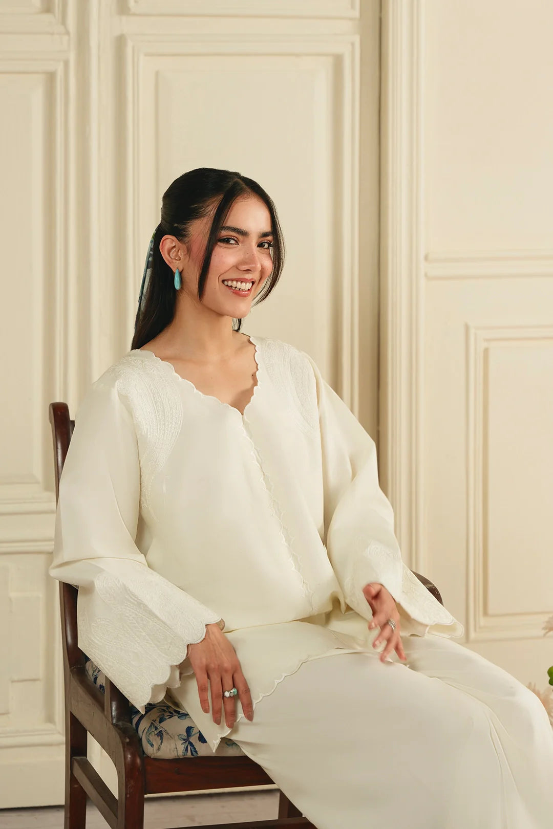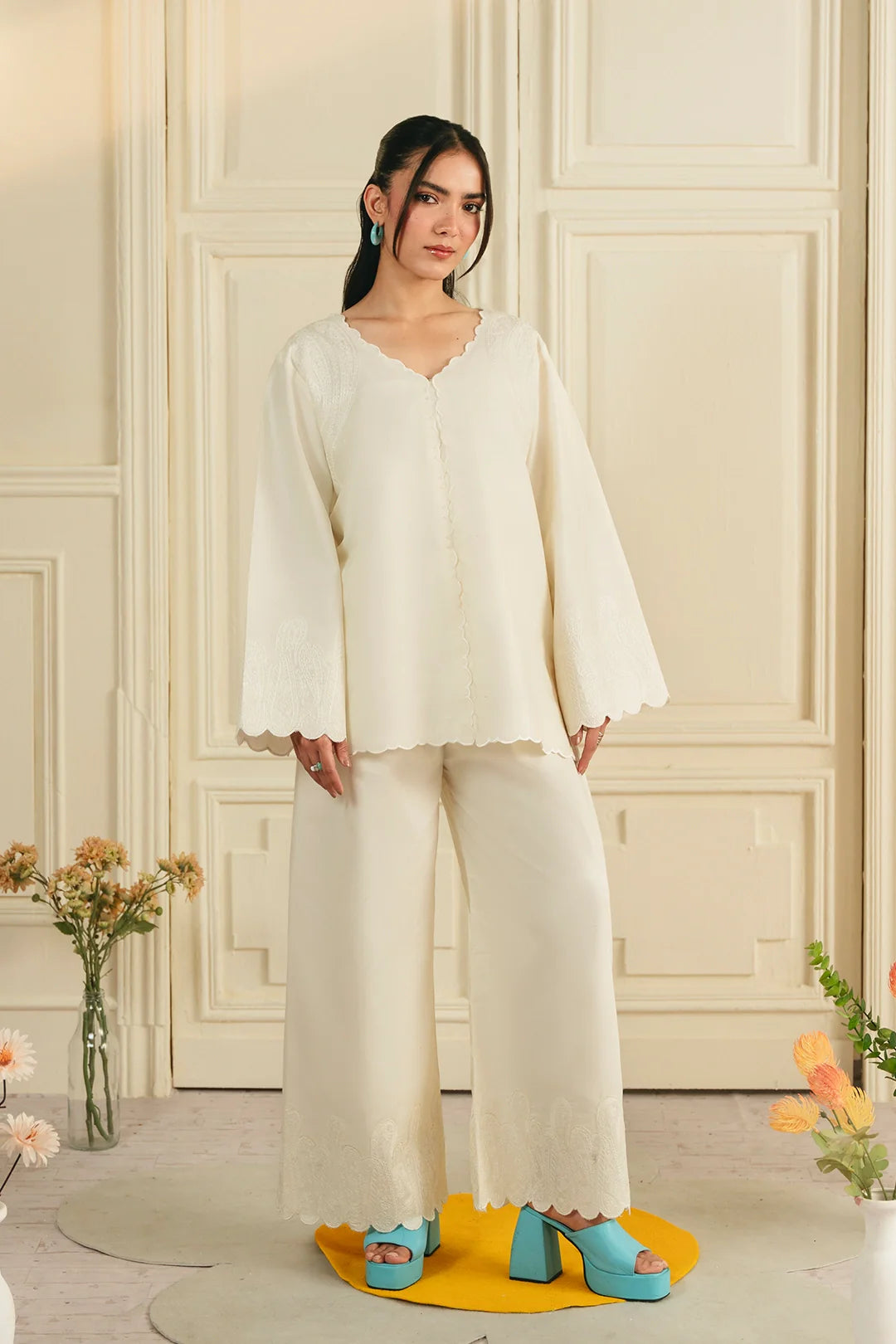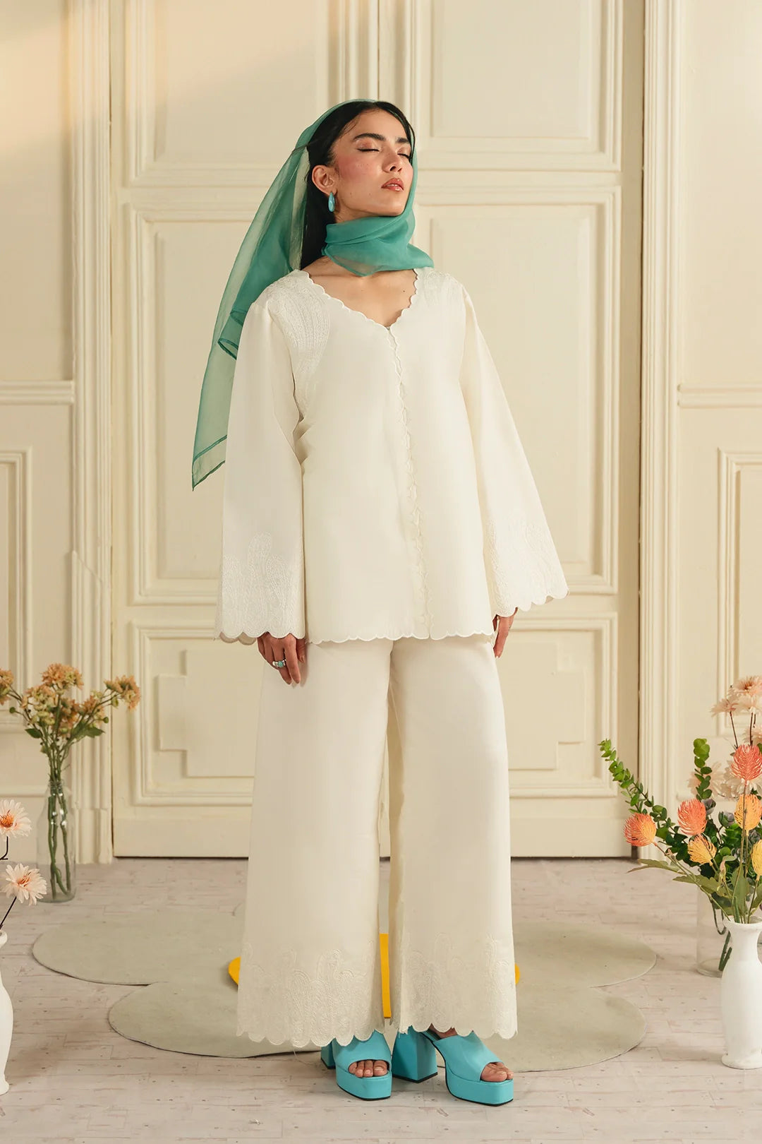 • An elegant white-on-white two-piece ensemble featuring a short shirt with a delicately embroidered shoulder motif, embroidered sleeves, and scalloped detailing at the center front. Paired with matching embroidered trousers, this design offers a timeless and graceful appeal.