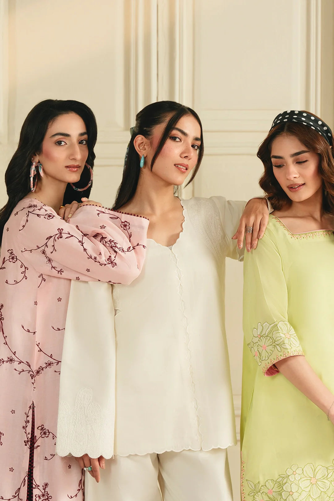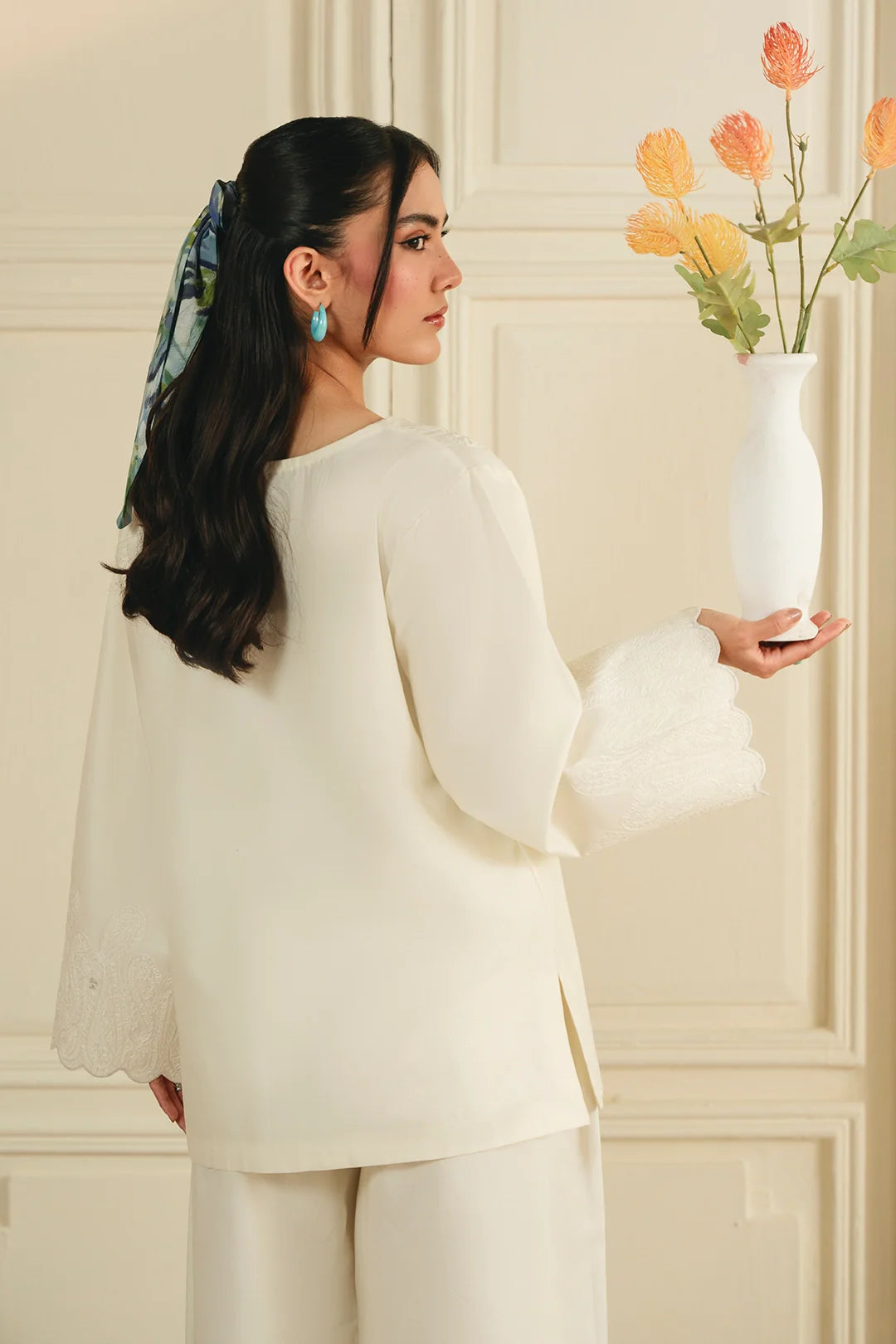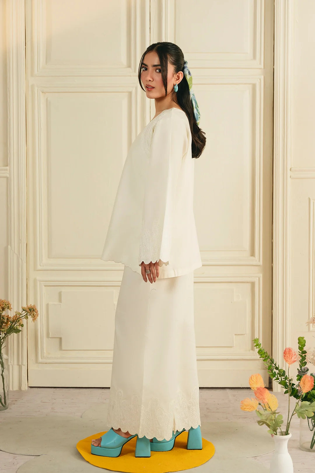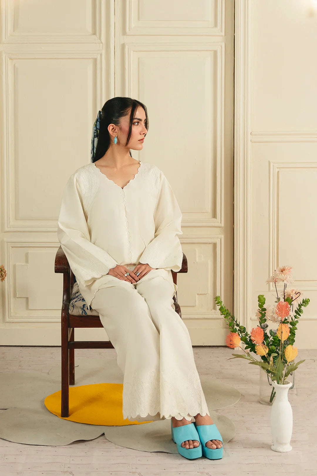 • An elegant white-on-white two-piece ensemble featuring a short shirt with a delicately embroidered shoulder motif, embroidered sleeves, and scalloped detailing at the center front. Paired with matching embroidered trousers, this design offers a timeless and graceful appeal.