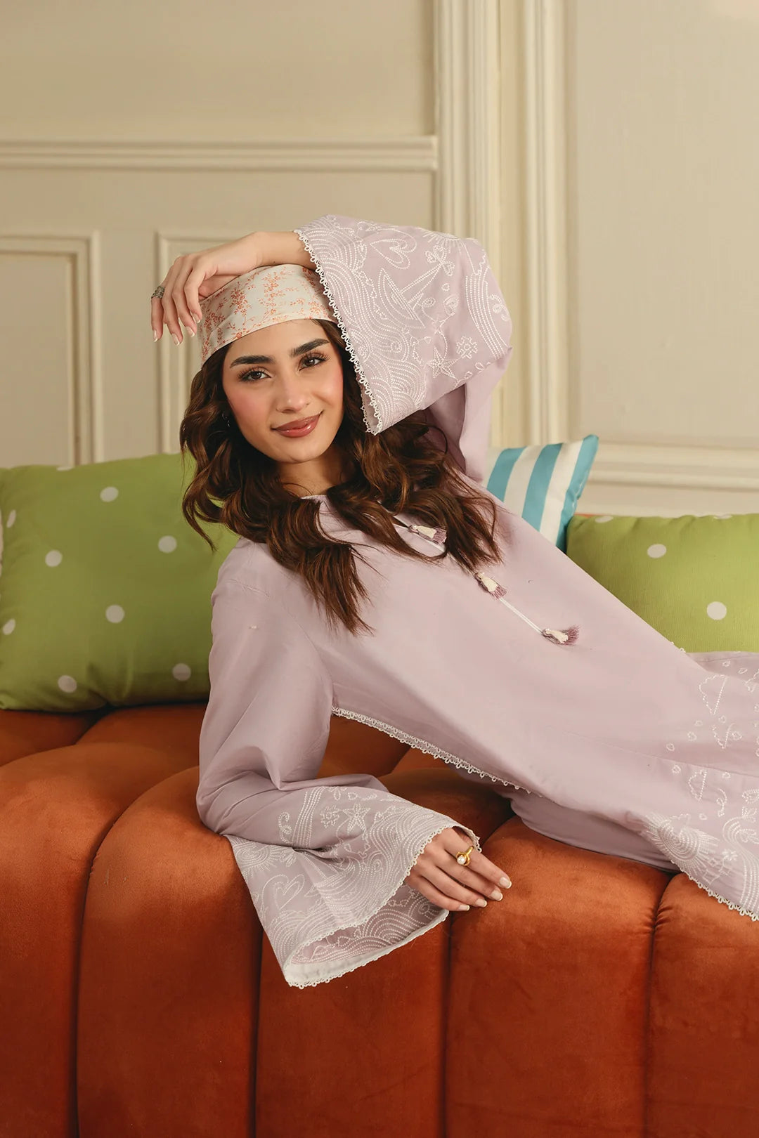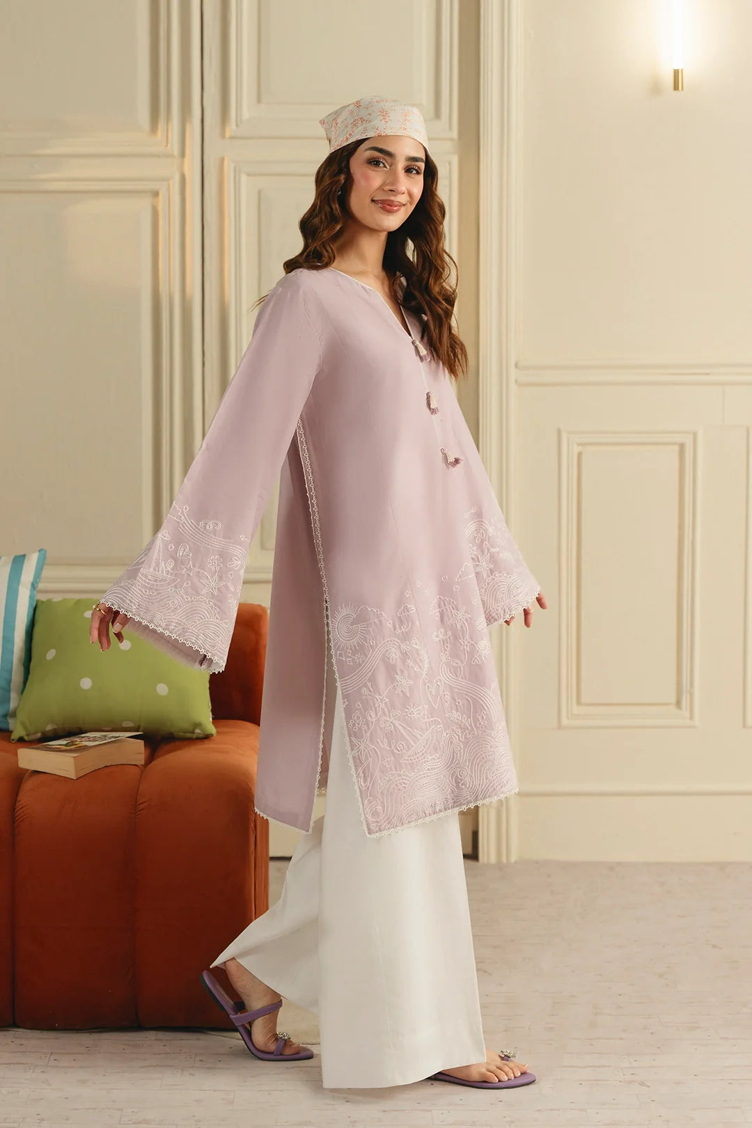 • A charming two-piece ensemble featuring an embroidered lilac shirt accented with a modern wide doodling pattern along the hem and sleeves, creating a youthful and playful appeal. Paired with classic white wide-leg trousers, this look offers a fresh and girly aesthetic.