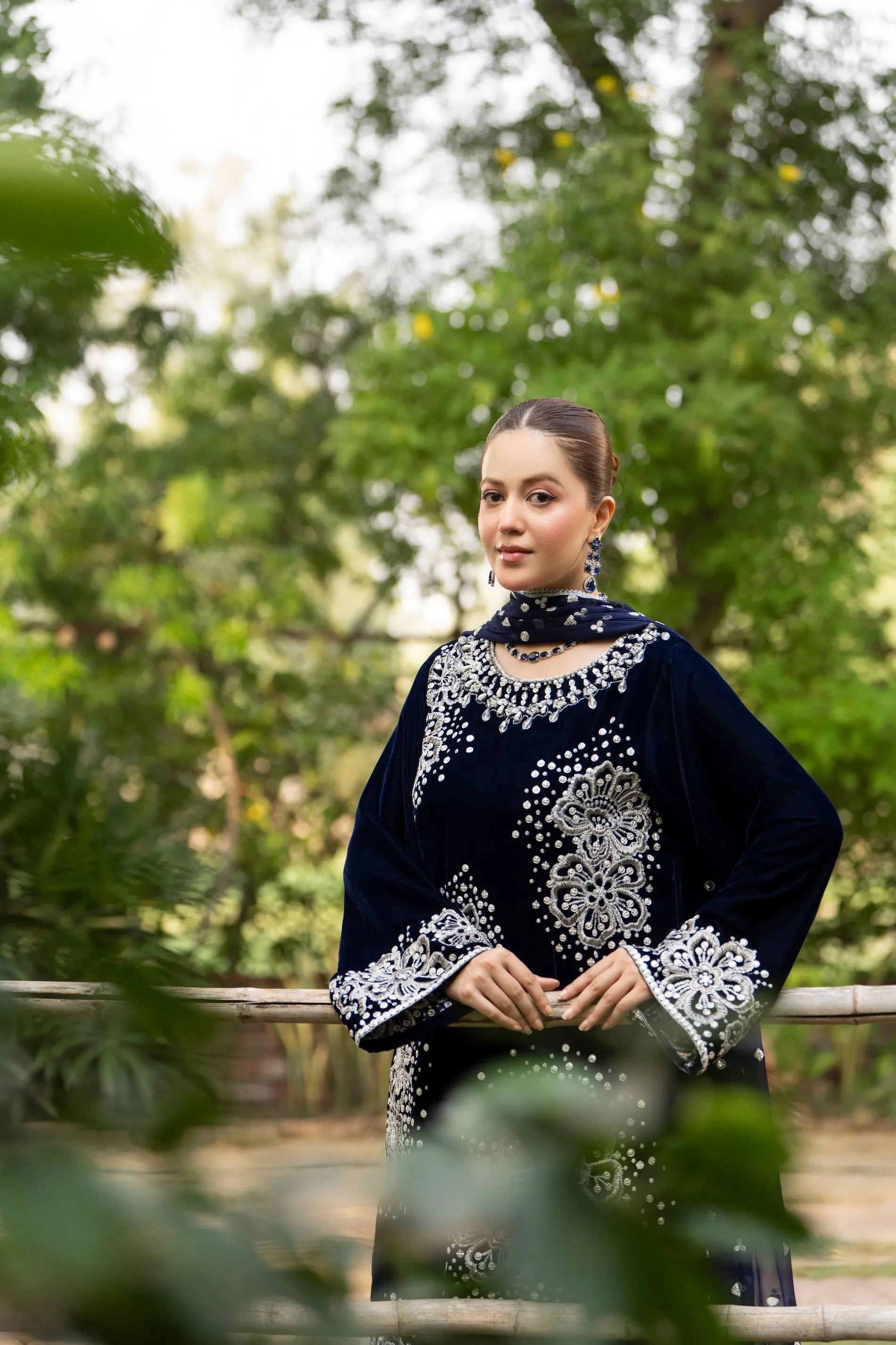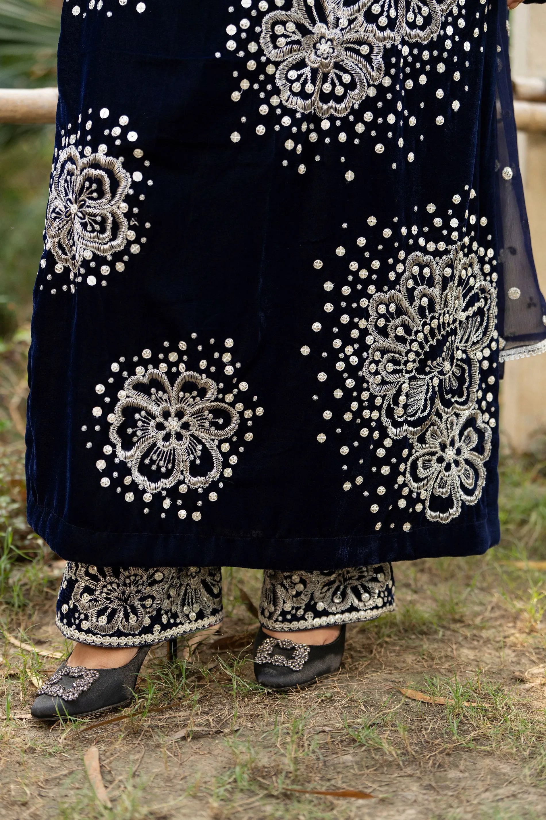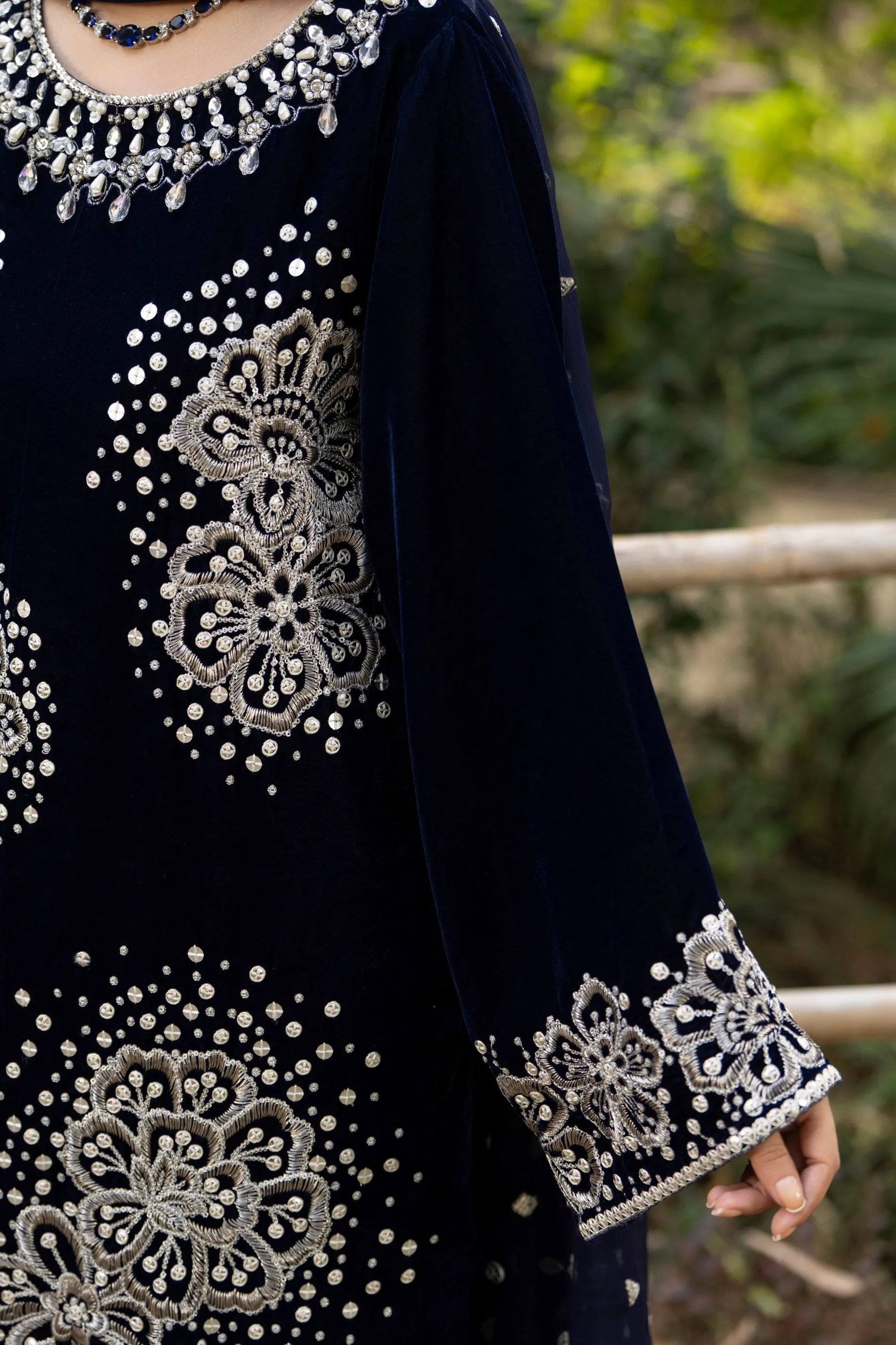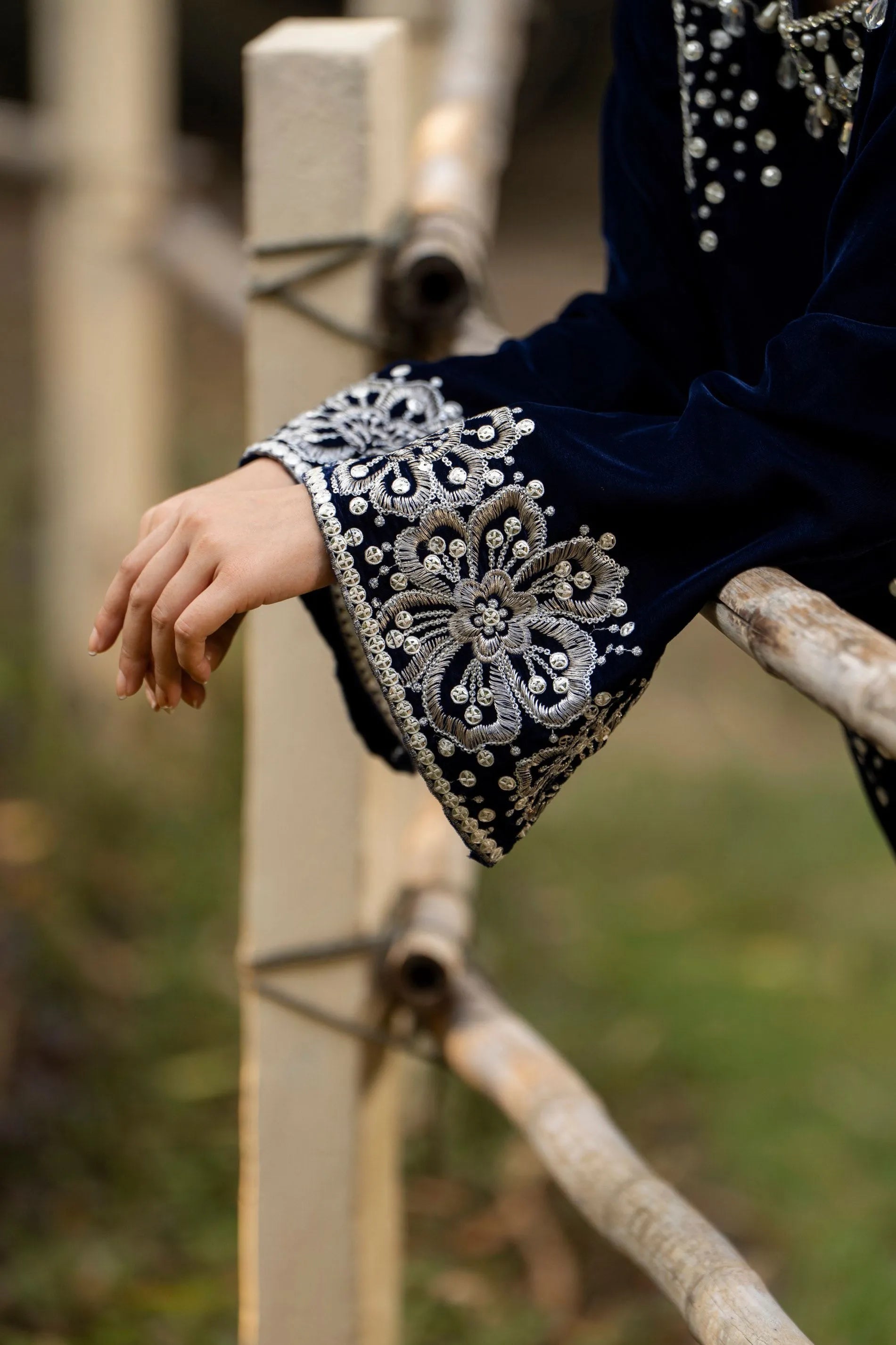 Embroidered Long Velvet Shirt with Adda Work on Neckline