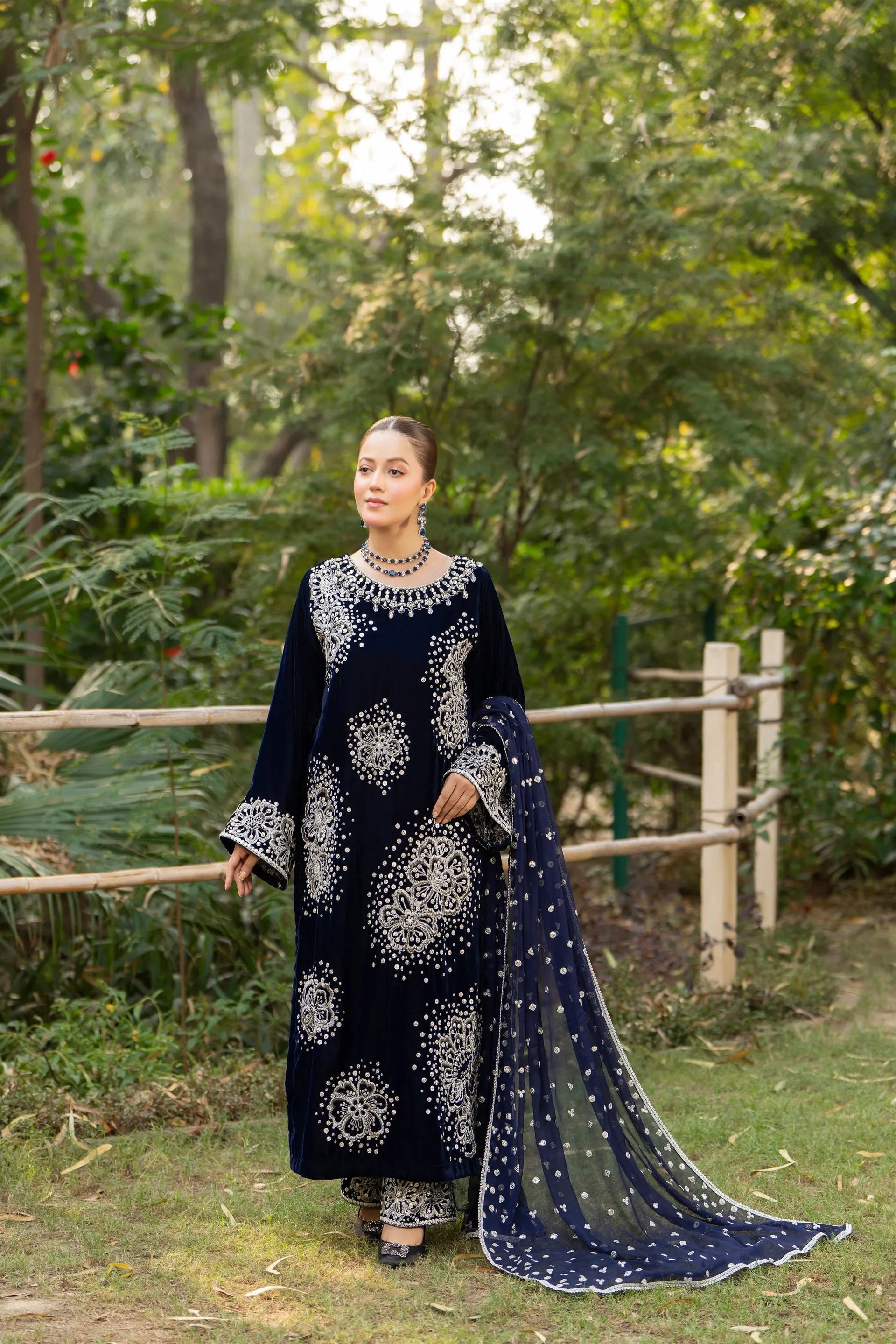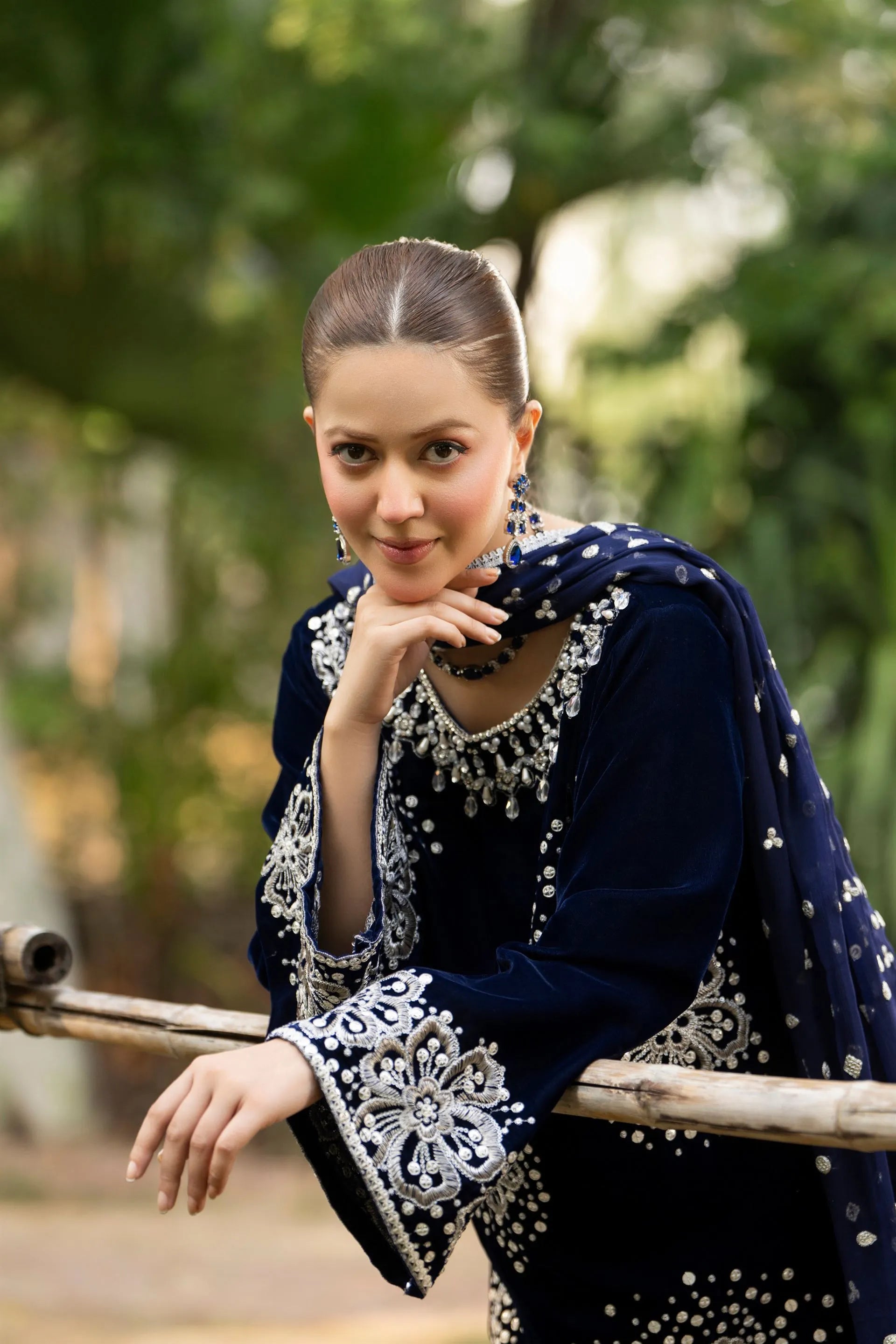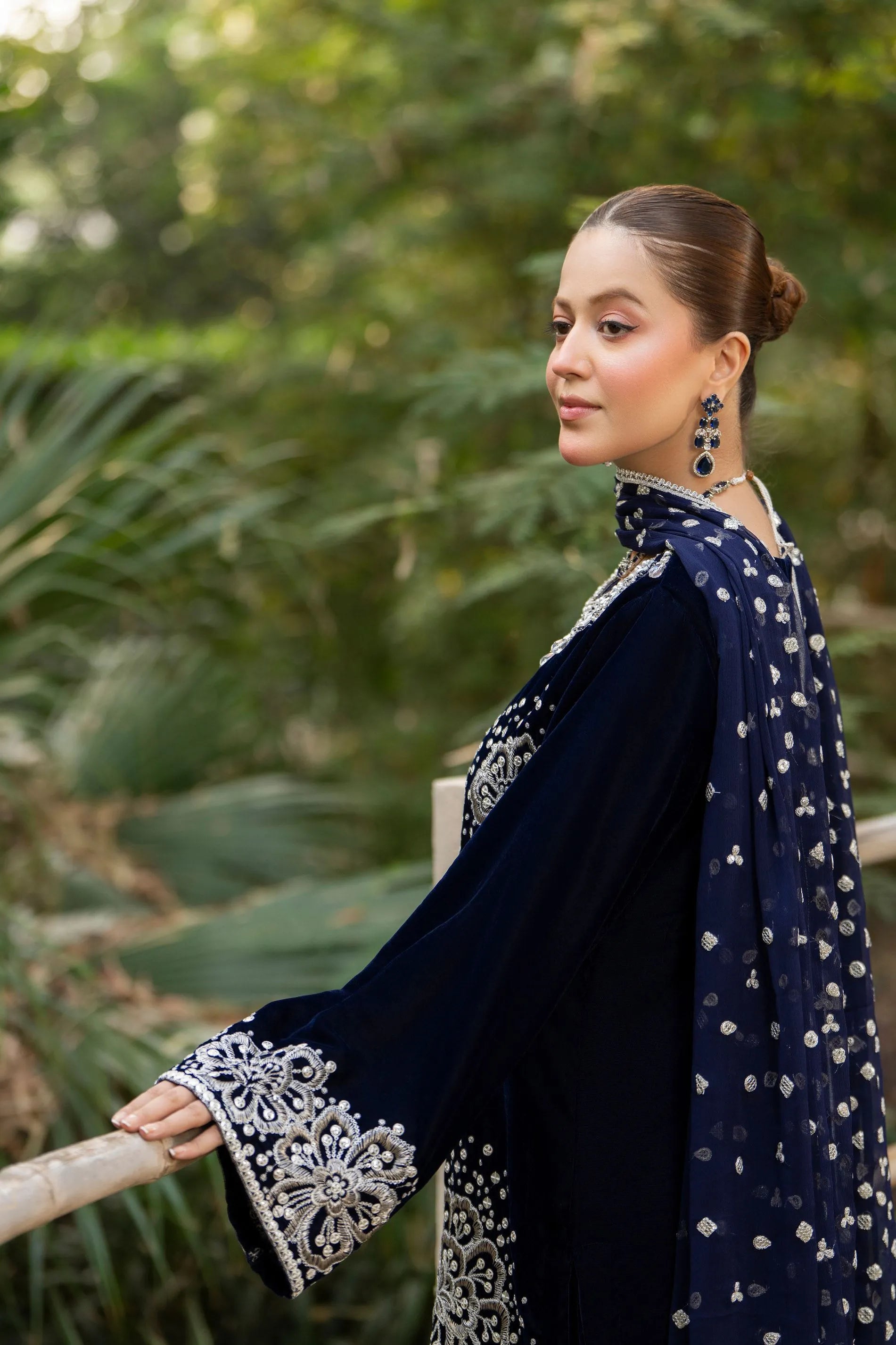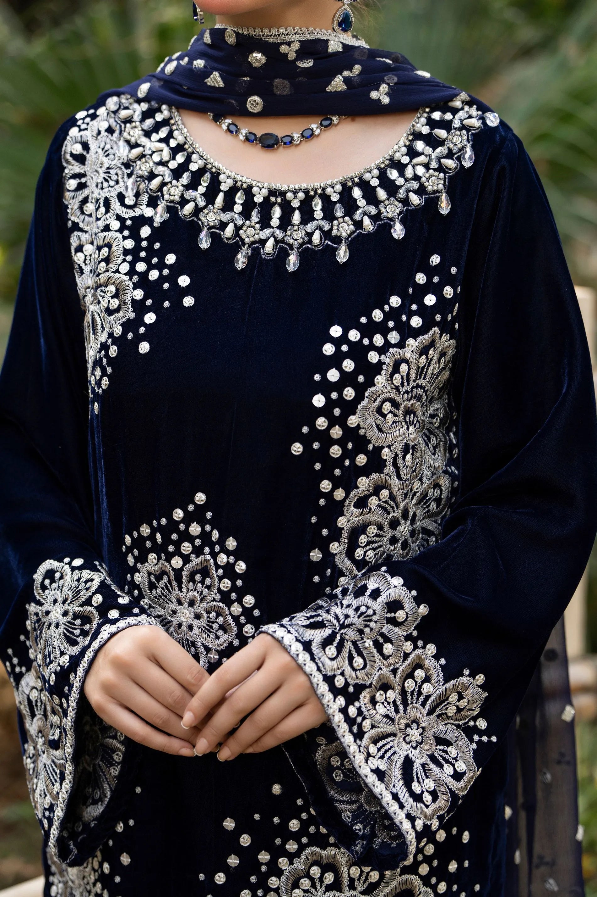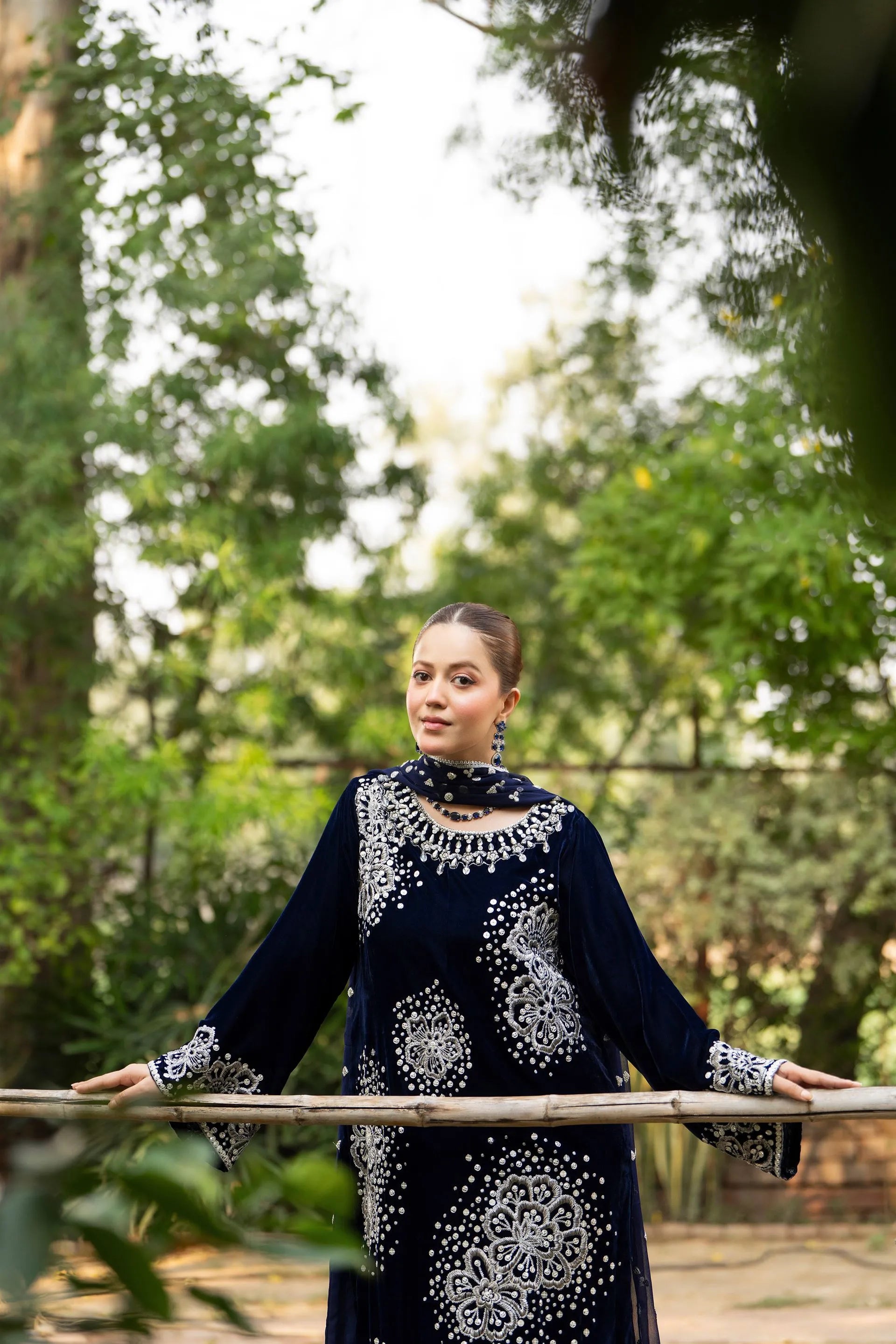 Embroidered Long Velvet Shirt with Adda Work on Neckline