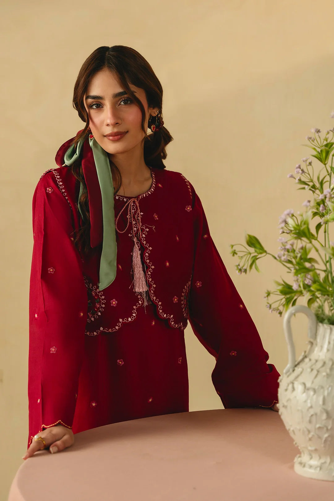 • A charming maroon two-piece ensemble featuring a short embroidered koti with scalloped edges and heart-shaped embroidery on the front and back. Paired with a long embroidered shirt with full-length sleeves and wide trousers, this outfit creates a layered and timeless look. Jacket not attached.