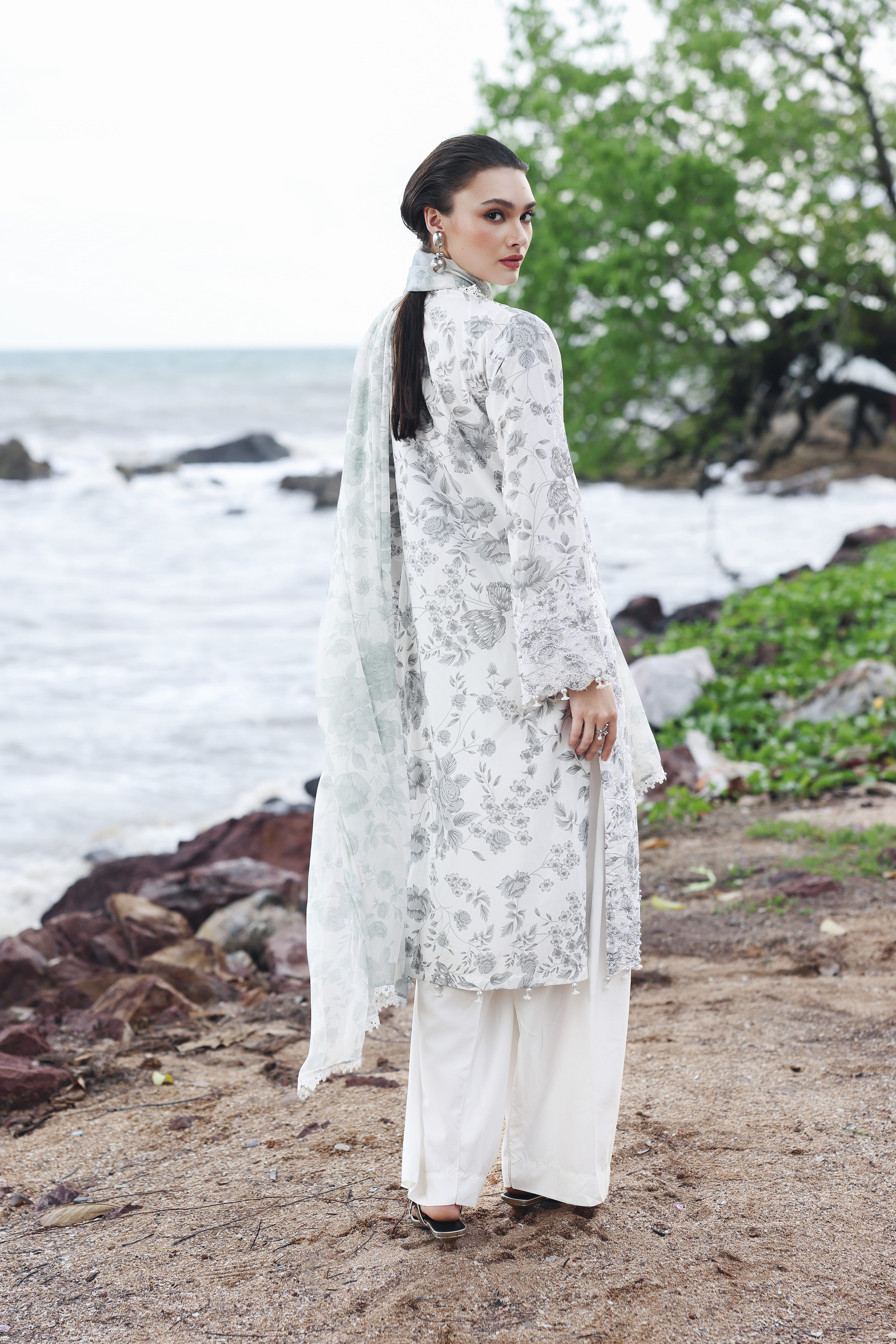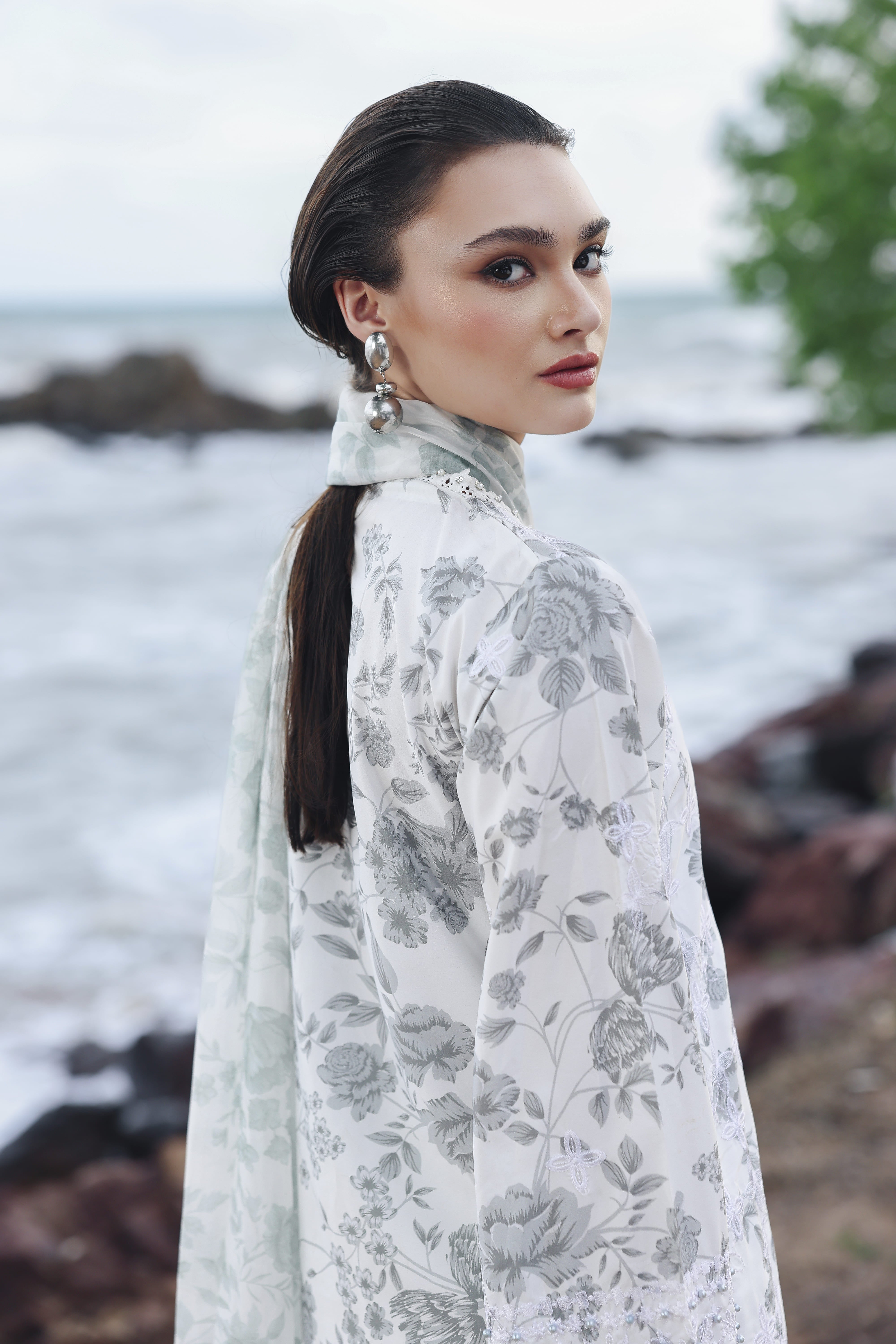 1-premium crepe silk shirt adorned with sequin embroidery, pearls, crystals, and lace detailing.