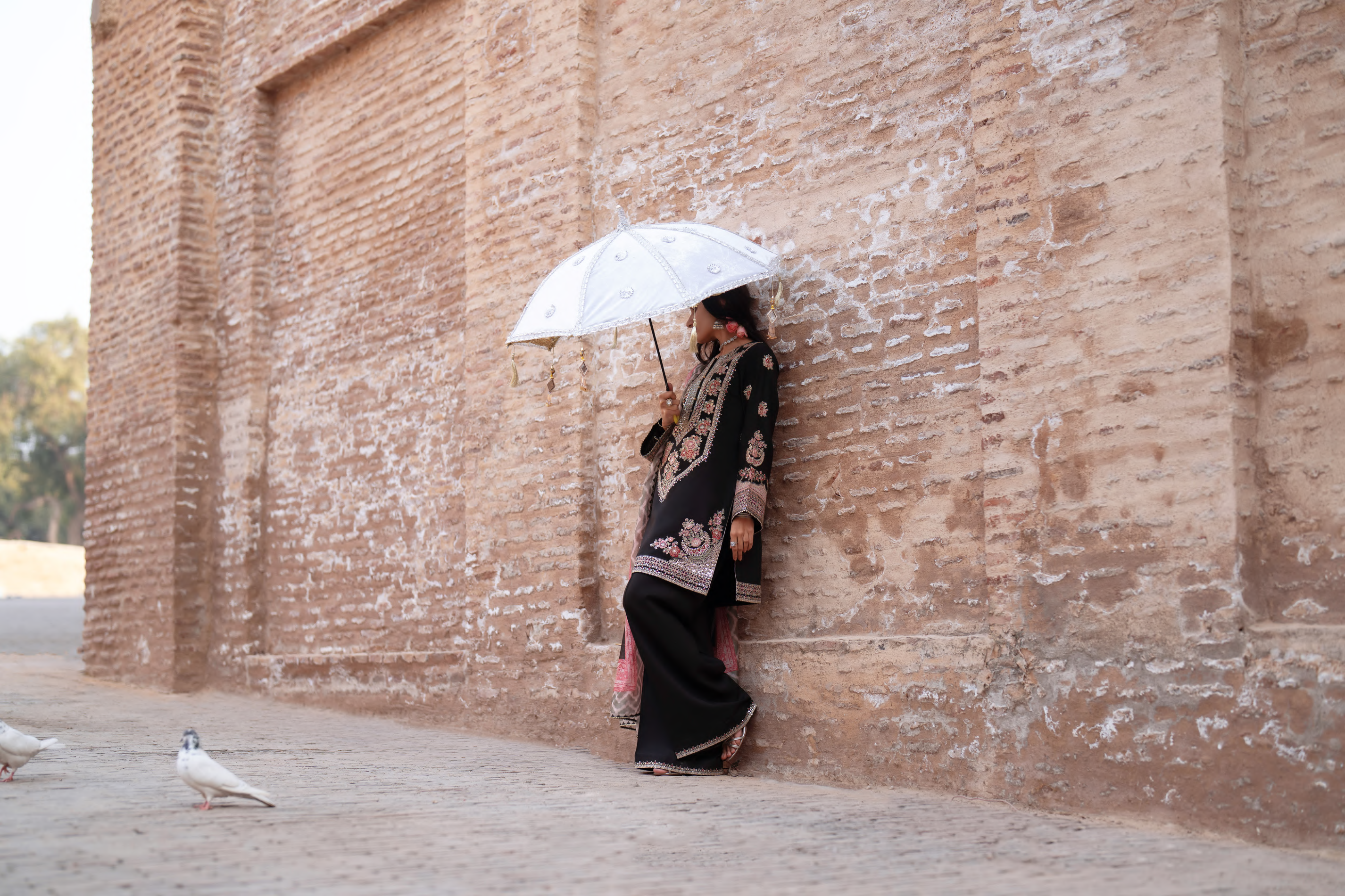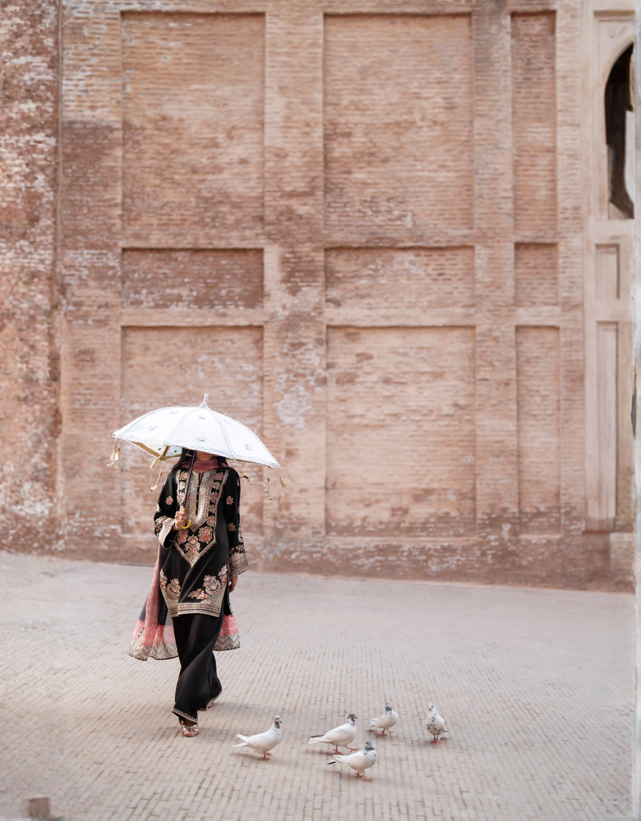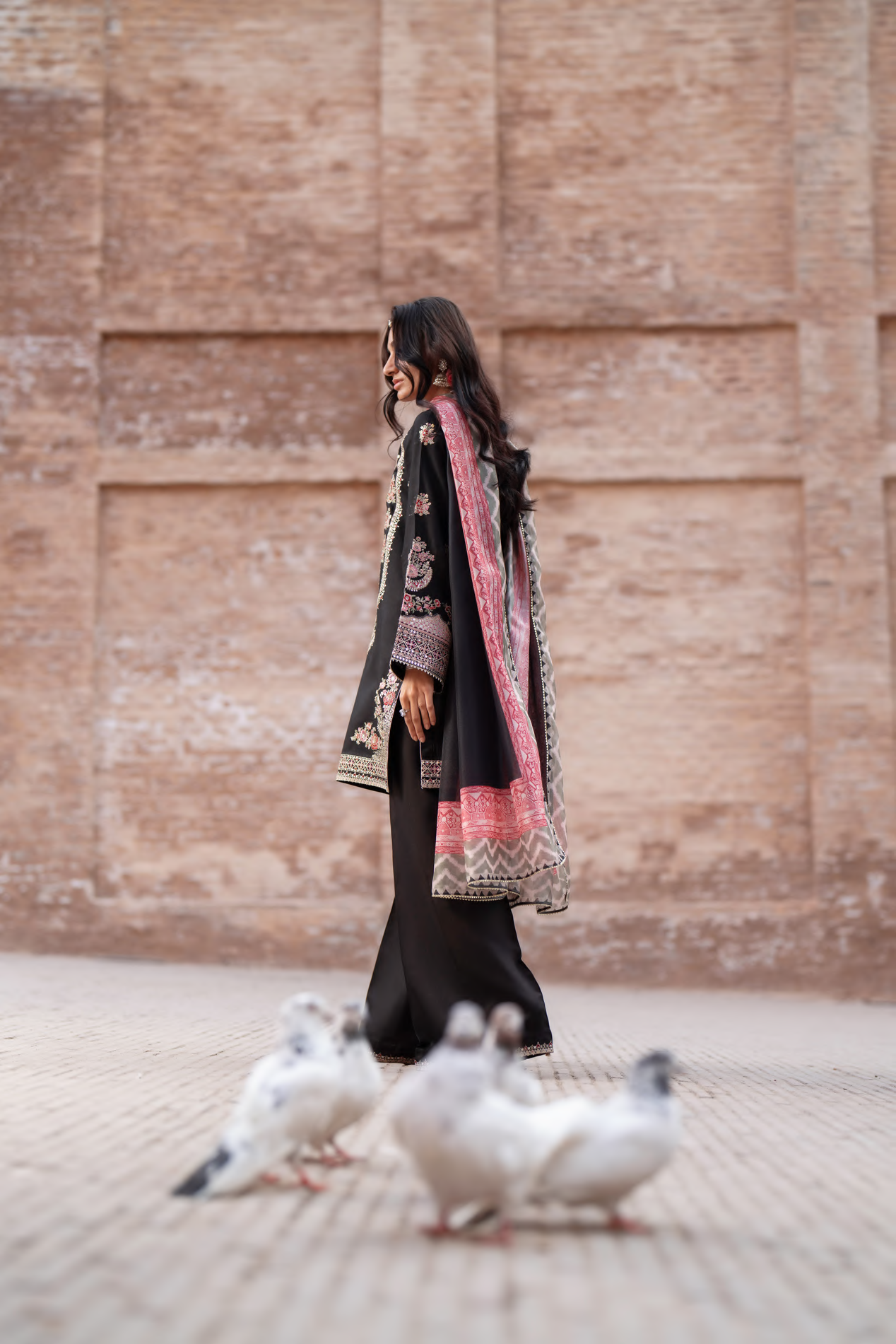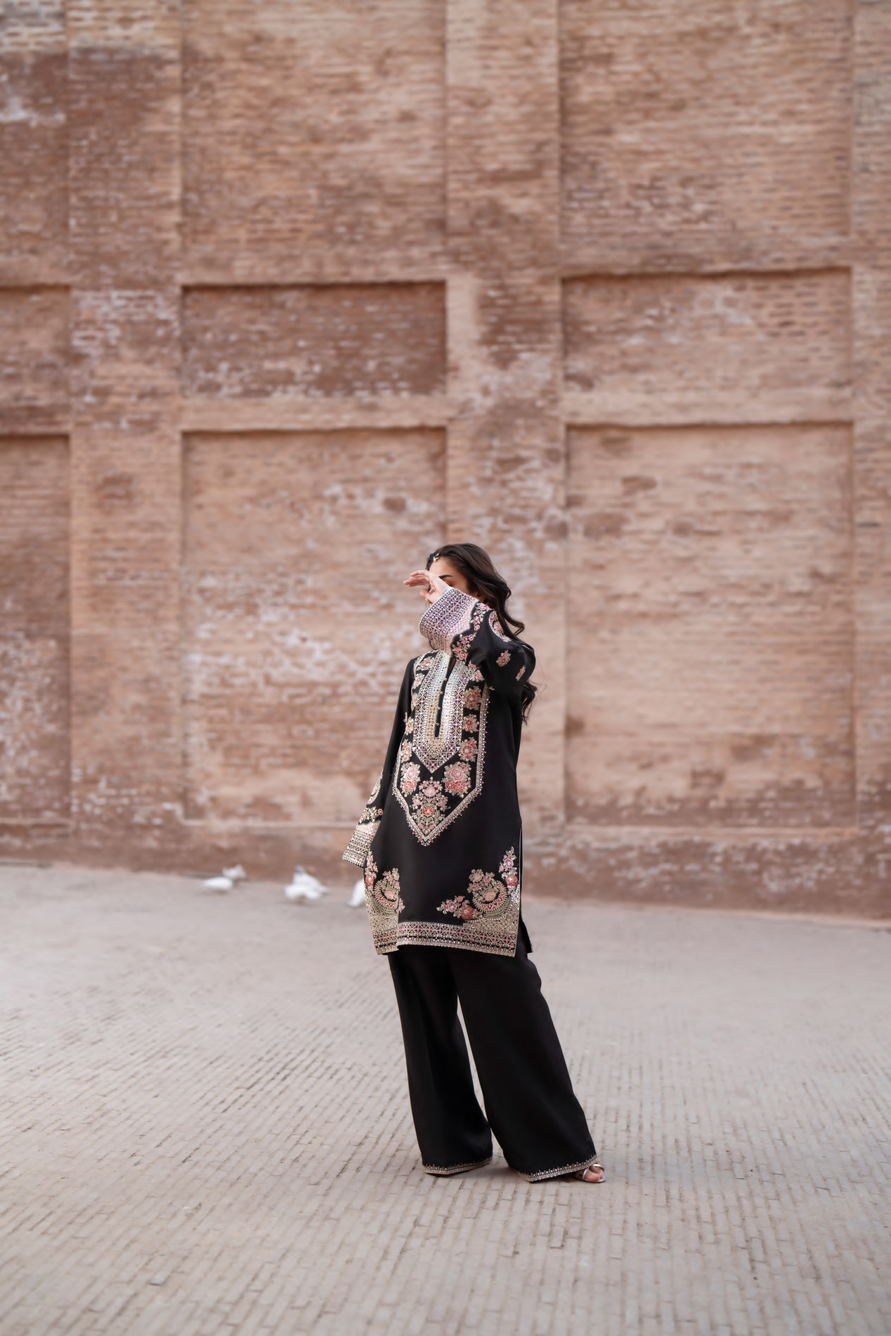 Crafted on a deep black canvas, this ensemble is elevated with intricate multicolour embroidery, featuring delicate florals and geometric detailing that create a striking contrast.