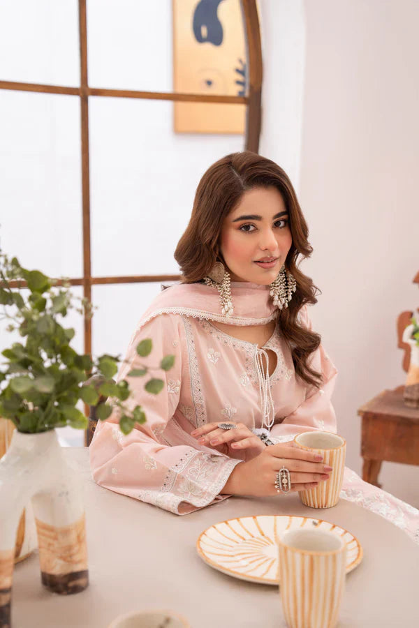 Rose Quartz fuses soft blush hues with a kurta-style shirt richly embroidered at the neckline, finished by dori and tassel accents. A Khaadi Net dupatta traced with shuttle lace drapes like petals, and a Farshi shalwar with embroidered pati brings flowing drama to every step. Wear it to cause a gentle stir at any festive gathering.