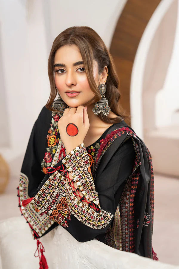 Onyx Noir channels deep nocturnal drama with multi-thread, panni, and Chikankari work on a short shirt, plus loops at the sleeves for subtle edge. A pure silk printed dupatta edged in lace falls like ink across your shoulders, while a Farshi shalwar with hand-block printing ensures flawless flow. Wear it to own the night in absolute chic.