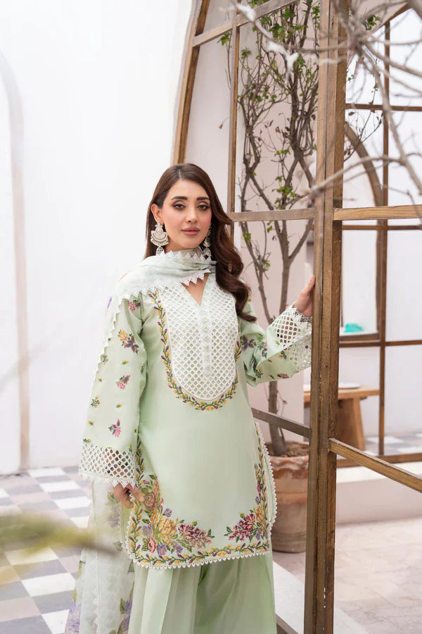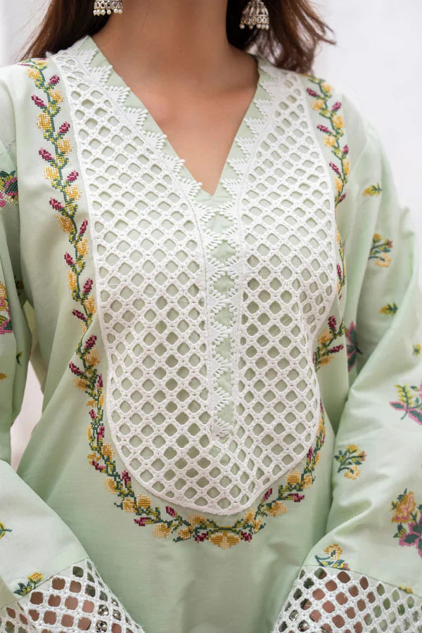 Pistachio Glow is a fresh twist on tradition with a short shirt featuring cross-stitch embroidery, a rounded border, and 3D lace at the neckline. A digital-printed Monark dupatta trimmed in milky lace floats like a summer breeze, while a Farshi shalwar—beautifully embroidered—grounds the look in effortless charm. Wear it when you want cool, contemporary flair.