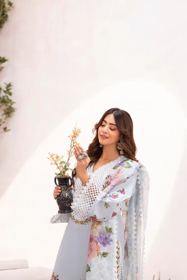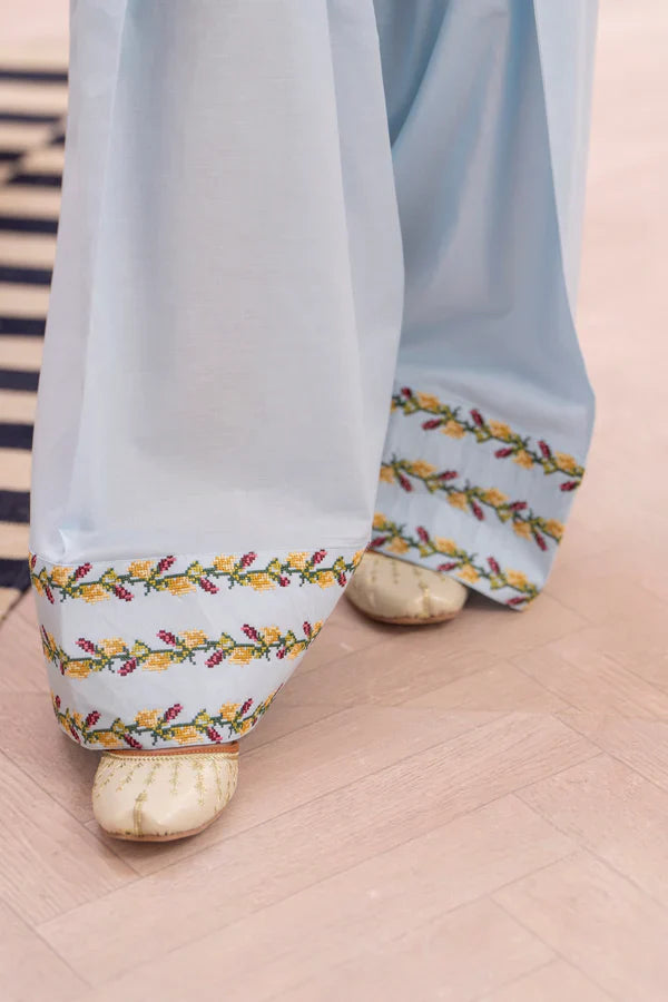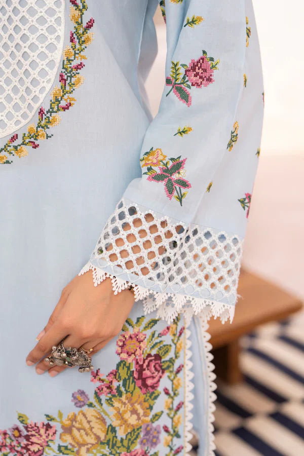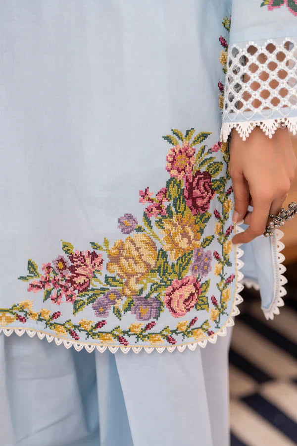 Powder Blue blends pastel ease with cross-stitch motifs and 3D lace edging along its short shirt silhouette. A digital-printed Monark dupatta trimmed in milky lace drapes like early morning skies, while a Farshi shalwar with elegant embroidery adds flow and finesse. Perfect for garden receptions or cultural brunches.