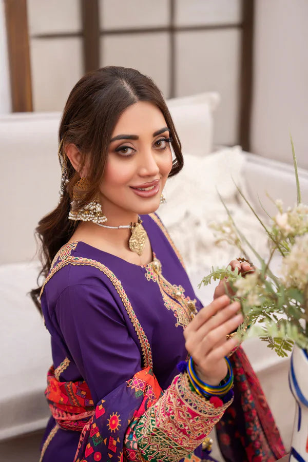 Amethyst Mist shimmers in dusky purple with multi embroidery, dori, and gotta work paired with contrasting patch accents on the sleeves. A pure silk printed traditional dupatta with all-over gotta adds regal flair, while a Farshi shalwar with embroidery flows like a morning haze. Perfect for ceremonies where drama is understated.